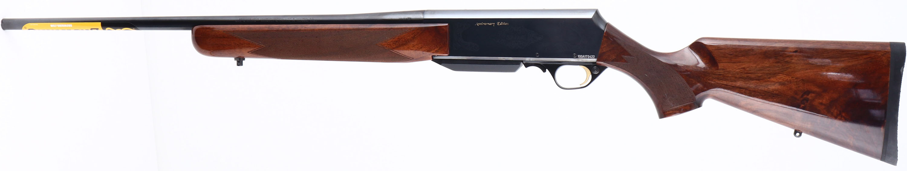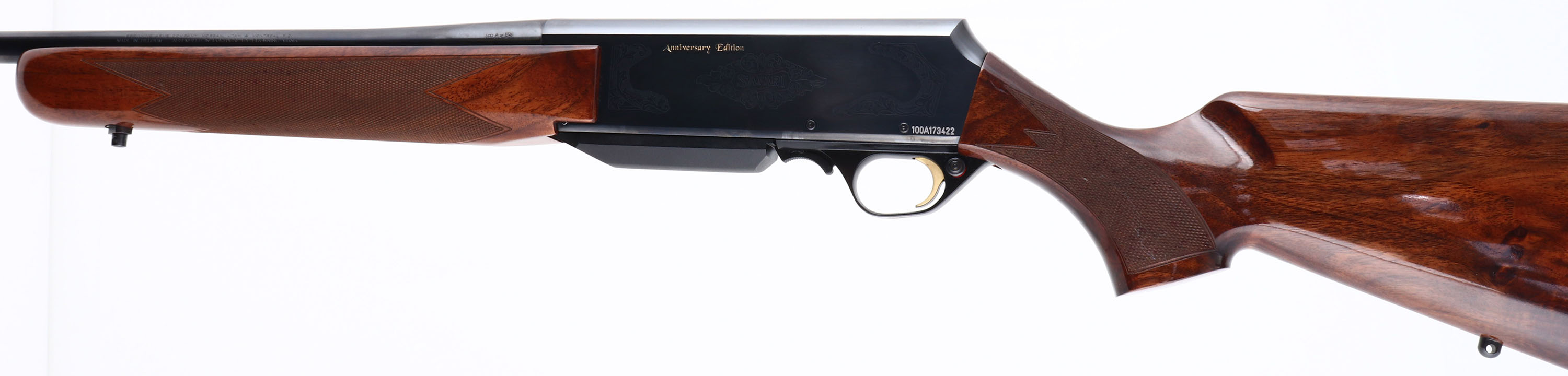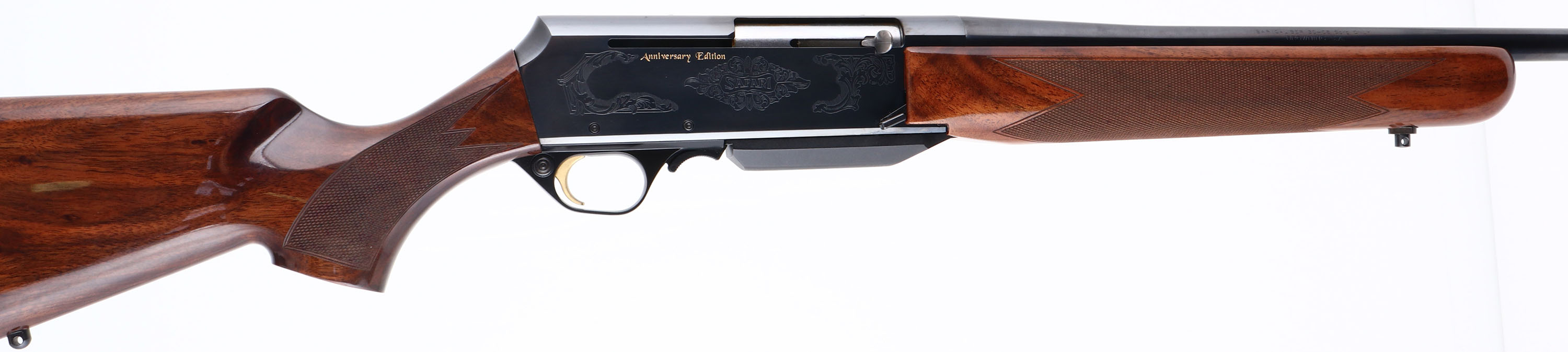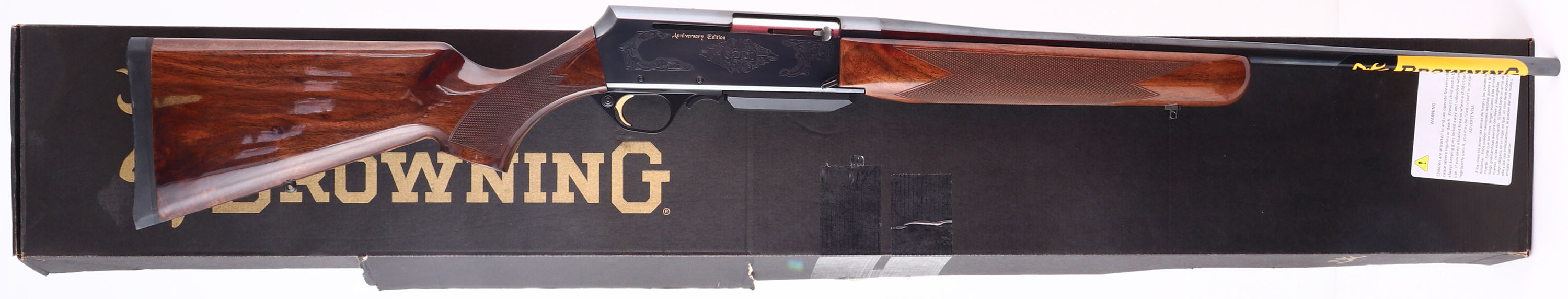 BOXED, Browning, BAR Safari Anniversary Edition, CAL: 30-06, MFG: 2017, SN: 100A173422, Semi Auto Rifle, 22'' Barrel. This is a Limited edition new in box old stock rifle consigned by the original purchaser, that has remained in the original box & was never fired outside the factory test. The original Select Grade 3 checkered & flat pistol grip wood stocks, with high gloss finish, are excellent, basically mint. The metal blue finishes rate 99%+. The receiver has scroll engraving around ''SAFARI'' & gold lettered ''Anniversary Edition'' on both sides. Barrel carries no open sight provisions, while the receiver is factory drilled & tapped for future scope mounting. Barrel still carries the browning marketing sticker. Buttstock carries a factory Browning solid recoil pad. Factory sling studs. Comes in original box, with owners manuals, lock & original packaging. A limited production NIB rifle & a high quality collectible. FFL Req. - Value: 1500 to 2000