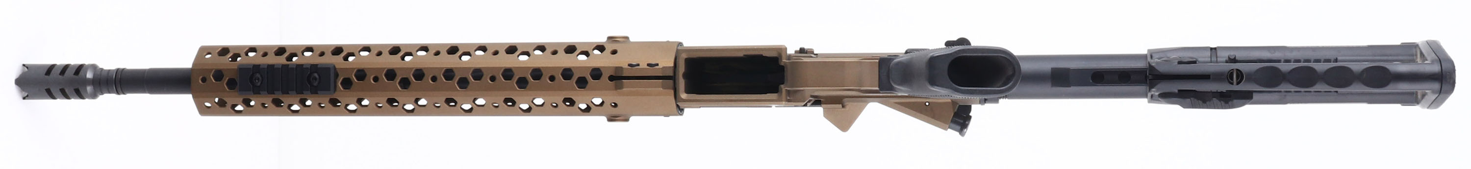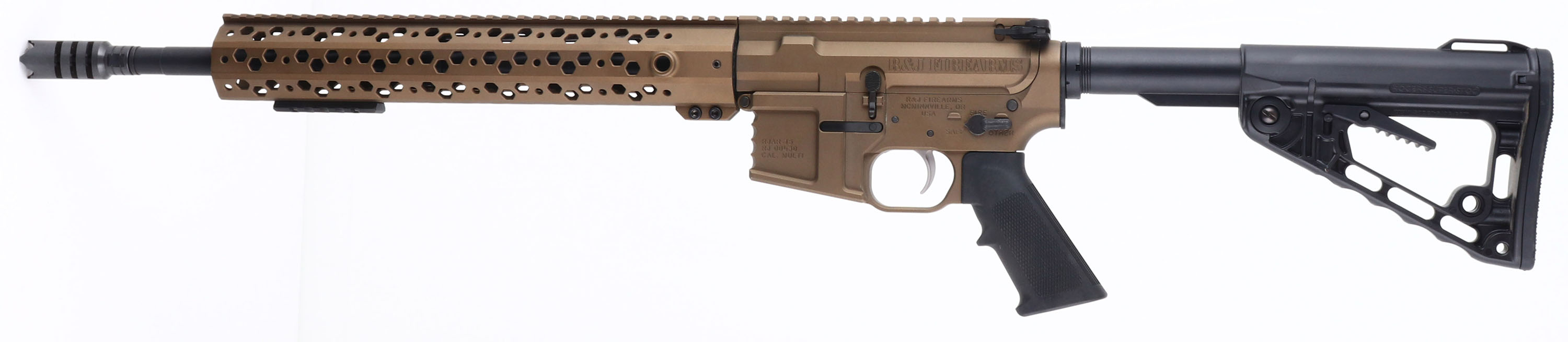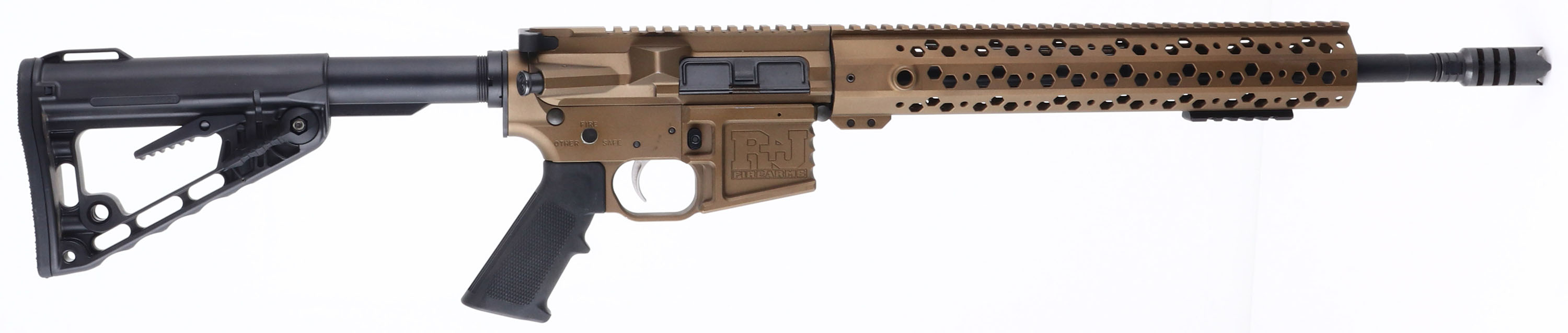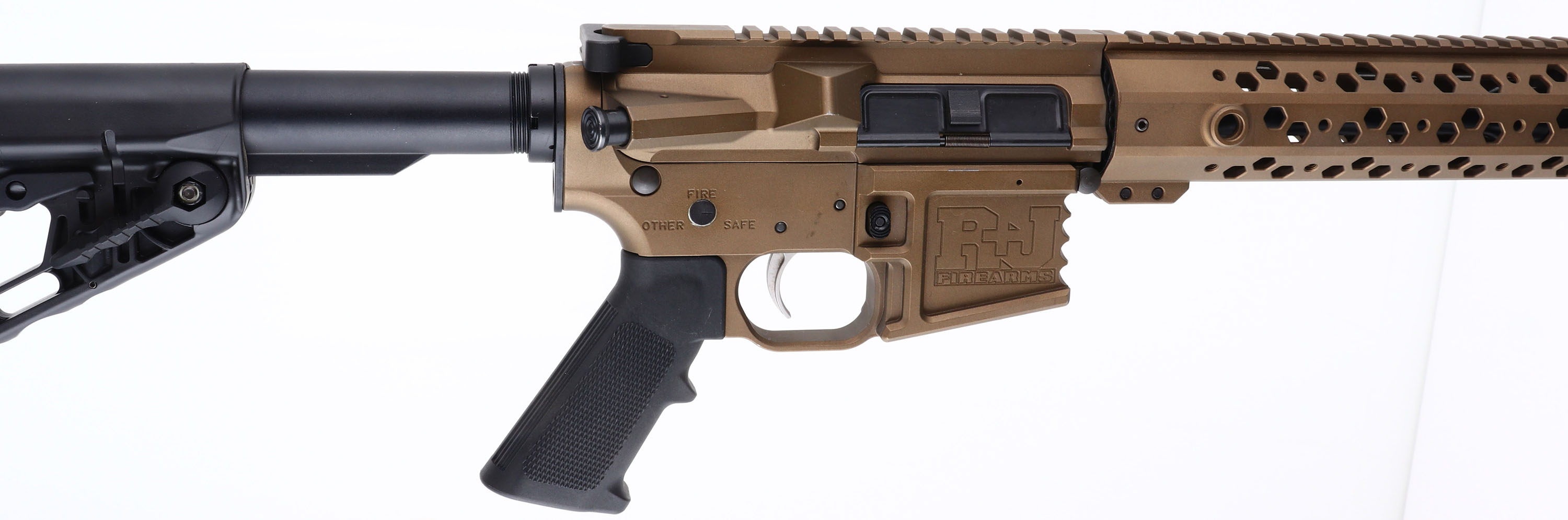 NEW R&J Firearms Model AR-15 PREMIUM, CAL: 5.56 (.223), MFG: Modern, SN: RJ00430, Semi Auto Rifle, 16'' R&J Custom Ballistic Advantage barrel, with 1:7 twist, 18'' with R&J' s exclusive Crown brake flash suppressor. Metal alloy billet upper & lower. Nitride M16 carrier group. Premium Bronze baked Cerakote finish. Factory 20'' picatinny rail runs full length top of receiver & 13'' Devil Dog octagon handrail, for future sight, scope & accessory installation. Additional 2 1/2'' picatinny rail on the bottom of handrail. Premium Rodgers slide adjustable, 6pt lock in place super-stock. Mint Bore. Condition is FACTORY NEW & ready for your customization. Comes with factory 30 rd magazine, lock & paperwork. FFL Req. - Value: 1400 to 2000