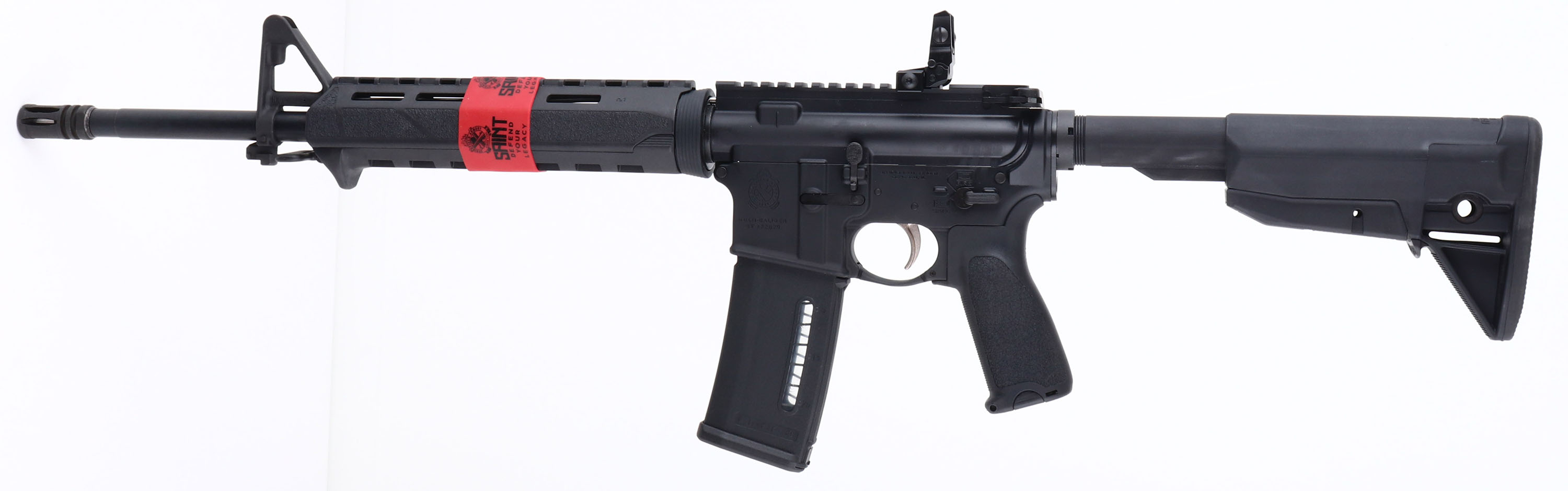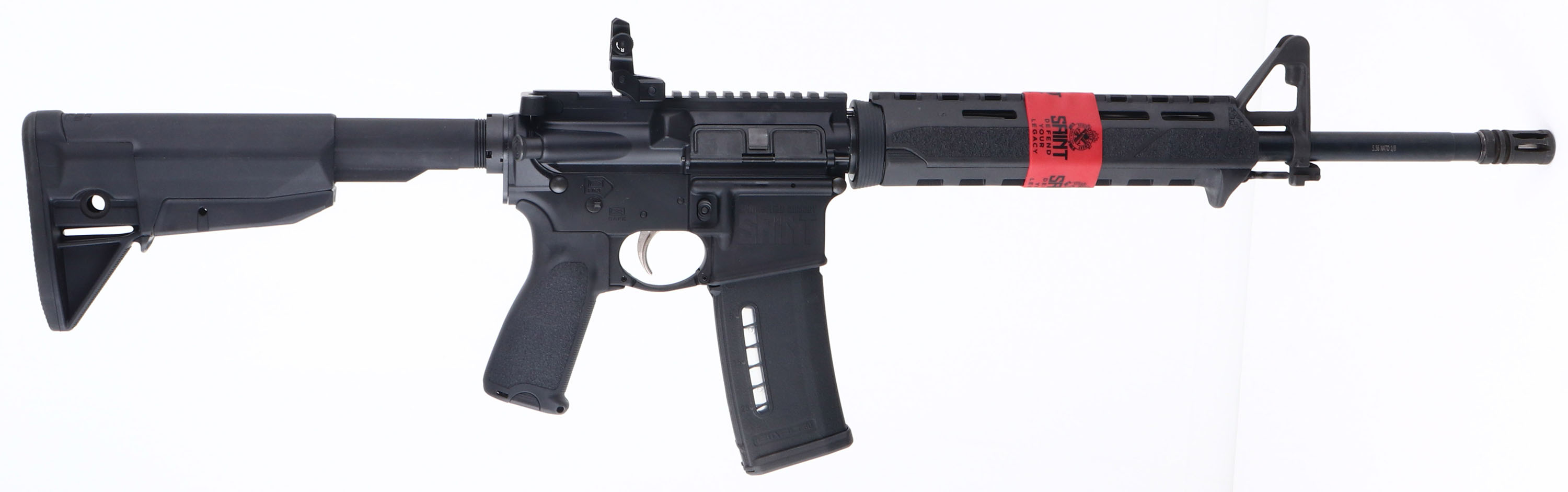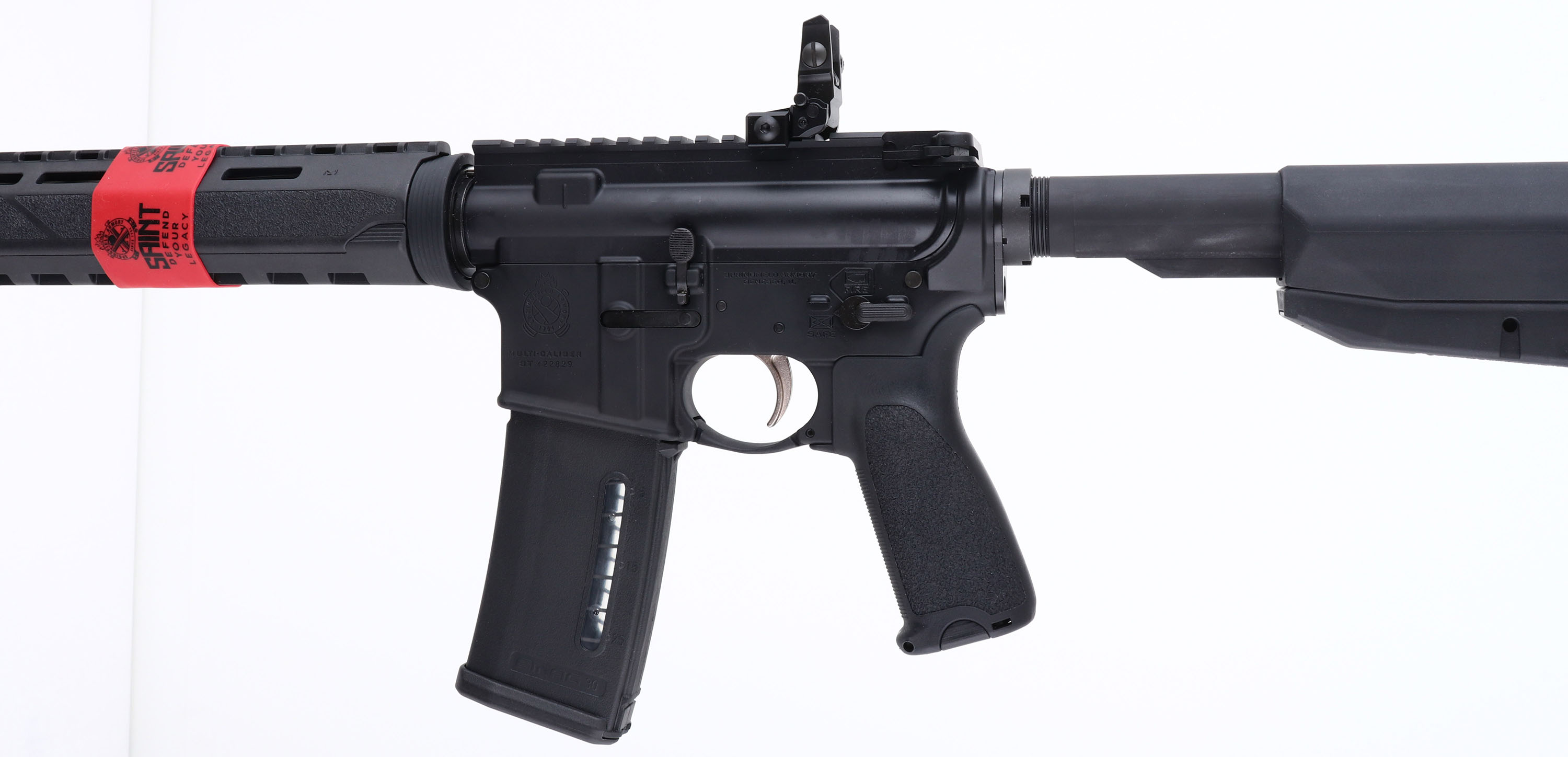 NEW, Springfield Armory, Model ''Saint'', CAL: 5.56, MFG: Modern, SN: 422829, Semi Auto Rifle, 18'' barrel. The multi-point adjustable stock, textured pistol grip & forend are excellent. The factory matte black finish rates 99%+. Bore is excellent. The receiver holds a flip-up dual folding disc rear peep sight & the barrel holds a tall winged blade front sight. Comes with factory SPA Saint red forend band. No box. NOS. FFL Req. - Value: 700 to 1200