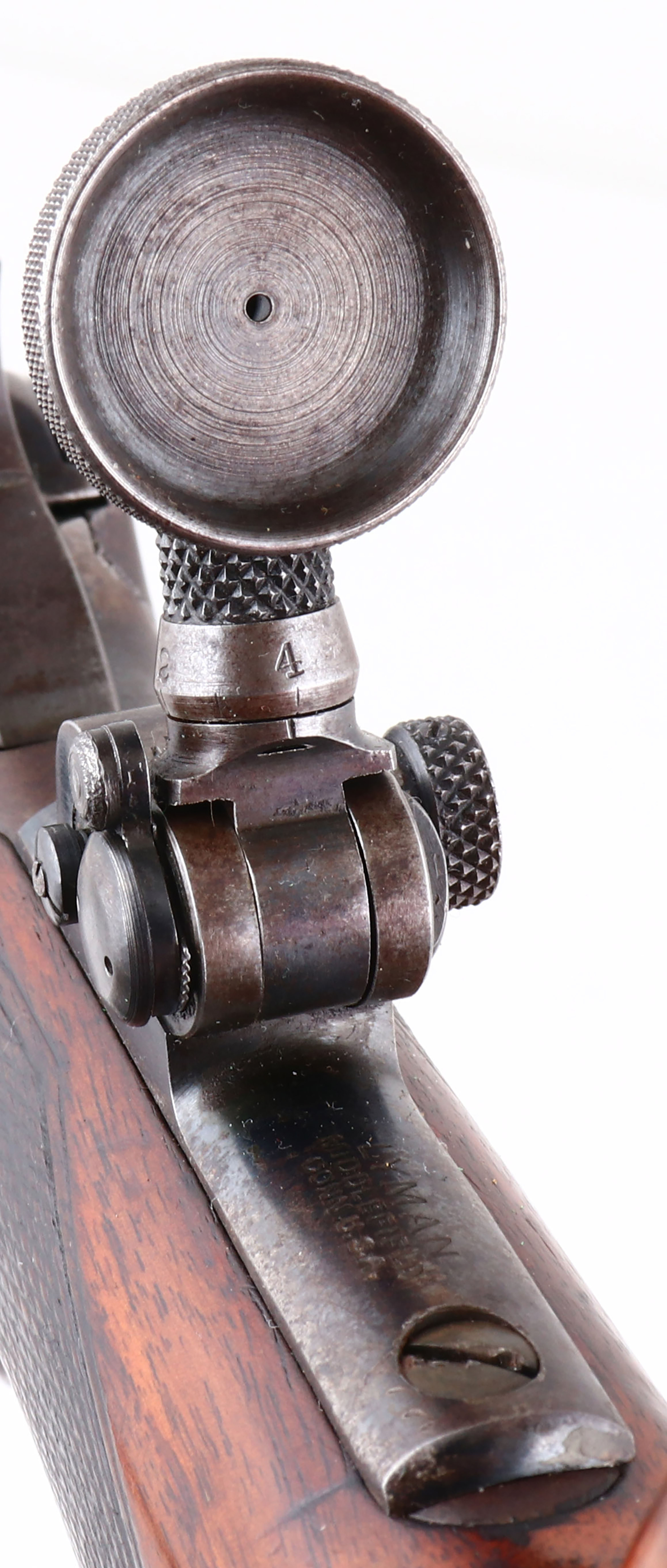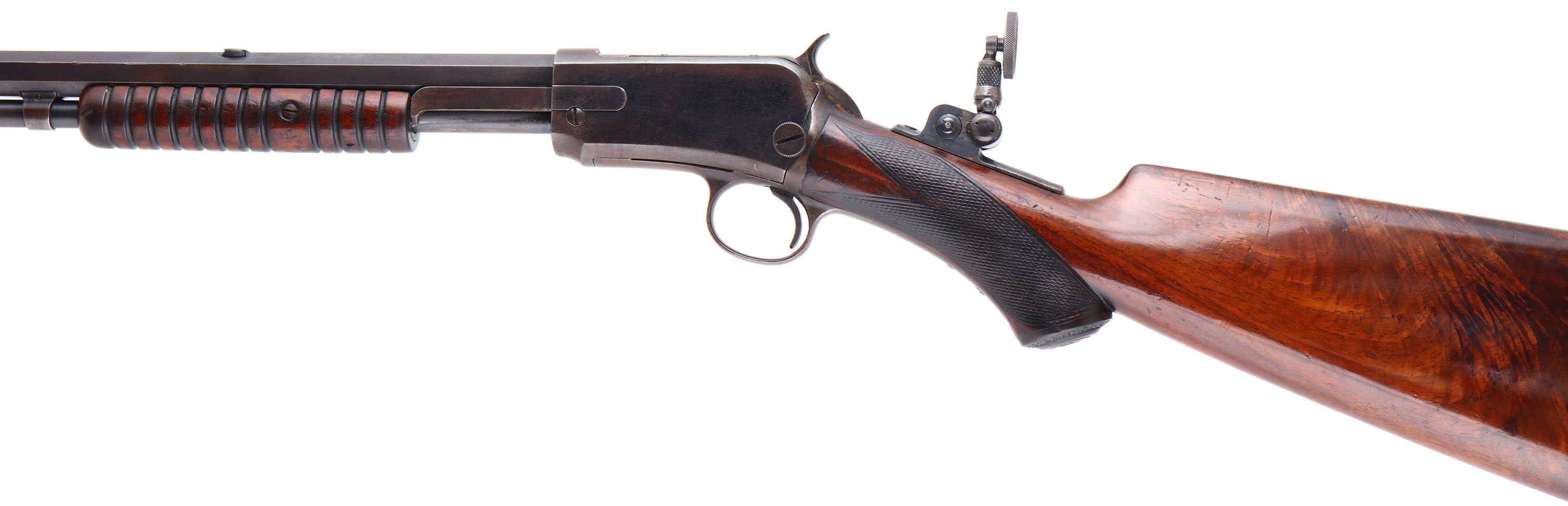 RARE DELUXE Winchester, Model 1890 2nd variation, .22 WRF Cal., MFG. 1907, SN: 330944, Pump Action Rifle, 24'' Octagonal barrel. The original, deluxe checkered & capped pistol grip wood stocks are excellent, with wonderful scalloped & feathered grain. The original finish is very good, thinning & flaking at the carry points. The checkering has rounded point from use & there are minor scuffs, scratches & contusions. The original blue finish is toning to a brown patina as it thins, with coverage on the receiver at 70%, 80% on barrel & mag, with brighter blue remnants in the protected areas around the sights. Barrel has a few nicks or edge abrasions. The rifle is fitted with a Lyman 103 windage tang sight, with large aperture disk. Barrel carries a Marbles blank filled rear dovetail & a Lyman No. 5B combination globe sight, with white bead. The bore is very good, but with spots of roughness amongst strong rifling. Crescent metal buttplate. Tight smooth action. A fantastic deluxe rifle in original & highly collectible condition.* FFL or C&R Req. - Value: 3000 to 6000