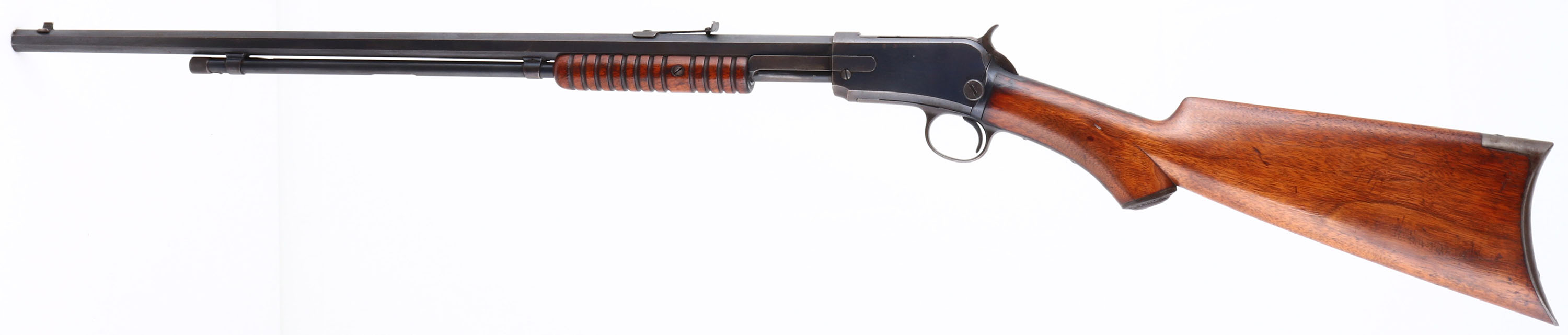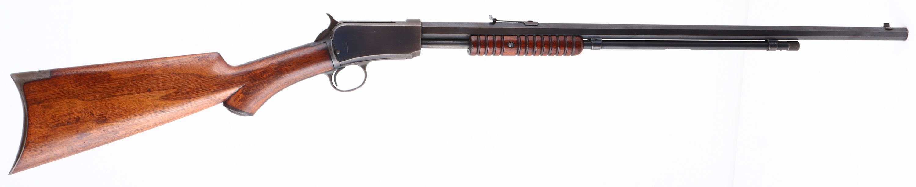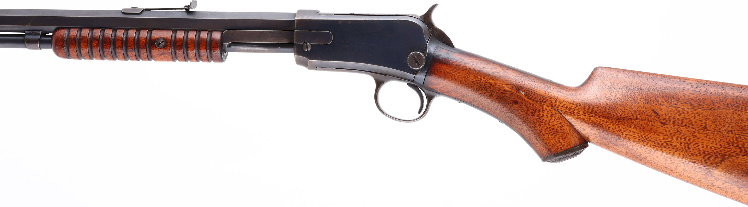 Winchester, Model 1890, 2nd variation, .22 WRF, Cal., MFG. 1903, SN: 177507, Pump Action Rifle, 24'' Octagon barrel. Special ordered WRF rifle, with letter confirmed ''Plain, Pistol grip stock''. The very unusual, non-checkered, capped pistol grip wood stocks are excellent, with very good original finish thinning at the carry points. There are minor handling marks, thin scratches & dings. The metal blue finish has 75% coverage of thinning & toning gray/brown finish. The rifle is fitted with standard adjustable rear & small blade front sights. Bore is good, with areas of pitting & roughness amongst strong rifling. Crescent metal buttplate. Smooth tight action. This is a rare & unusually configured collectible 1890 rifle.* FFL or C&R Req. - Value: 3000 to 4500