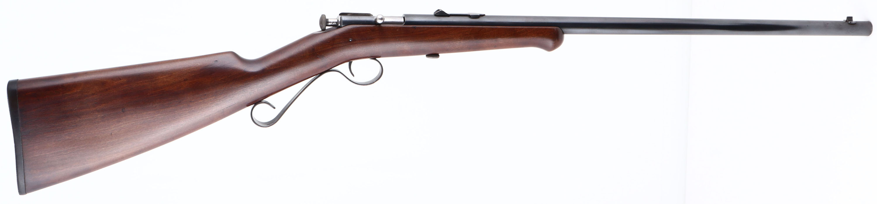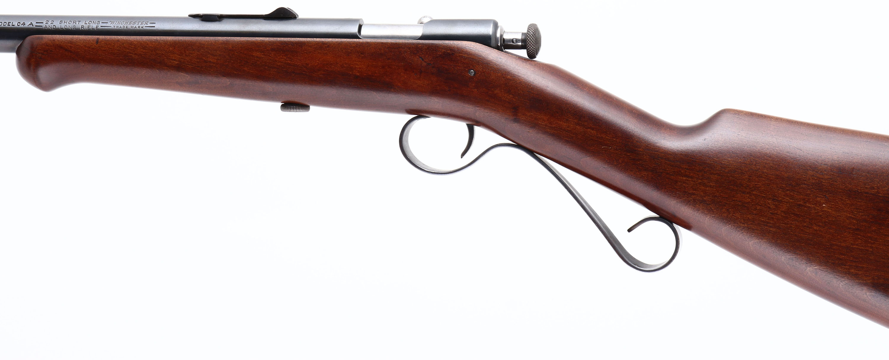 Winchester, Model 04A (1904), CAL: 22 S.L.LR, MFG: 1904-31, SN: NSN, Bolt Action Rifle, 21'' barrel. This rifle has been professionally restored to like factory condition. The original straight grip wood stock, with schnabel forend is excellent, with very few remnants of minor handling marks or contusions. The wood finish is excellent. The restored metal blue finish rates 95% overall. Bore is excellent & bright. The barrel holds an elevation adjustable rear sight & blade front sight. Stock carries a Winchester, checkered black plastic buttplate. Extended ''S'' shaped trigger guard. An excellent appearing example. FFL or C&R Req. - Value: 200 to 400