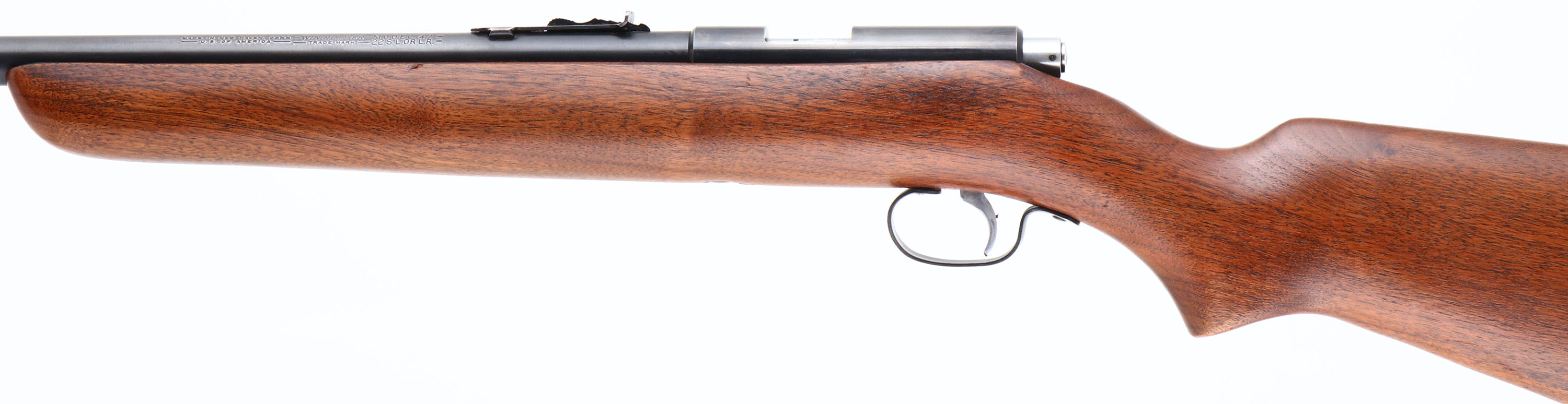 RARE Winchester, Model 47, .22 S. L. LR. Cal., MFG. 1948-54 SN: NSN, Bolt Action Rifle, 25'' barrel, The original flat pistol grip wood stock is excellent & solid, with the slanted back forend tip. There are very few tiny contusions & scuffs to the original finish. The factory metal blue finish on barrel & trigger guard remains at 95%, with loss due to a couple areas of depth thinning rather than coverage loss. Nickel tone bolt handle, bolt & trigger. The bore is excellent. Mounted with adjustable rear sight & standard front sight. Winchester plastic buttplate. Low production model at approx. 43,000 mfg. These are fairly rare rifles & especially when in this high original condition. FFL or C&R Req. - Value: 500 to 1000