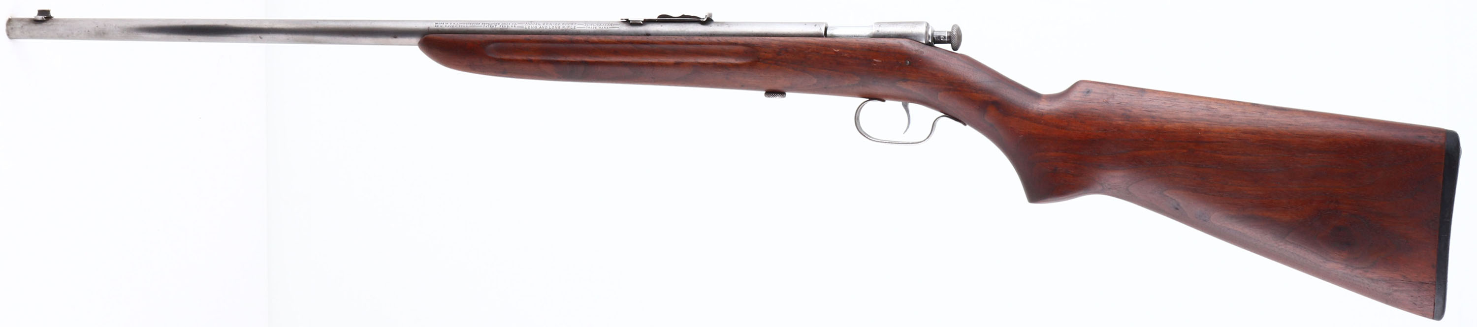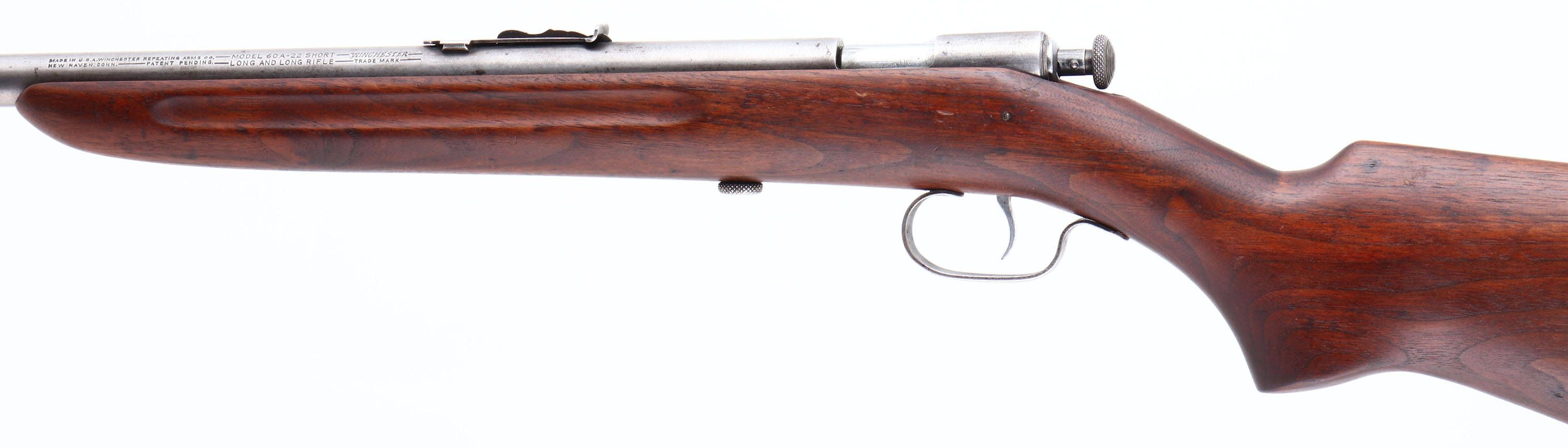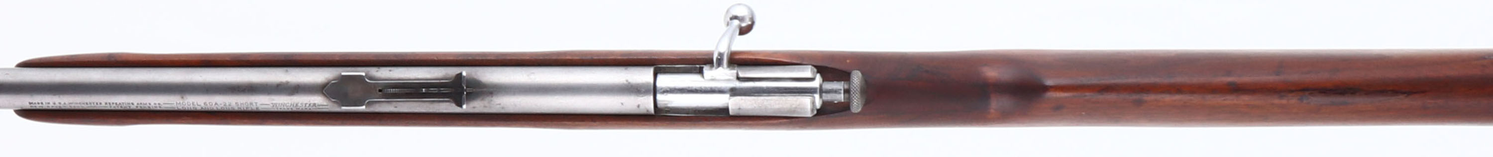Winchester, Model 60A, Early Variation, CAL: 22 S.L.LR, MFG: 1933-39, SN: NSN, Bolt Action Rifle, Early 23'' barrel, with flat muzzle. Rendered ''safe'' by pulling the chocking piece back & turning it clockwise. An improved Model 60, which was an improvement on the model 59, This model was produced only 6 years, with only 6113 produced. The refinished, flat pistol grip wood stock, with finger groove forend is good, with an inlaid repair at the top of the wrist, also one along the bottom of the pistol grip & a 2'' long fill repair on the top of the comb. All were very professionally executed & are actually hard to notice after the light sanding & refinish which was likely done at the same time. Very nice overall appearance to the wood. The metal finish has fully worn to gun metal grey. Bore is bight with excellent rifling, but with a ring right at the muzzle. The barrel holds an adjustable rear sight & blade front sight. Nickeled trigger. Exposed take-down screw. Stock carries a worn Winchester checkered buttplate. FFL or C&R Req. - Value: 100 to 300