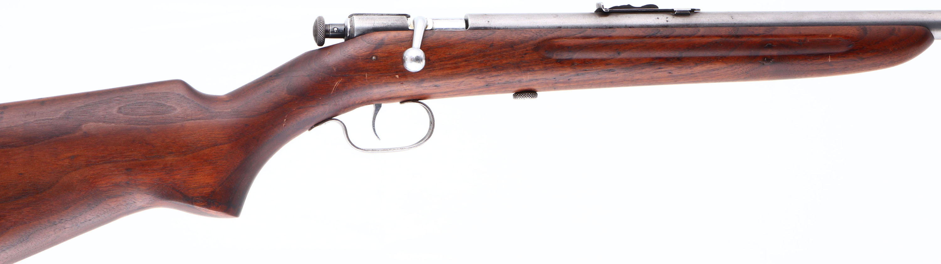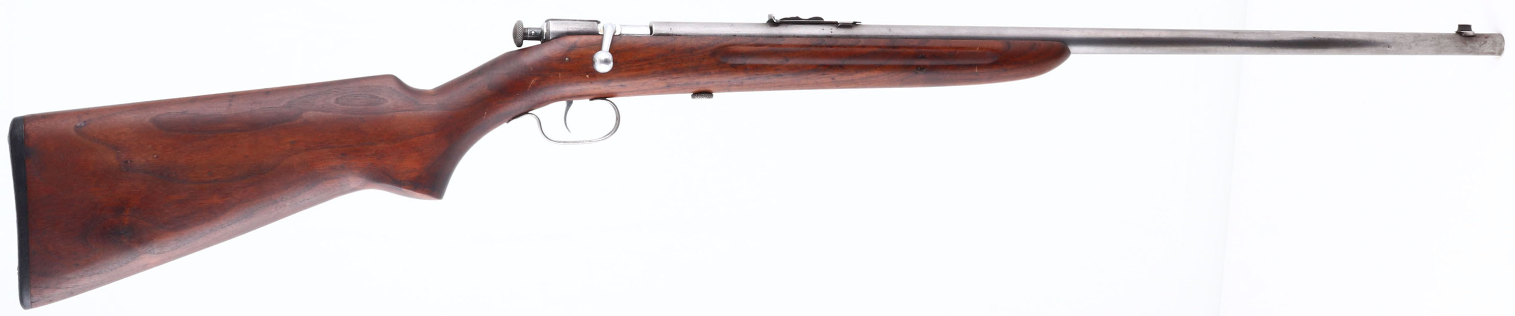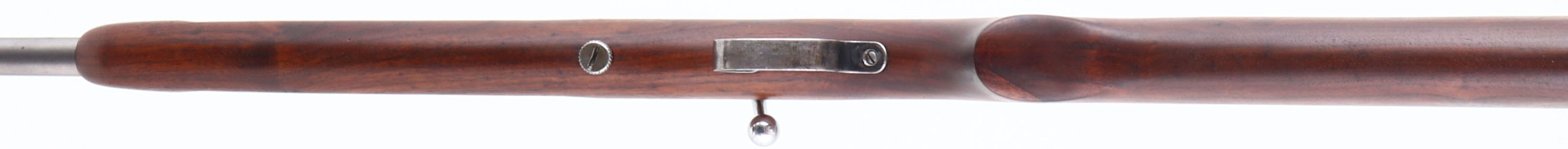 Winchester, Model 60A, Early Variation, CAL: 22 S.L.LR, MFG: 1933-39, SN: NSN, Bolt Action Rifle, Early 23'' barrel, with flat muzzle. Rendered ''safe'' by pulling the chocking piece back & turning it clockwise. An improved Model 60, which was an improvement on the model 59, This model was produced only 6 years, with only 6113 produced. The refinished, flat pistol grip wood stock, with finger groove forend is good, with an inlaid repair at the top of the wrist, also one along the bottom of the pistol grip & a 2'' long fill repair on the top of the comb. All were very professionally executed & are actually hard to notice after the light sanding & refinish which was likely done at the same time. Very nice overall appearance to the wood. The metal finish has fully worn to gun metal grey. Bore is bight with excellent rifling, but with a ring right at the muzzle. The barrel holds an adjustable rear sight & blade front sight. Nickeled trigger. Exposed take-down screw. Stock carries a worn Winchester checkered buttplate. FFL or C&R Req. - Value: 100 to 300