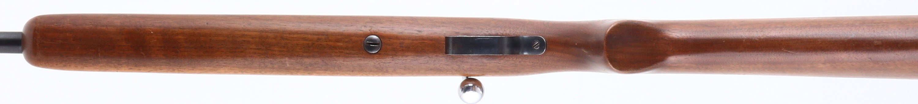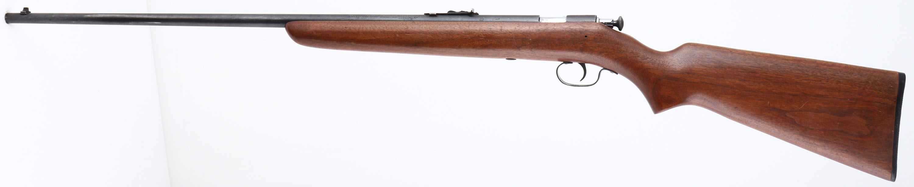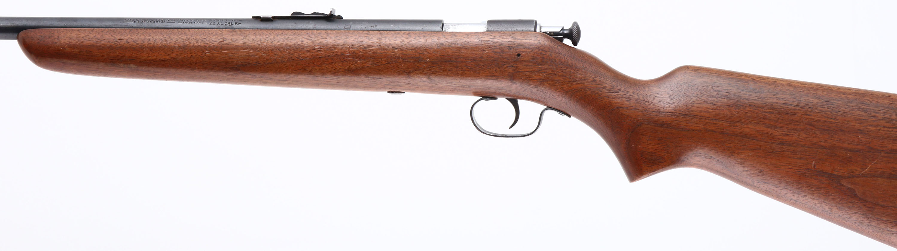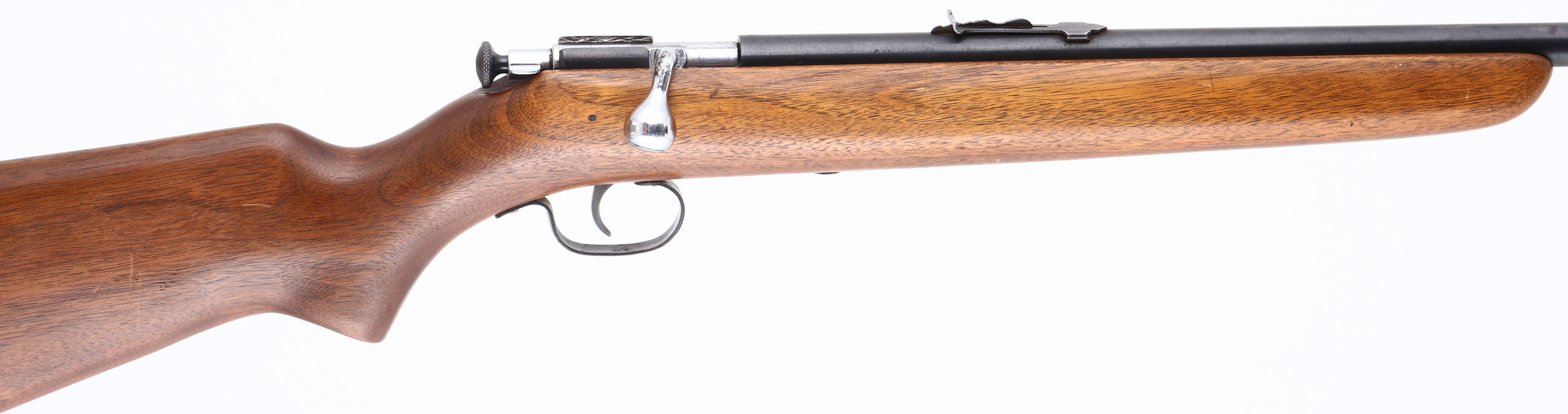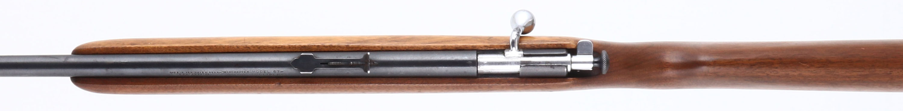Winchester, Model 67, CAL: 22 S,L,LR, MFG: 1934-63, SN: NONE, Bolt Action Rifle, 27'' Barrel. This is a late 2nd issue as it has the later tapered/slant forearm tip, blued trigger & flush take-down screw. The original flat pistol grip wood stock is very good, with scrapes, light scratches & thinning of the original finish. The original metal blue finish rates 90% overall. Bore is excellent. The barrel holds an adjustable rear sight & blade front sight. Winchester checkered buttplate. FFL or C&R Req. - Value: 150 to 350