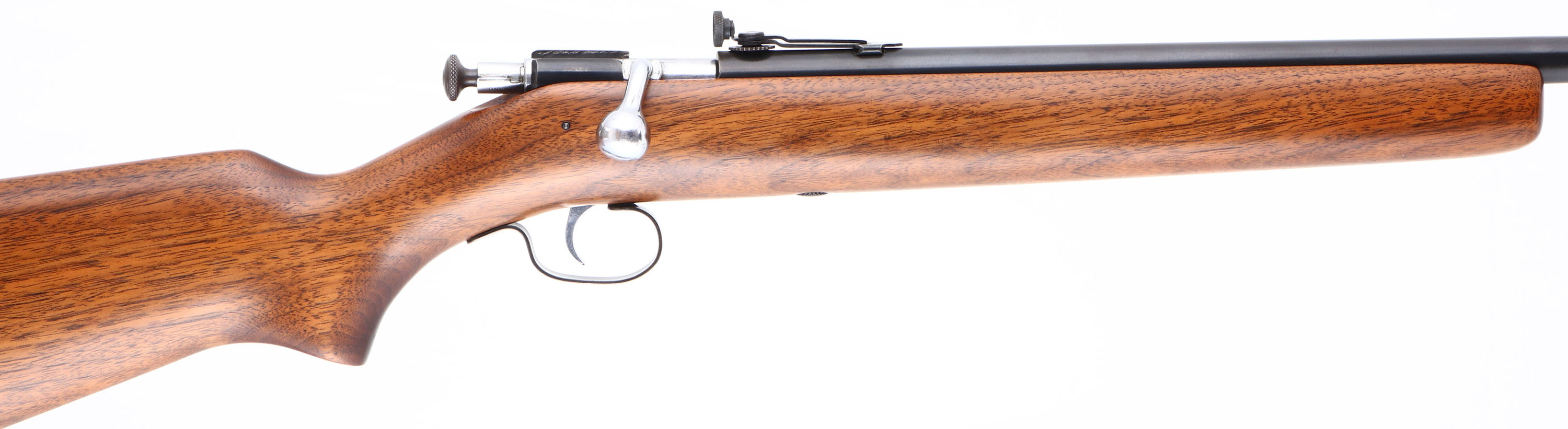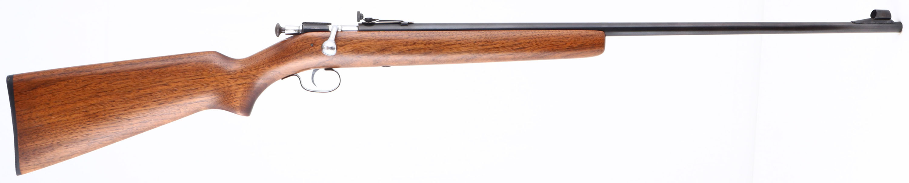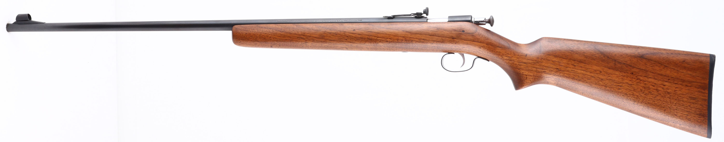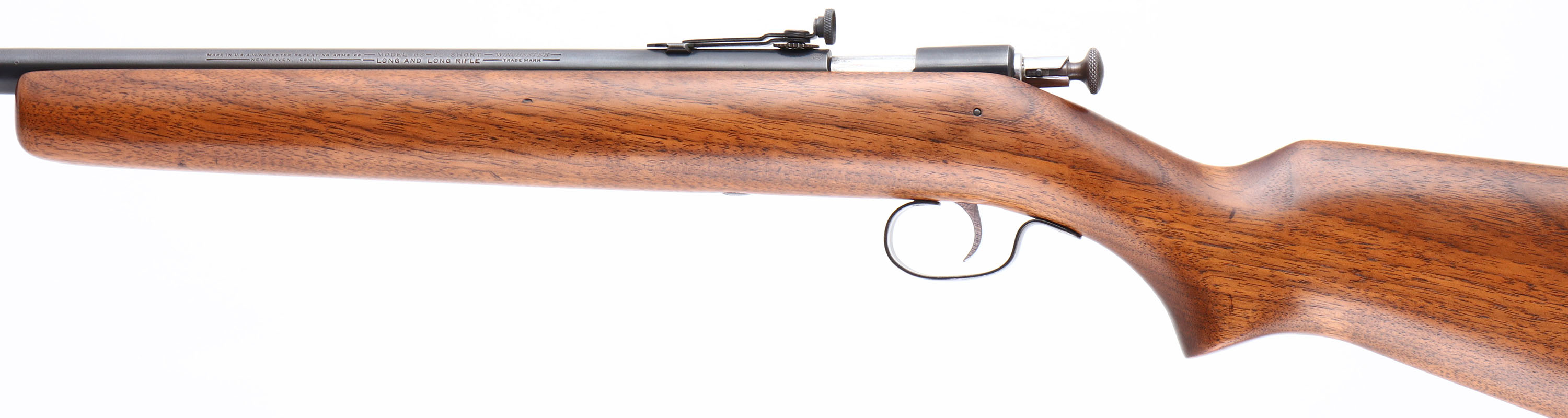Winchester, Model 68, 2nd Issue, Standard Variation, CAL: 22 S.L.LR, MFG: 1934-46, SN: NSN, Bolt Action Rifle, 27 1/8'' barrel. This is the standard variation, with no bolt retaining spring wire on the left rear of the receiver. This rifle has been fully & professionally restored. The original flat pistol grip wood stock is excellent, displaying view few minor handling marks to the excellently restored finish. The metal blue finish rates 95% overall, with areas of thinning toning to light brown patina. Bore is very good & bright, with visible areas of roughness. The barrel holds a disc adjustable rear peep sight & a ramp elevated hooded front sight. Stock carries a Winchester checkered black plastic buttplate. A high condition example of a standard 68. FFL or C&R Req. - Value: 300 to 600