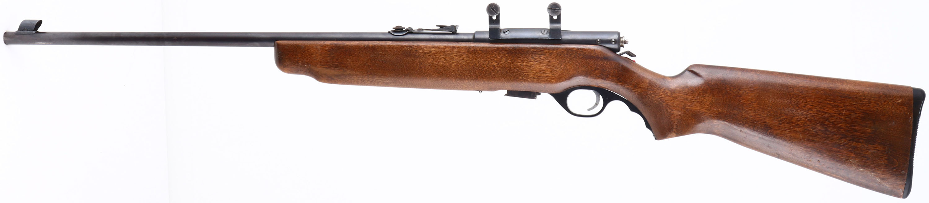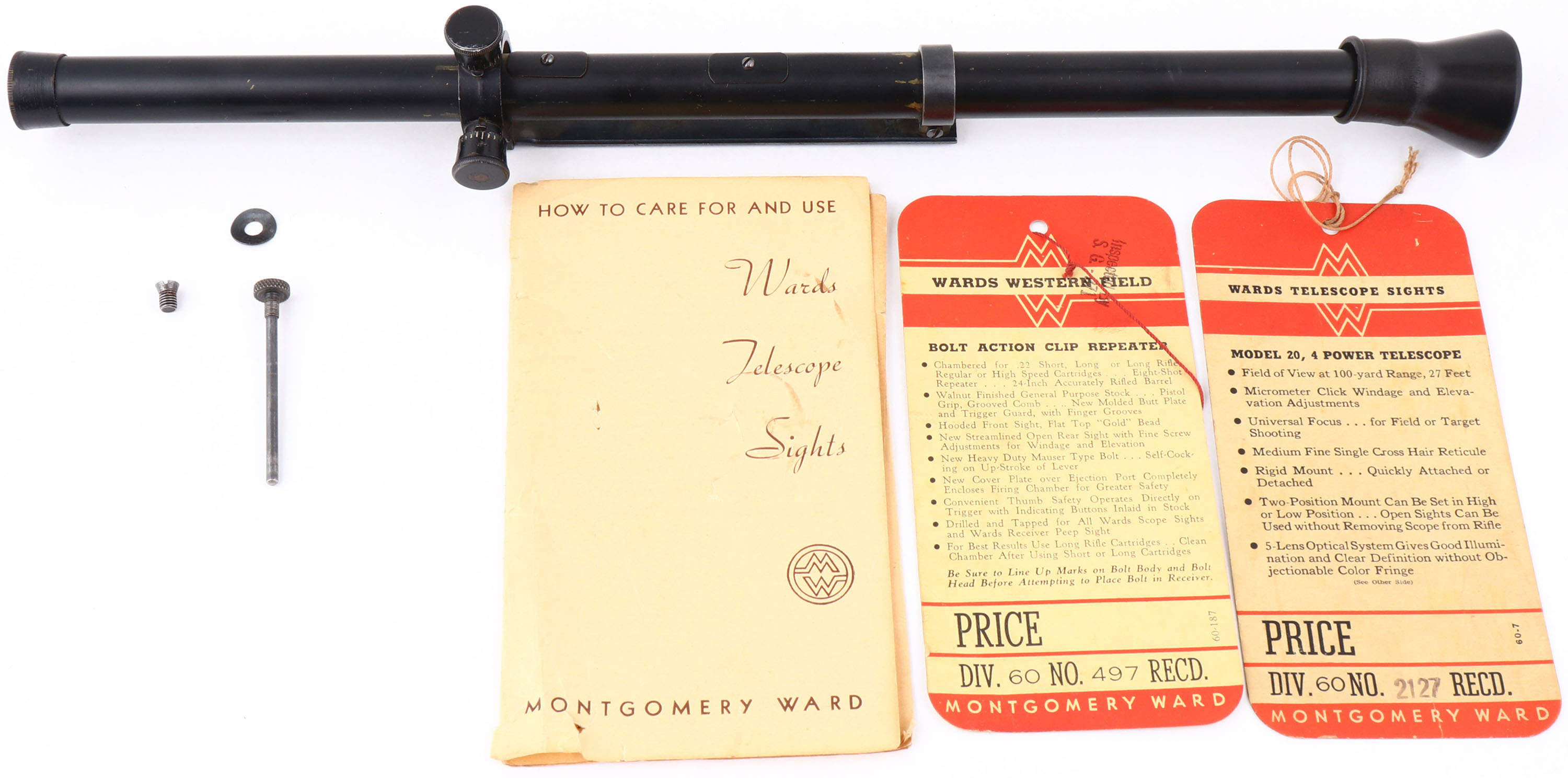 BOXED, Ward's Western Field, Model 04M 497A, CAL: 22 S.L.LR, MFG: Late 1930's, Early 1940's, SN: NSN, Bolt Action Rifle, 24'' barrel. The original flat pistol grip wood stock is excellent. There are minor scrapes, dings & small areas of thinning or flaking to the original finish. The metal blue finish rates 95% overall, beginning to tone to a brown patina. Bore is excellent. The receiver holds a side-mounted scope base. Included is a factory scope, held by a Wards Model 20 base, but the scope does not appear to attach to the gun with the current hardware. The barrel holds a disc adjustable rear sight & hooded cone front sight. Grooved plastic buttplate. Comes in original box, with owners manual & other paper articles. FFL or C&R Req. - Value: 200 to 300