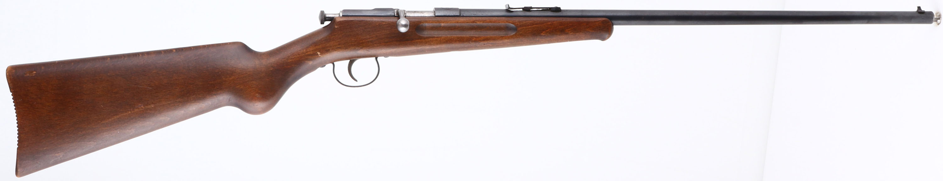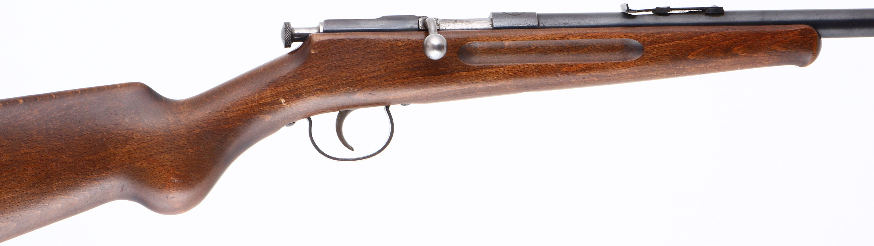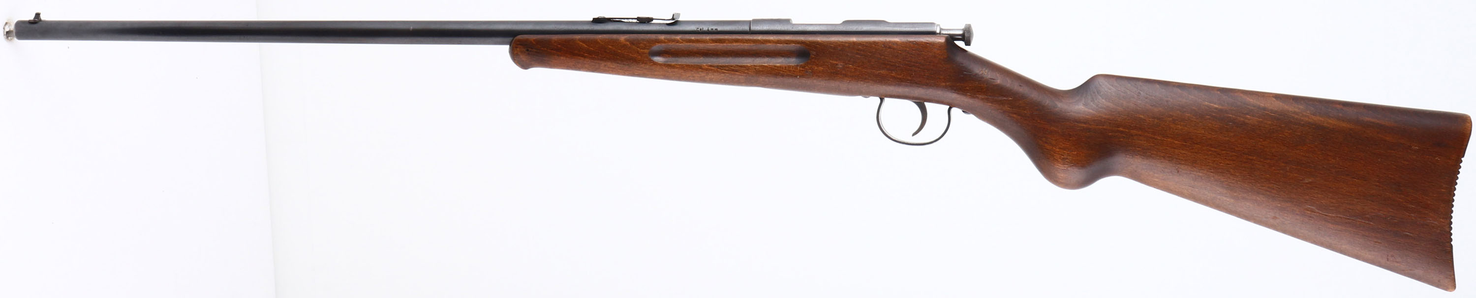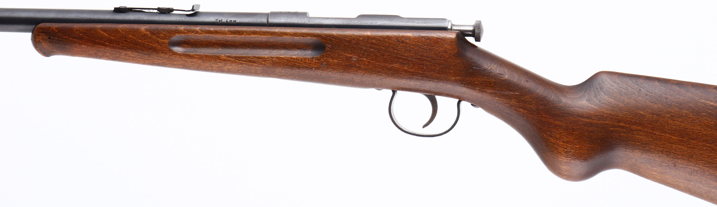 J.G Anschutz, German Parlor Rifle, CAL: 4mm RANDZ RF (SMOOTHBORE), MFG: 1930's (Pre-War), SN: NSN, Bolt Action Rifle, 22 1/2'' barrel. The top of the barrel is marked ''J.G Anschutz GmbH U/m/D. Germany'', the side of the barrel is marked ''4m/m'' & the top of the receiver is stamped in three lines ''J, JGA, A'' inside a double-lined circle. The original round knob wood stock, with finger groove forend & schnabel tip is excellent, with a few minor scrapes & dings to the original finish. The metal blue finish on the barrel rates 90% overall, with scuffs & light spotting/speckling. The receiver rates 50%, toned to a mix of remaining blue & brown patina. Bore is very good. The barrel holds an adjustable rear sight & blade front sight. Manufactured without a buttplate, rather a grooved buttend. Comes with a full container of Sellier & Bellot 4mm RANDZ (200rds). It is to be believed that these guns were predominately used for indoor beer garden shooting in Germany. Unusual to find in the U.S.. FFL or C&R Req. - Value: 150 to 450