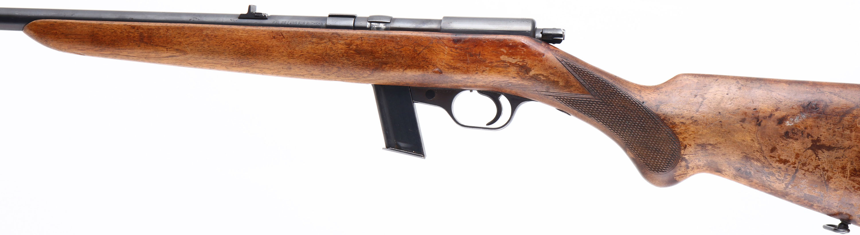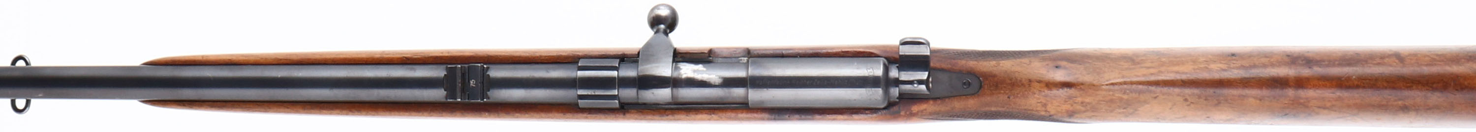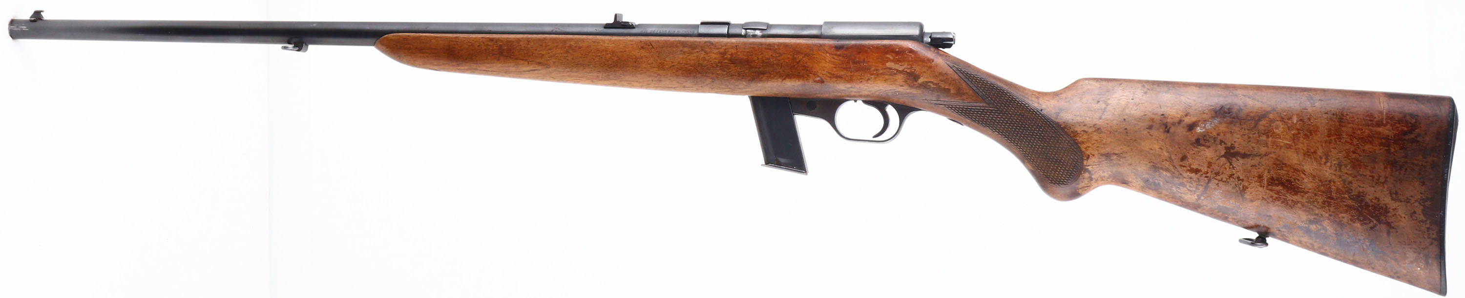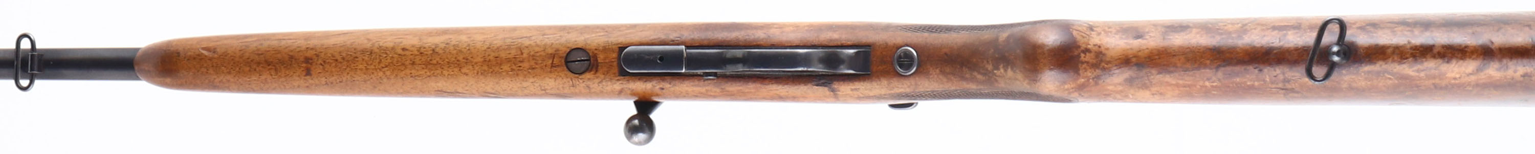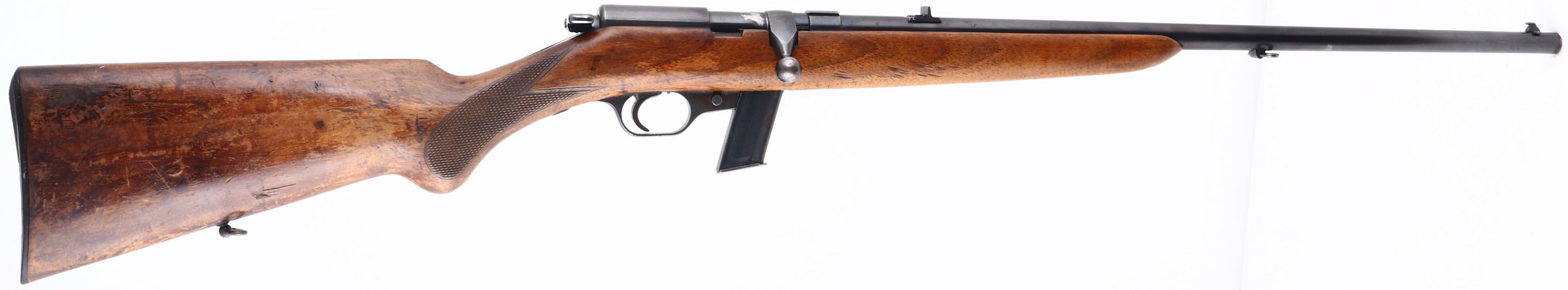 Walther, Model 2 Autoloader, CAL: 22 LR, MFG: 1930's, SN: 35092K, Bolt/Semi-Auto Rifle, 20 5/8'' barrel. This is a very unique rifle, which can function as either a semi-auto or a single shot bolt action depending on where the shooter leaves the bolt placement after cocking the initial round. The original checkered round knob wood stock is good & solid, with numerous scratches, scrapes & dings. The finish has worn thin & with flaking in large areas. The stock is solid, but shows extensive wear. The metal blue finish rates 90% on barrel & receiver, with small scuffs, scrapes & light speckling. The finish rates 50% on trigger guard & has toned to a brown patina. Bore is excellent. The barrel holds a three distance folding leaf rear sight & elevated bead front sight. Stock carries a Walther checkered black plastic buttplate. Sling loops present. Detachable mag. Not many people have seen or heard of these automatic carbines as they are seldom seen in the U.S. market. FFL or C&R Req. - Value: 300 to 600