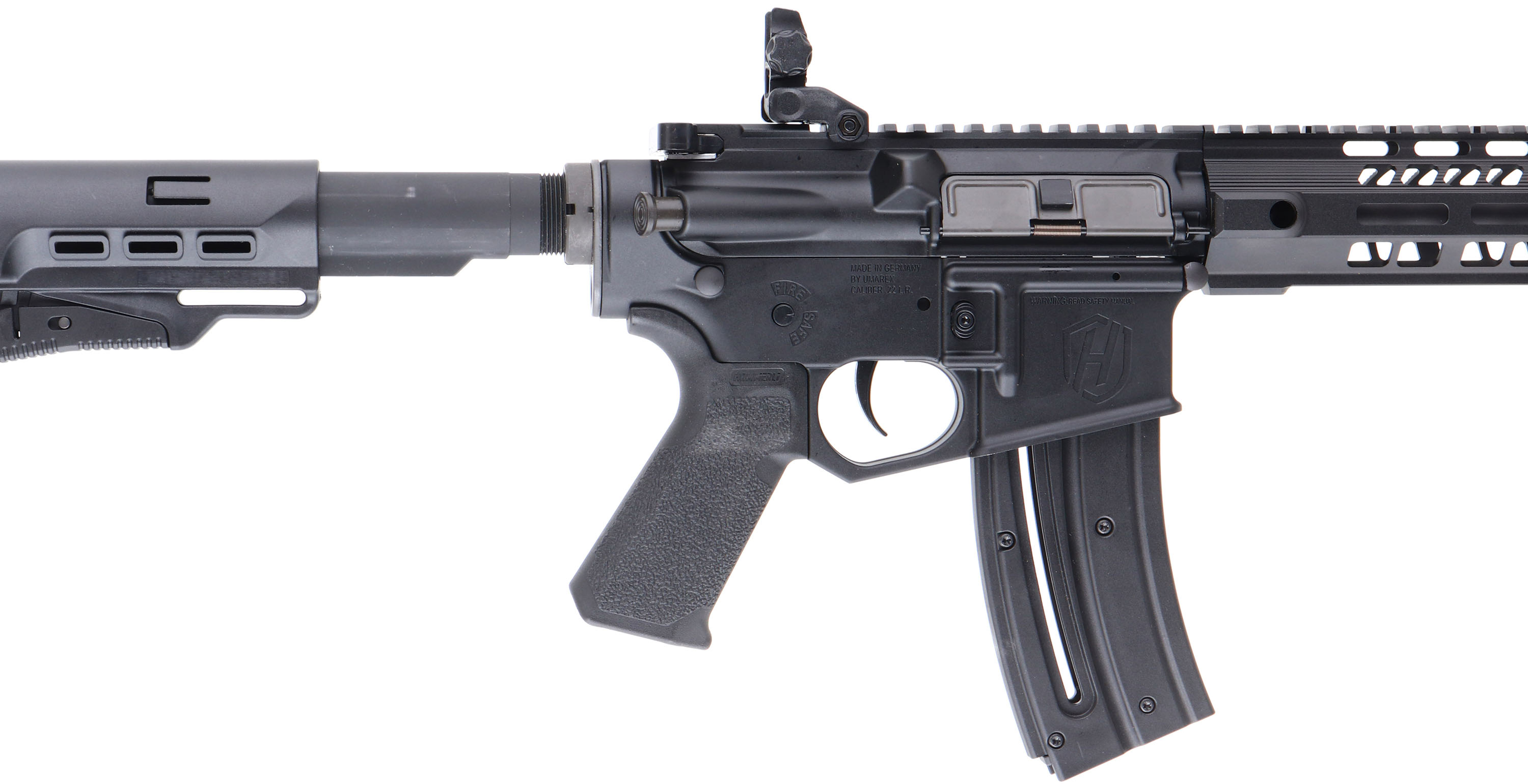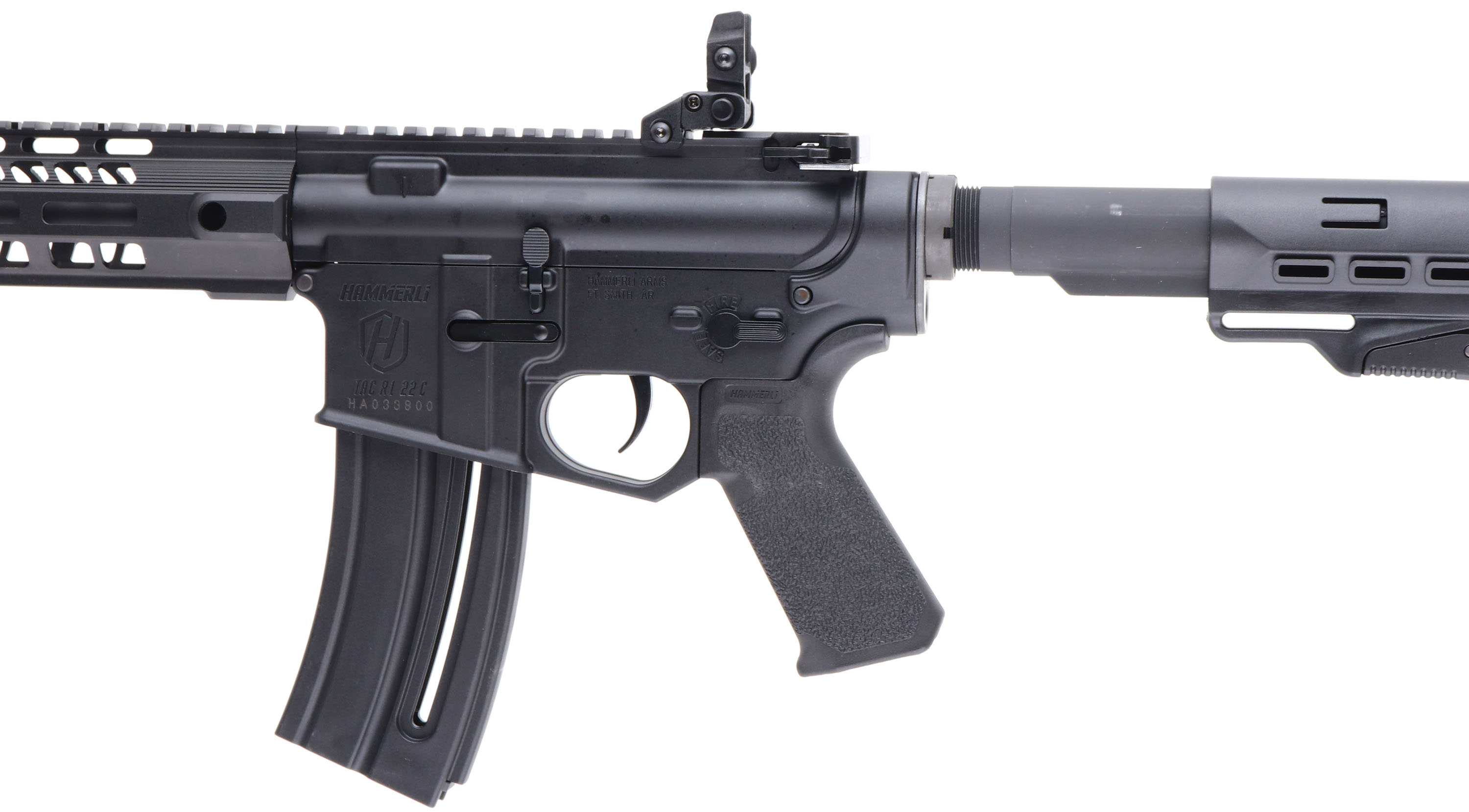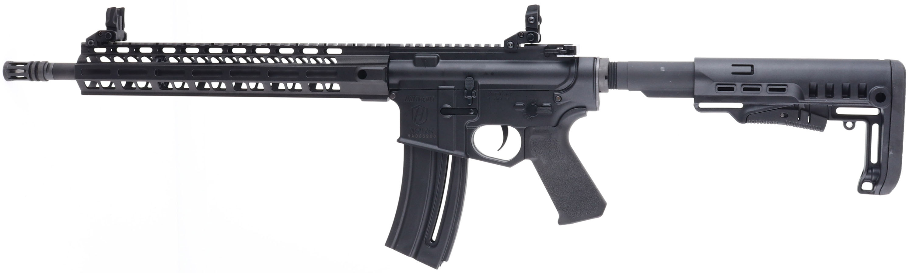 NEW, Hammerli, Model TAC R1 22 C, CAL: 22LR, MFG: Modern, SN: HA033800, Semi Auto Rifle, 17'' barrel. The adjustable composite stock & textured grip are excellent. The factory matte black finish is excellent, rating 99%+ on all components. Bore is excellent, unfired out of factory. The upper picatinny rail holds a set of flip-up iron sights. Comes in factory box, with owners manual, lock, tool, & magazine. NOS. FFL Req. - Value: 400 to 800