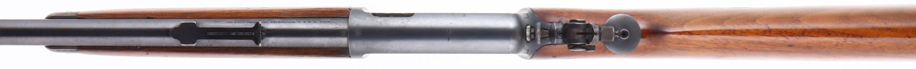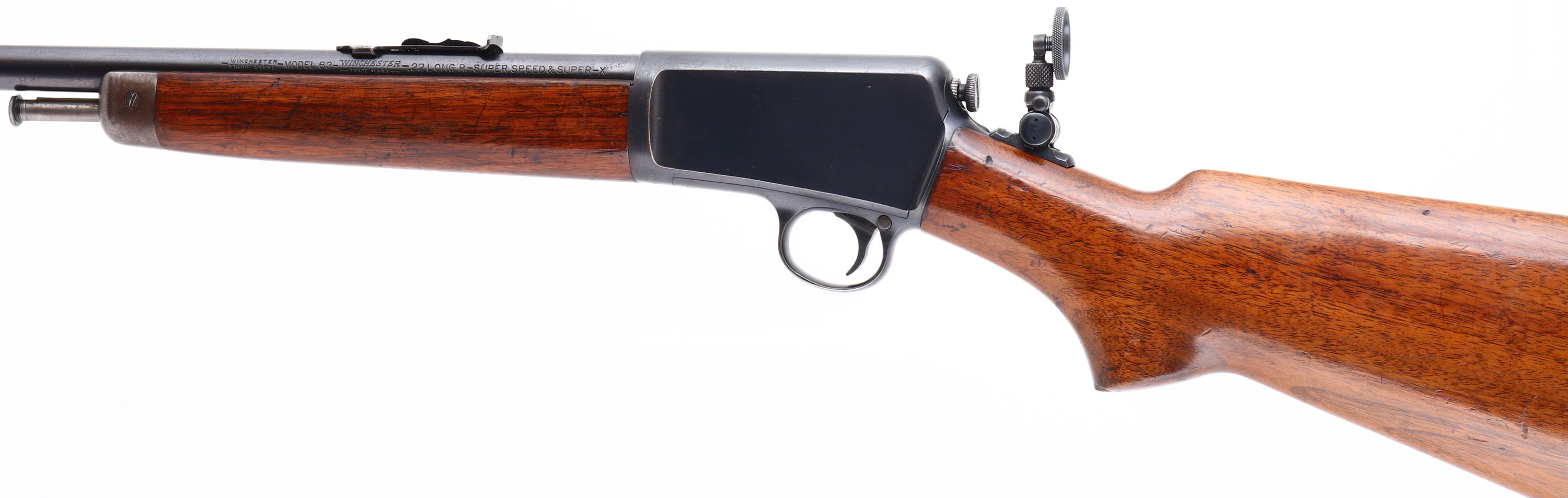 Winchester, Model 63 Carbine, .22 LONG R. SUPER SPEED & SUPER-X Cal., MFG: 1933, SN: 247, Semi-Auto Action Rifle, Likely a first week or first month production gun. Has the rarer early 20'' carbine length tapered round barrel. The 20'' barrels were discontinued in 1936 when the 23'' barrel length was implemented. The original factory flat pistol grip wood stocks are excellent & solid, despite numerous small blemishes, contusions, scratches & chips along the edge of the pistol grip & buttend. The stocks retain the majority of the original finish. The original metal blue finish is 95% on the barrel, 85% on the receiver, with areas of thinning loss toning a bit plum. Bore is excellent. Fitted with a large disk aperture tang sight, while barrel carries an adjustable rear & small blade front sight. Factory metal buttplate. A very nice & original early production semi-auto. FFL or C&R Req. - Value: 1200 to 2500