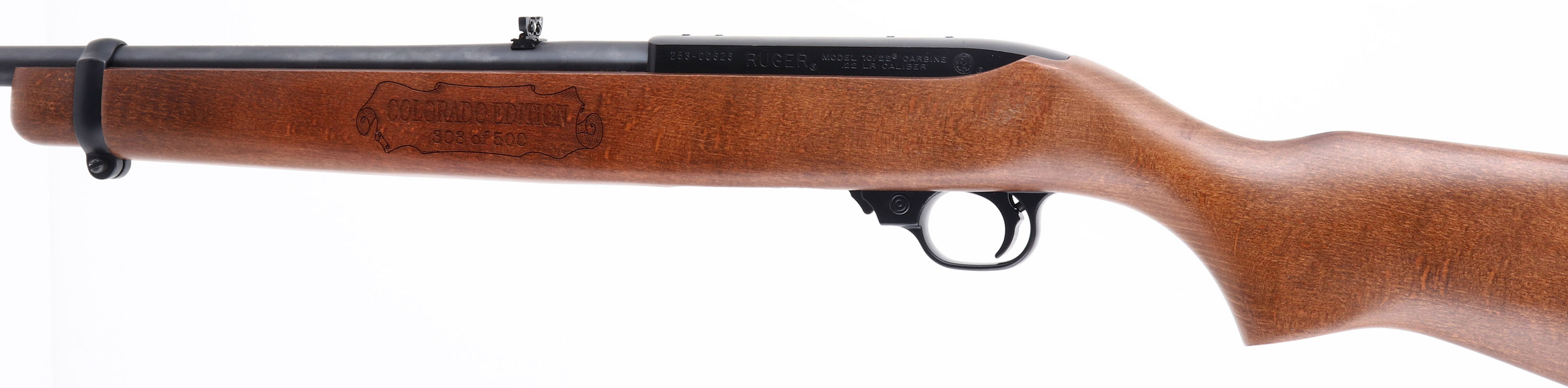 Ruger, Model 10/22 Carbine, Sept 11th Colorado Edition 303 of 500, CAL: 22 LR, MFG: 2001, SN: 253-00626, Semi-Auto Rifle, 18 1/2'' barrel. The original flat pistol grip wood stock is excellent, with excellent original finish. The stock carries laser engravings, with a New York State coin. The metal blue finish rates 99%. Bore is excellent, with defined rifling. The rifle is fitted with a folding leaf rear sight & elevated blade front sight. Buttstock carries a carbine style plastic buttplate. Missing detachable mag. FFL Req. - Value: 300 to 600