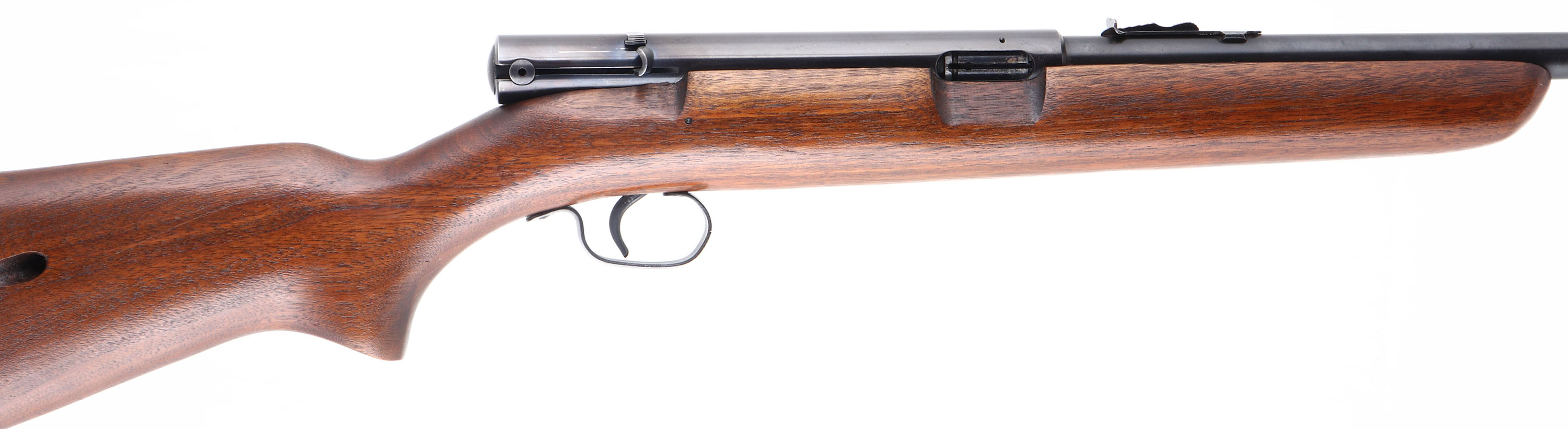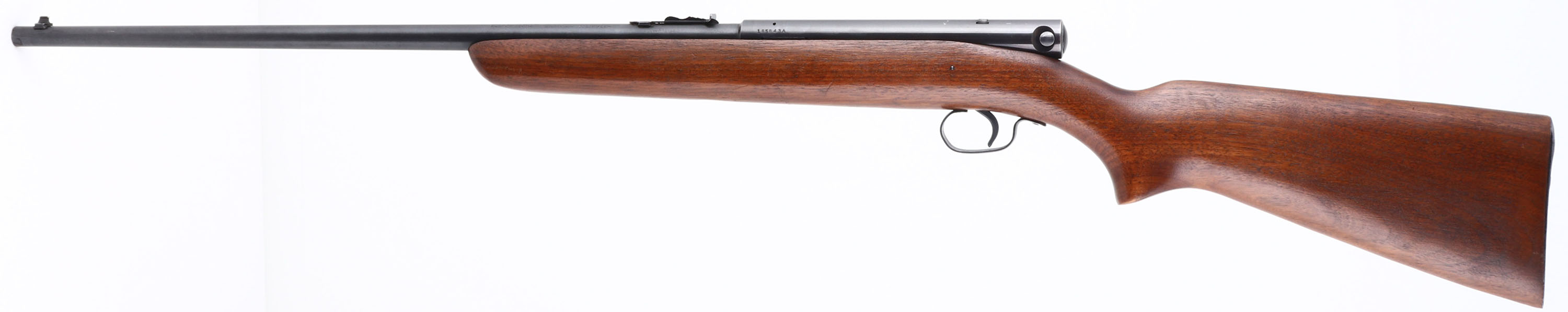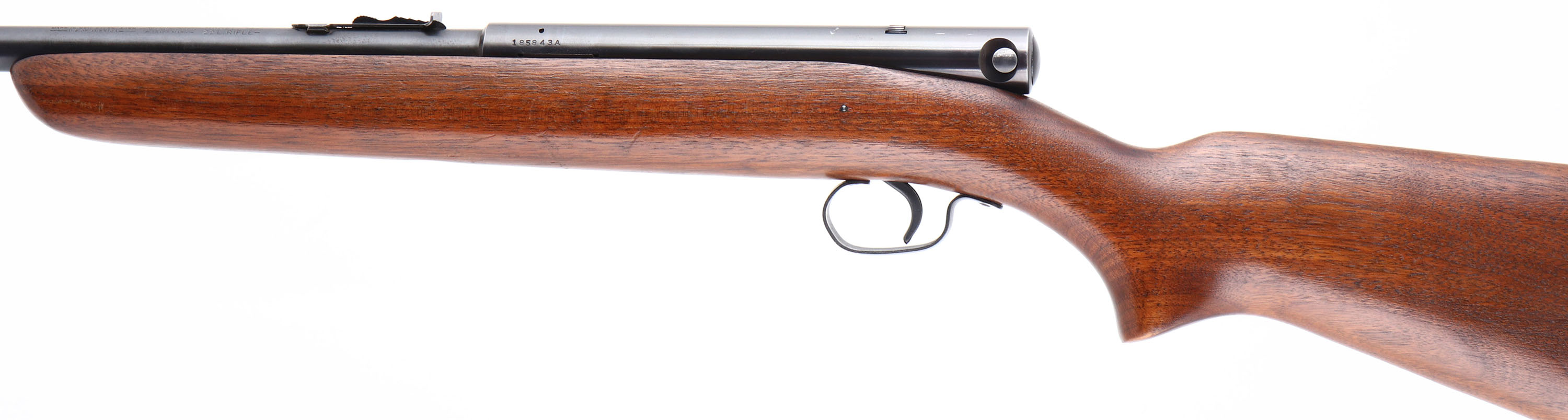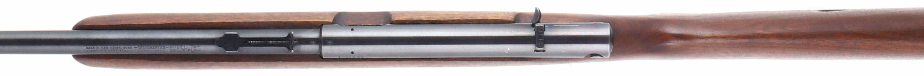 Winchester, Model 74, Marked .22 LONG RIFLE, MFG. 1948, SN: 185843A, Semi-Auto Rifle, 22'' Tapered round barrel, Although some 400,000 plus model 74 rifles were produced, it is a rifle that is seldom encountered & little is know. Cartridges load through the buttstock once the mag follower is removed through the buttplate. High condition factory original examples such as this rifle do command a premium among collectors. The original American straight grain walnut & pistol grip stock is excellent & carries the factory finish. There are very few finish level contusions or scuffs. Factory metal blue finish is 95% overall. Bore is excellent. Fitted with an adjustable rear sight & factory front sight. The unusual receiver mounted safety functions by sliding it side to side within a dovetail channel. An excellent & original condition, Winchester semi-auto .22. FFL or C&R Req - Value: 500 to 1000