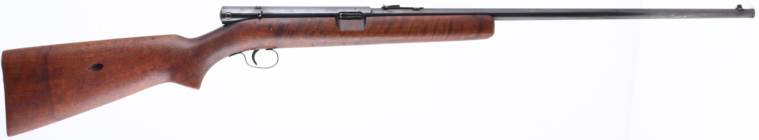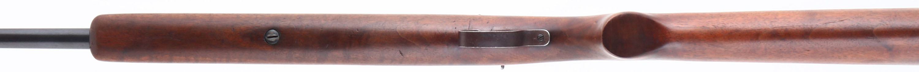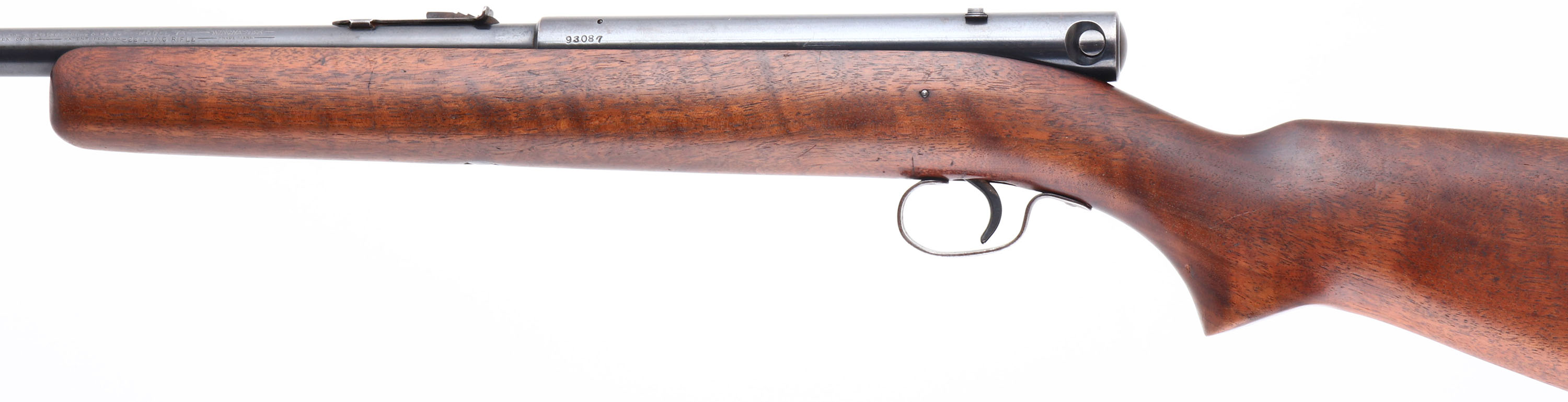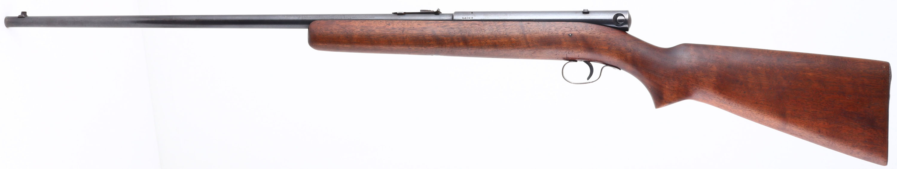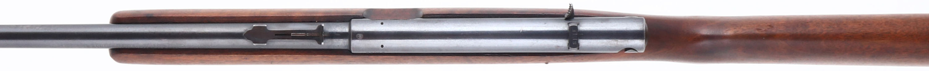 Winchester, Model 74, CAL: 22 LR, MFG: 1941, SN: 93087, Semi Auto Rifle, 24'' Tapered barrel. The original, flat pistol grip wood stock is excellent, with minor scrapes & handling marks to what appears to be the original thinning finish. The metal blue finish rates 85% overall. Finish on trigger guard has toned to a brown patina. Bore is excellent. The barrel holds an adjustable rear sight & blade front sight. Stock carries a checkered metal buttplate & internal mag tube. Rifle is loaded through a slot on the right hand side of the stock. An unusual Winchester rifle. FFL or C&R Req. - Value: 150 to 350