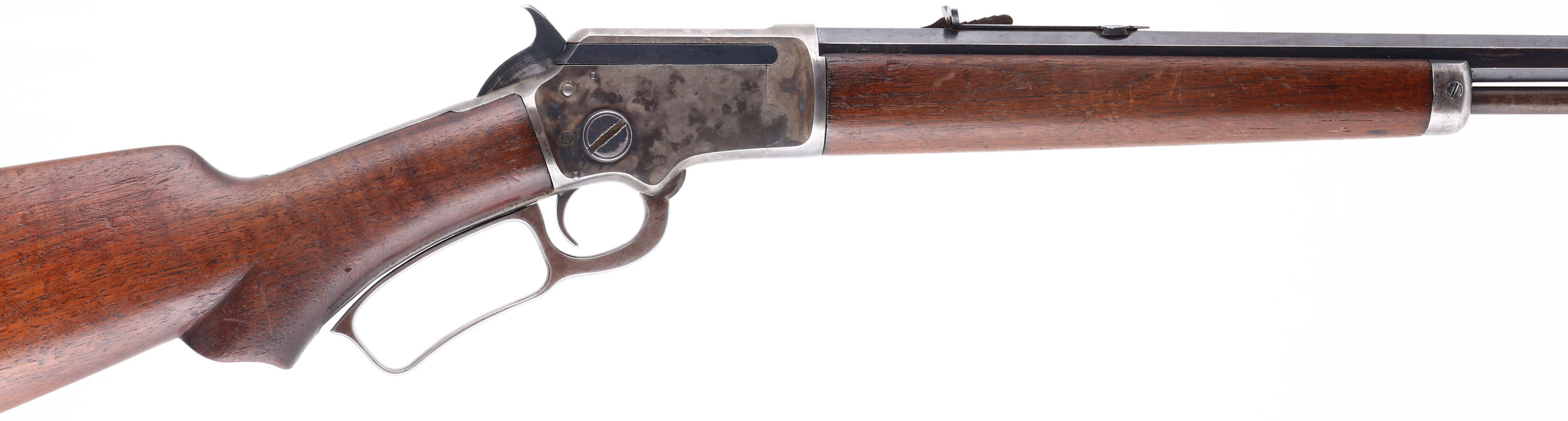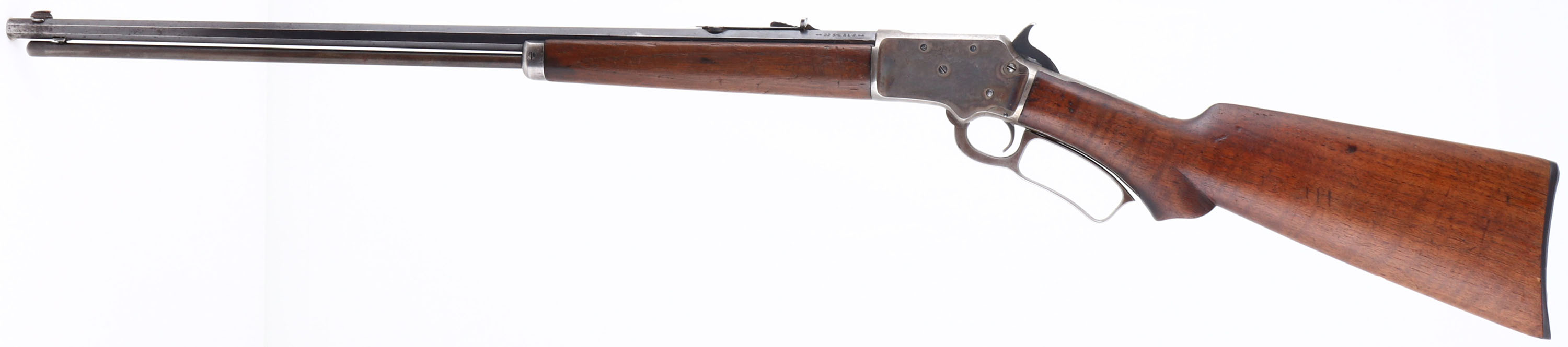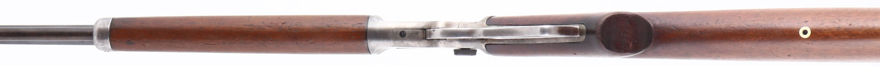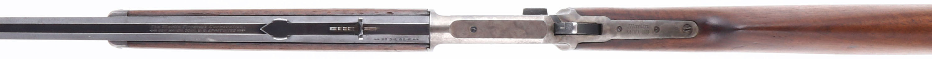 Marlin, Model 39, CAL: 22 S.L.LR, MFG: 1920's, SN: S6975, Lever Action Rifle, 24'' octagon barrel. The original scalloped pistol grip wood stocks are very good, as lightly sanded & refinished. There are contusions, scrapes, nicks & thinning to the finish. The trademark bullseye is present on the bottom belly of the stock. The original metal blue finish on the barrel rates 60%, toned to a thin brown patina in areas of loss. The tube has worn to a gun metal gray & brown patina. The receiver is case-hardened has worn & toned mostly gun metal gray, with shadowing & muted case-colors remaining. Bore is excellent & bright, with light intermittent spotting. The barrel holds an adjustable rear sight & blade front sight. The buttplate carries an accurate replacement of a Marlin checkered plastic buttplate. FFL or C&R Req. - Value: 500 to 1000