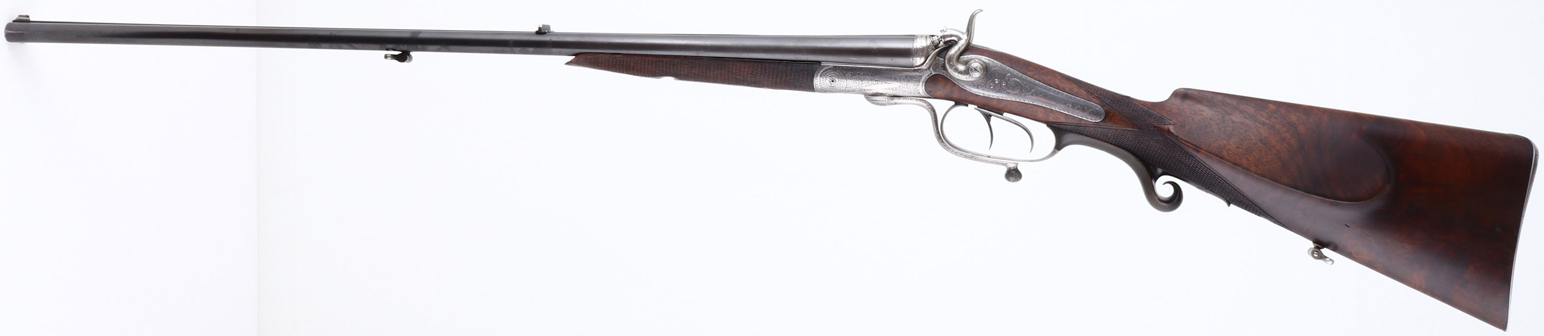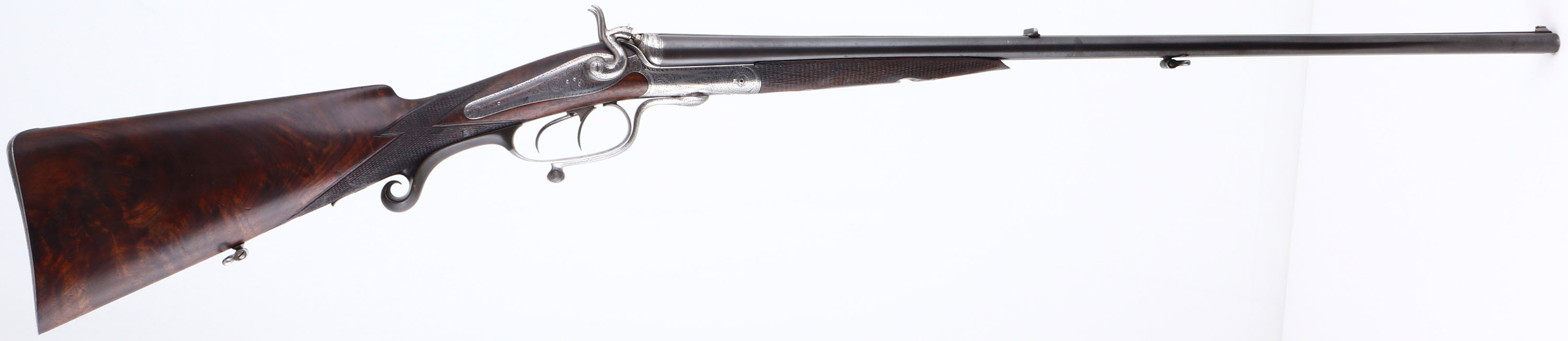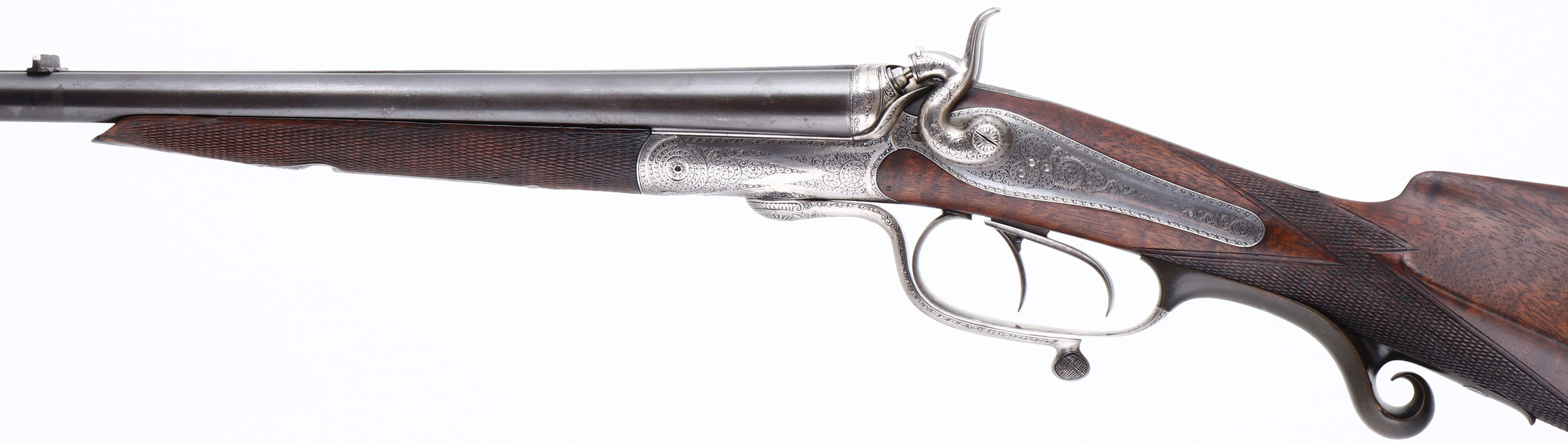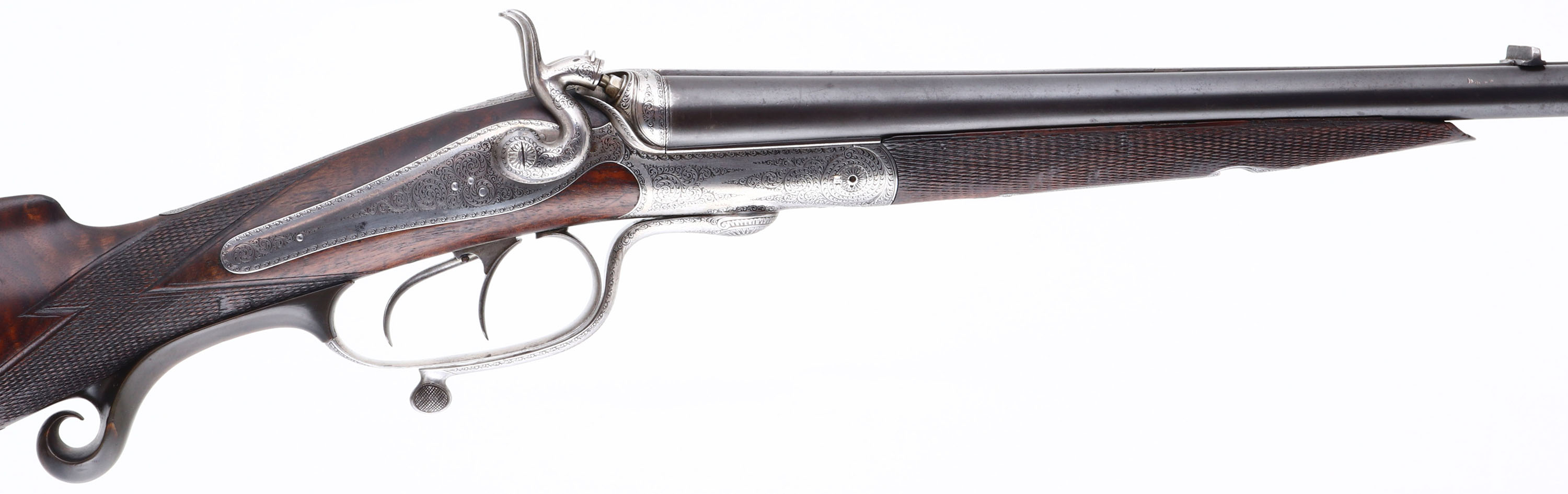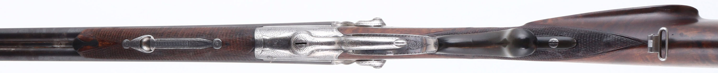 WONDERFUL Wilhelm. Foerster Konigl, Underlever Hammer Double Rifle, CAL: 9.3X72R, MFG: Later half 19th century, SN: N/A, Underlever Break Action Hammer SxS Rifle, 26 5/8'' barrels, with matted solid rib. Very little is presently known about Wilhelm Frster / Foerster of Berlin who founded his business in 1861. He referred to himself as ''Hofbchsenmacher'' or Gun Maker to the Court. Several of the existing guns with his name attest to this. They are seen with monograms or crests of many prominent individuals. He was a supplier to Royal Court of Carl Von Preussen (1801-1883). Carl was the third son of King Friedrich William III of Prussia. Carls sister Charlotte married Tsar Nicholas I of Russia. Wilhelm Frster certainly cultivated this patronage by the German & Russian Elite. All of his guns show great detail & craftsmanship as demanded by these clients. The checkered, cheeked, & straight grip wood stocks are excellent. They display fantastic grain, with minor scratches & contusions to what appears to be the original finish. Ebony tipped forend. The metal blue finish on the barrels has toned a bit plum & rates 80%. The finely engraved German silver receiver, side panels, hammers & under lever are silver & display fine scroll & detailed hand engraving. Bores are very good. The solid matted rib is engraved ''W. Foester Koniglh: Hofbuchsenm: Berlin'' & holds fixed V rear & silver blade sight. The behind the trigger guard is a scroll carved horn material. Buttstock carries a metal hand engraved buttplate. Sling loops present. An absolutely fabulous hand built double rifle worthy of royalty.* Antique, No FFL REQ - Value: 4000 to 6000