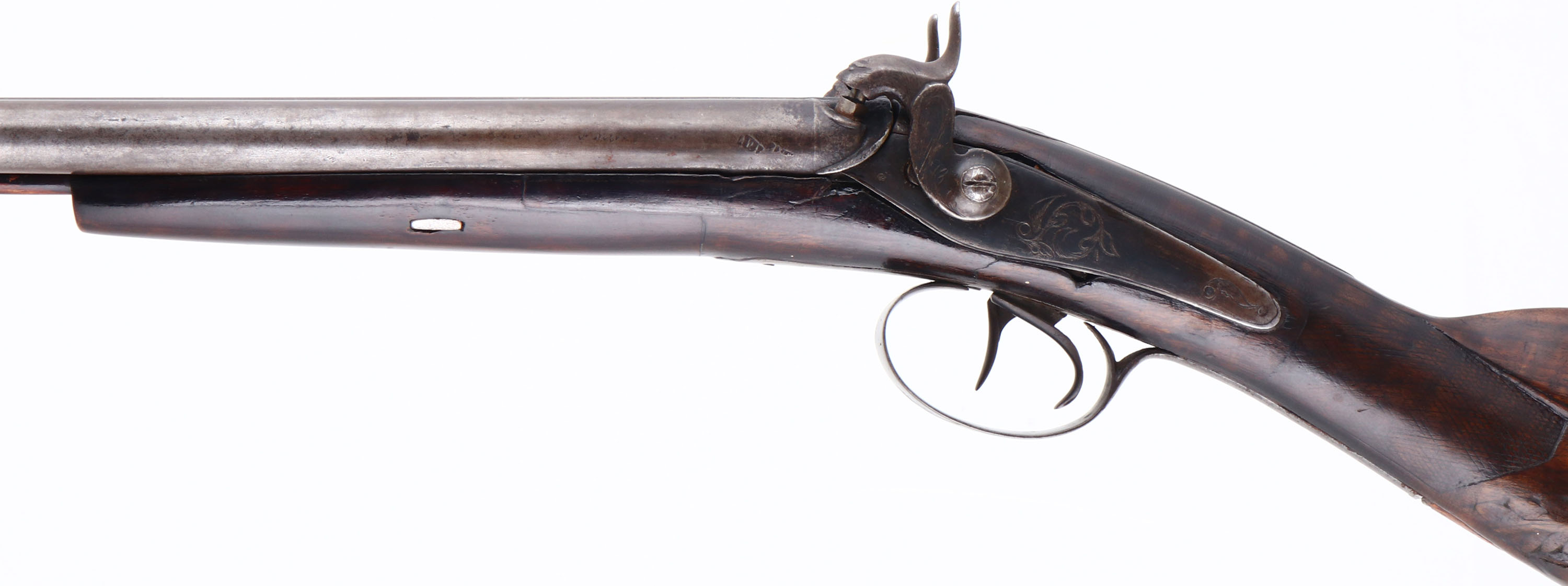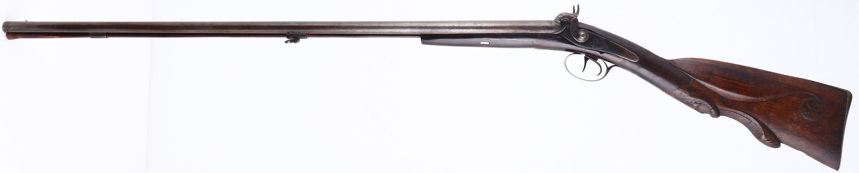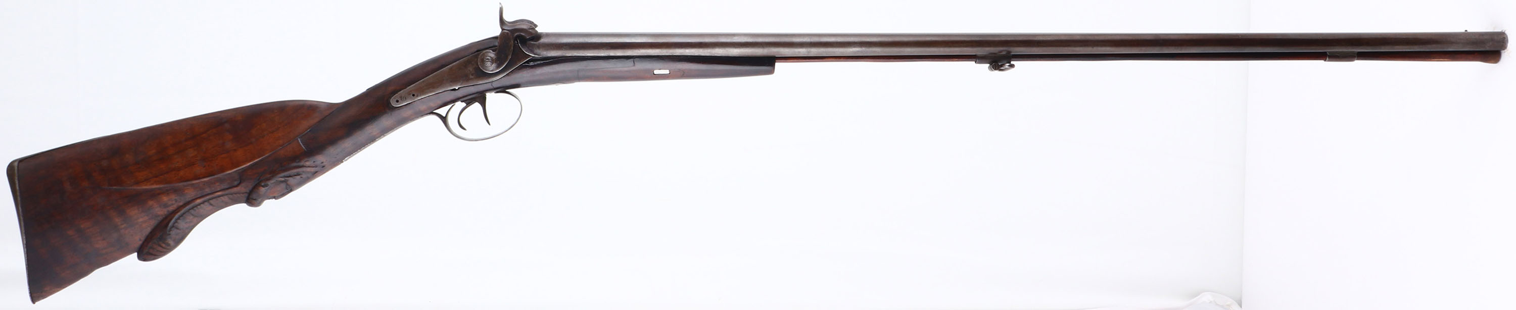 Unknown, Muzzle loading Double Hammer Shotgun CAL: 20 GA, MFG: Antique, SN: N/A, Muzzle Loading Hammer SxS Shotgun, 29 1/4'' barrels. No markings found anywhere on the gun.. Best described as an antique & unique wall hanger. The checkered straight grip wood stock is good & solid, displaying a wonderful carved warrior face in the belly of the stock, along with other relief & cheek carvings. There is a toe repair & it appears that the forend portion of the stock was shortened & spliced. There are some minor scratches & contusions, & the checkering has smoothed. Much of the original finish has worn thin & the forend portion has been refinished. The metal is a mix of remaining blue & a thin brown in areas worn gun metal gray. Right nipple is missing & the left hammer screw is a replacement. The rib holds a single bead. Buttstock carries a smooth metal buttplate. Ram rod stored under barrels & in forend, with sling loop on the retention band. Hammers & triggers appear to function correctly. Antique, No FFL Req. - Value: 120 to 300