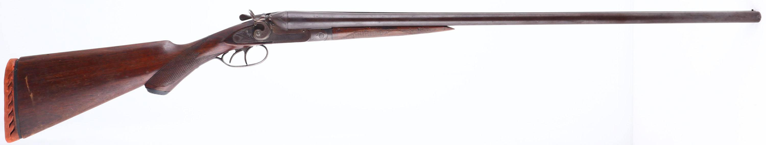 American Gun Company, CAL: 12 GA, MFG: 1888-95, SN: 124690, Break Action Hammer SxS Shotgun, Choke: F/F, 32'' Damascus barrels, with solid matted rib. Made by Crescent Arms out of Norwich Connecticut & sold under the name American Gun Co. The checkered & capped pistol grip wood stocks are very good, displaying several scratches, scrapes & contusions to the original finish. The metal finish on the barrels & receiver has toned fully to a brown patina. The receiver, side plates, hammers & triggerguard all have decorative hand engraving. Bores are good. The solid, matted rib holds a single front bead. Buttstock carries a hardened vintage recoil pad . LOP: 14 1/4'' over pad. Antique, No FFL Req. - Value: 200 to 400