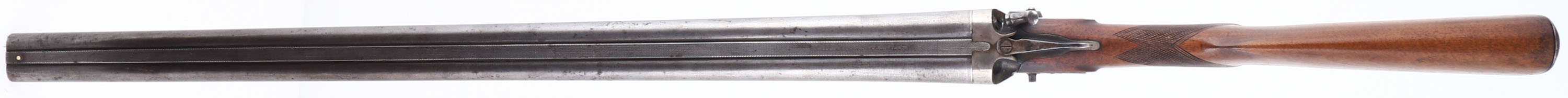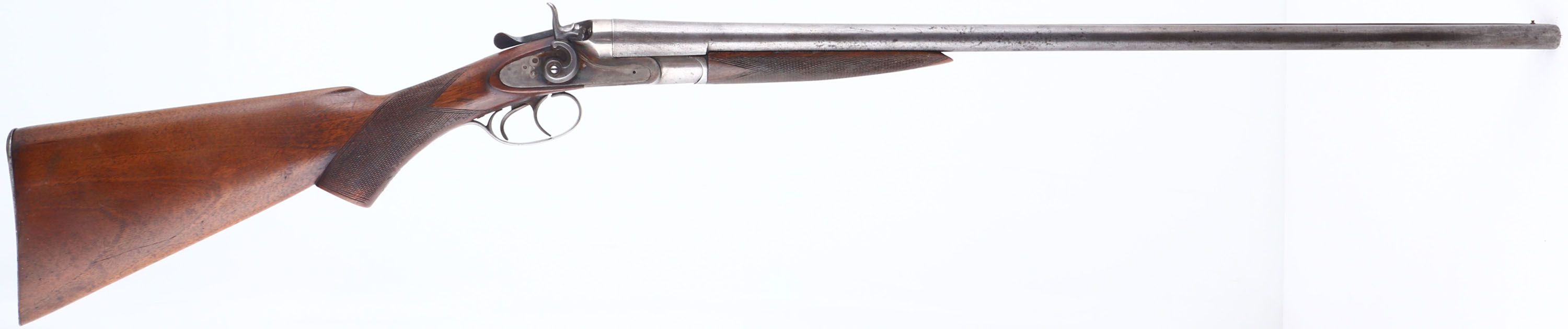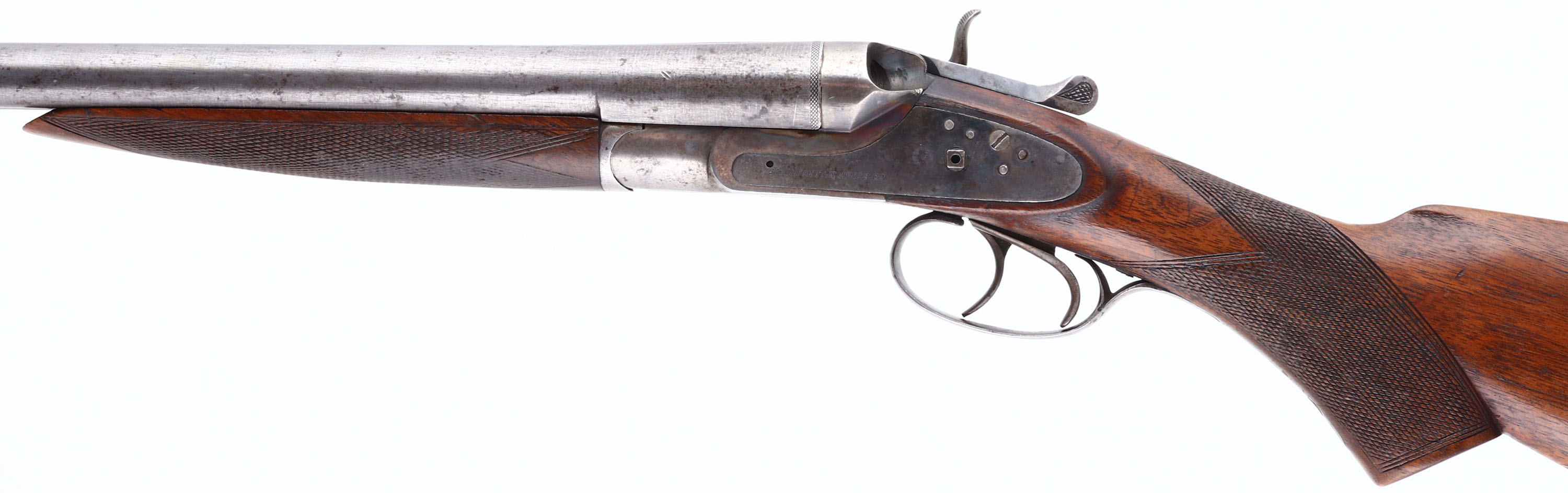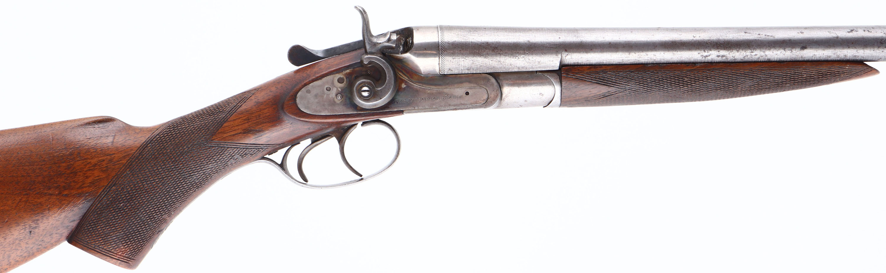 Manhattan Arms Company, CAL: 16 GA, MFG: 1880-95, SN: 13207, Break Action Hammer SxS Shotgun, Choke: F/MOD, 28'' Twist barrels, with solid matted rib. Manhattan Arms Company was a trade name used on shotguns by both Neumann Freres & Company & F. Dumoulin & Company both of Liege Belgium in the period circa 1880-1914. The checkered & flat pistol grip wood stocks are very good, displaying a several minor scratches, scrapes & contusions to the original finish. The left side of stock is stamped ''MONTANA ARMORY BOZEMAN MONT.'' There is a silver shield inlaid in the flat of the pistol grip. The metal finish on the barrels has worn gun metal gray, with some brown spots. The case-hardened receiver & break lever display fading case-colors in protected areas. The left side hammer & both nipples are missing. Serial number or partial # is stamped on the barrel, water table & inside of forend. Bores are excellent. The solid, matted rib holds a single front bead. Buttstock carries the original metal buttplate. LOP: 13 3/4''. Antique, No FFL Req. - Value: 150 to 300