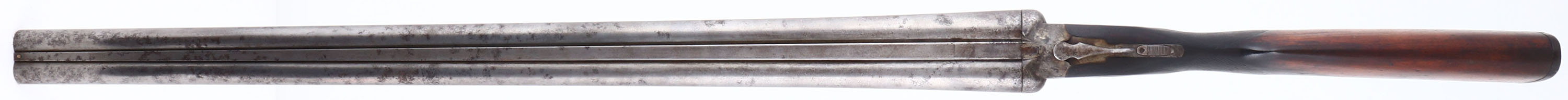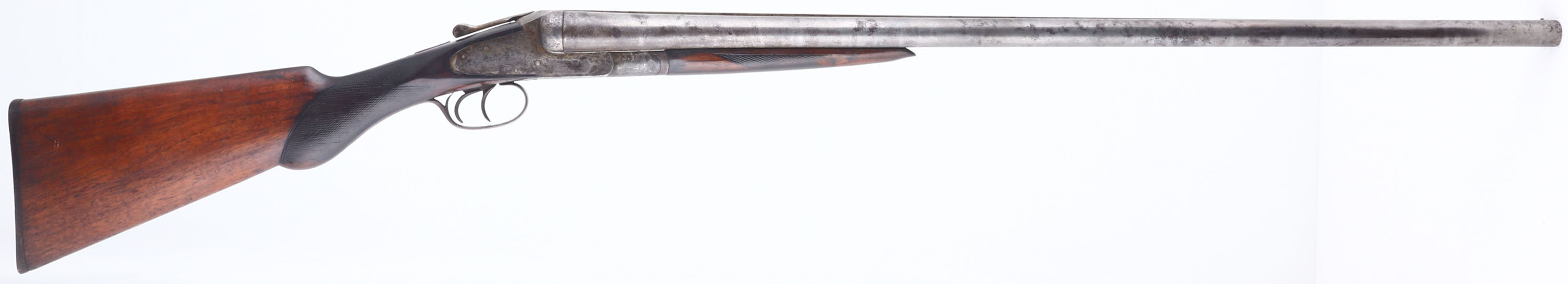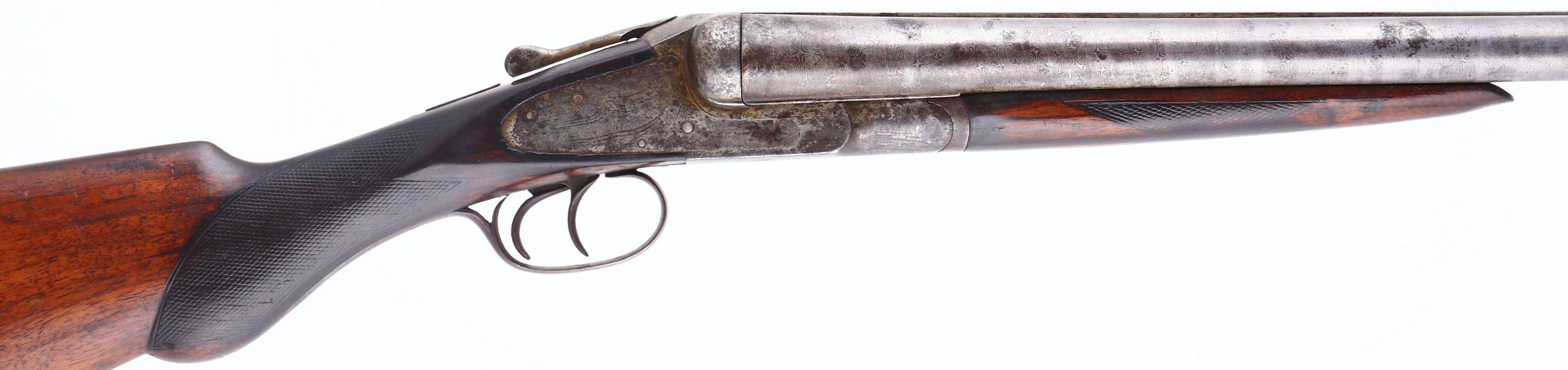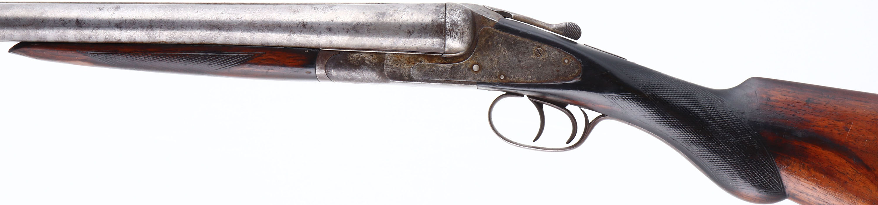 L.C Smith, Hammerless, CAL: 10GA, MFG: 1928, SN: 107597, Break Action SxS Shotgun, 32'' Damascus barrels. The refinished & checkered round knob wood stocks, with ebony inlay are excellent & solid. There are minor contusions & scrapes, with darkening from oils added over time. The Damascus pattern on the barrel has worn thin, mostly to metal grey, but still visible, with intermittent pitting toned to a brown patina. The receiver is case-hardened, with no case-colors remaining, fully toned to metal grey, with spotting toned to a brown patina. Bores are good, with consistent roughness & pitting. The solid, matted rib holds a front bead. Grooved hard rubber buttplate. Double triggers. FFL or C&R Req. - Value: 500 to 1000