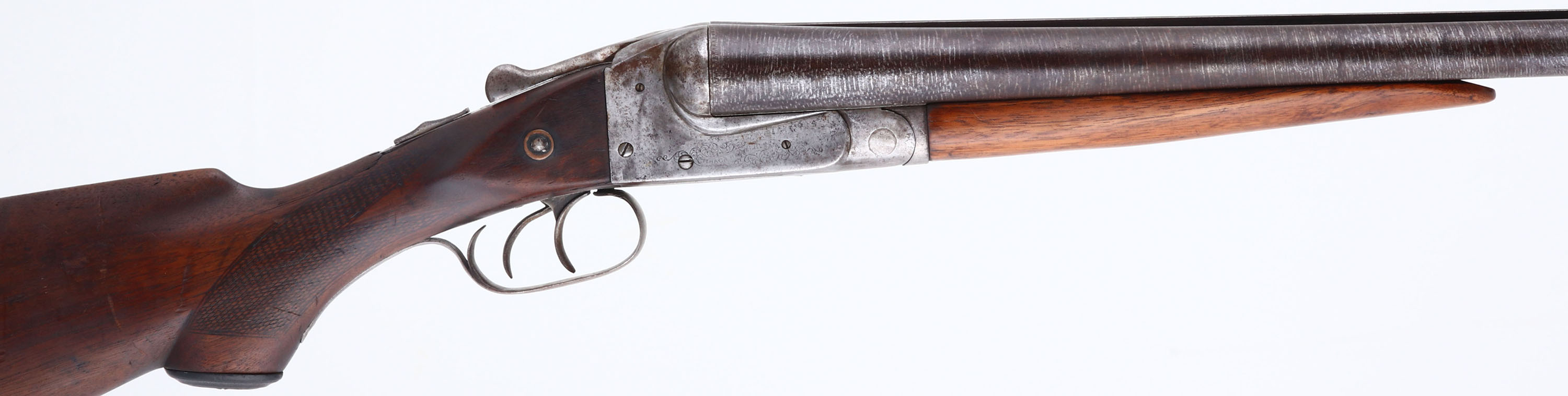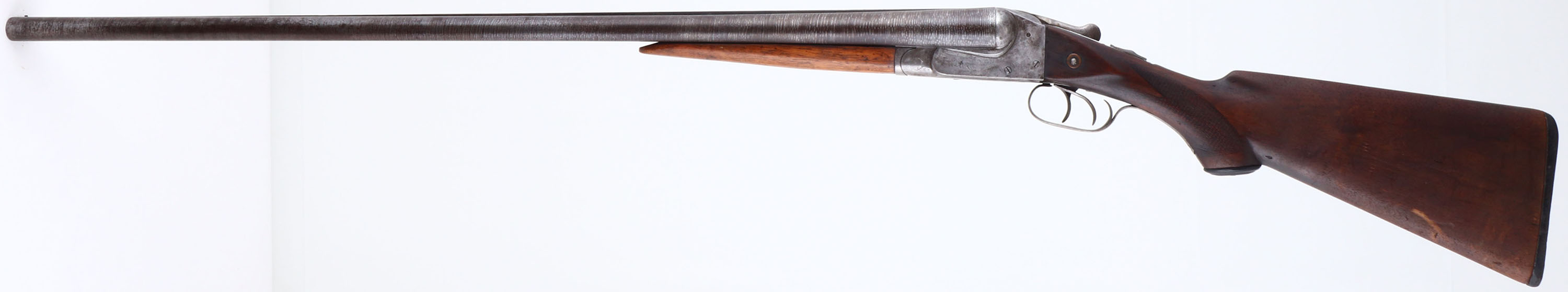 Ithaca, Lewis Model, CAL: 12GA, MFG: 1905, SN: 108302, Break Action SxS Shotgun, 32'' twisted steel barrels. The refinished, checkered & capped pistol grip wood stocks are good. The buttstock has multiple cracks at the wrist, an edge chip, alongside multiple contusions, scrapes & dings. The twisted steel barrels have toned to a mix of metal grey & brown patina. The receiver has fully toned to gun metal grey, with spotting, toned to a brown patina. Bores are poor, dark & worn. The solid matted rib holds a front bead. Worn Ithaca plastic buttplate. Double triggers. FFL or C&R Req. - Value: 100 to 300