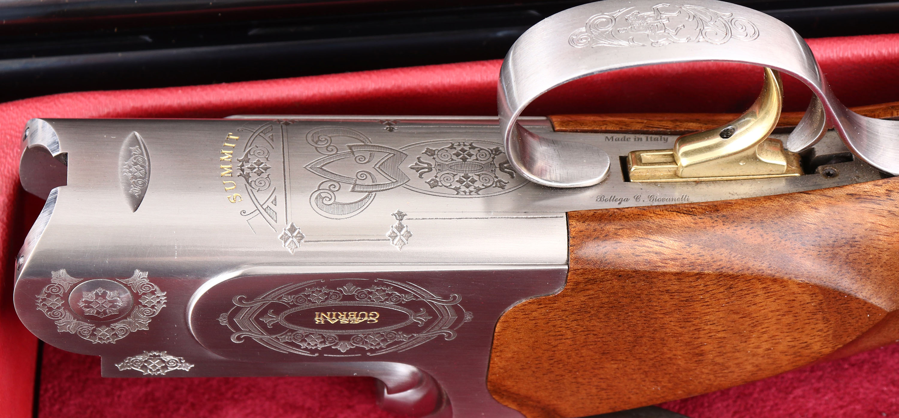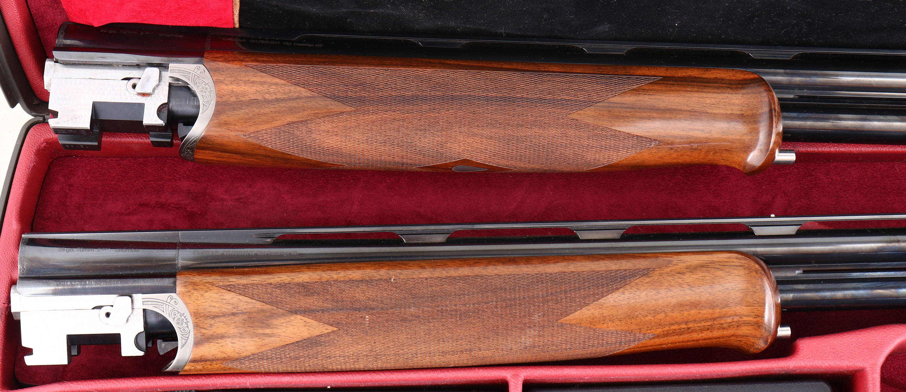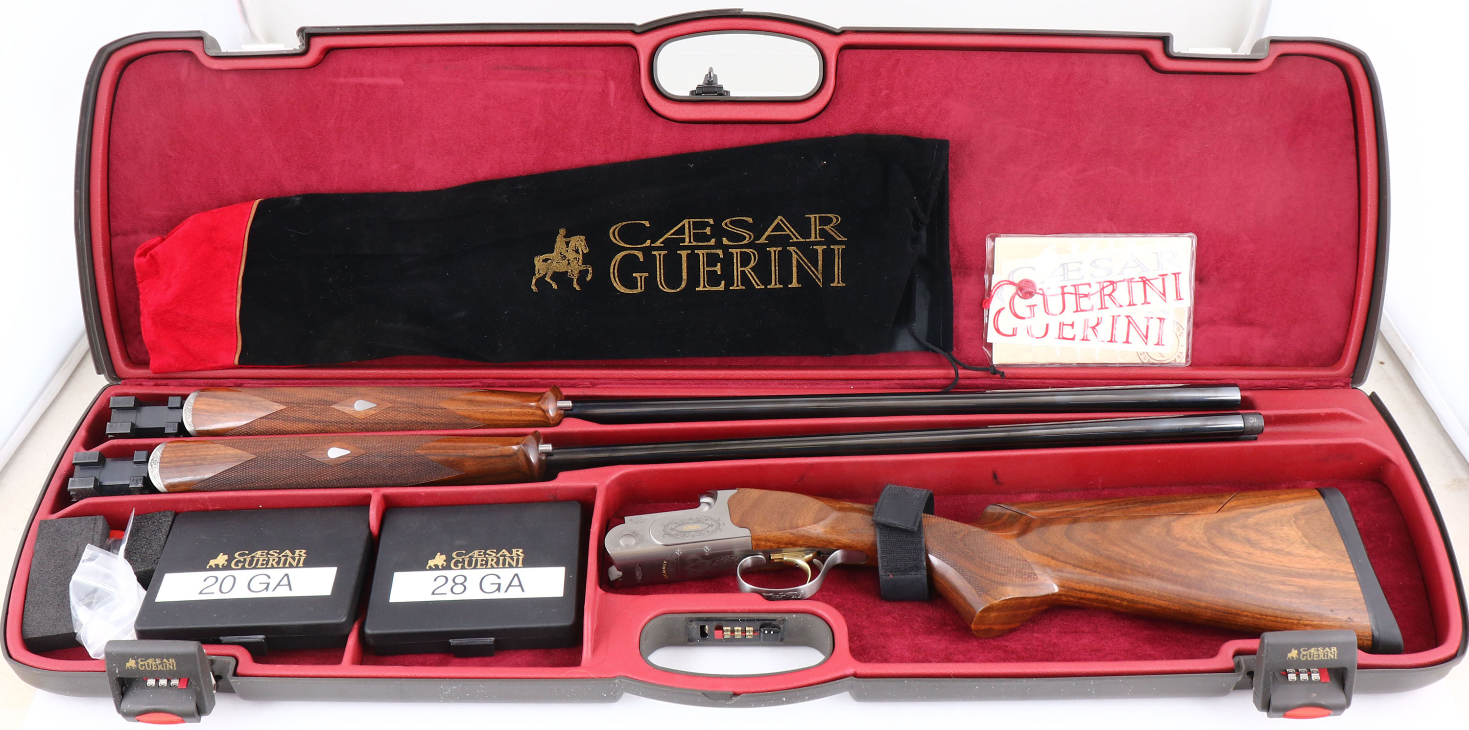CASED, Caesar Guerrini, Model ''Summit Sporting'' 2 Barrel Combo Set, CAL: 20GA & 28GA, MFG: Modern, SN: 128382, O/U Break Action Shotgun, 32'' barrels (20GA), 32'' barrels (28GA). The high grade checkered stock, with schnabel forend, adjustable comb & hand rubbed oil finish is excellent, displaying minor handling marks to the finish. The hand polished coin silver finish on the receiver is excellent, with minor blemishes. The receiver, break lever & trigger guard all display ornamental engravings & patterns. The words ''Caesar Guerrini'' & ''SUMMIT'' are gold tone. The metal blue finish on the barrel sets rates 99% overall, with very minor handling & storage marks. Bores are excellent, displaying light wear from use. The ventilated & matted rib holds a small steel mid-rib bead & white ''Bradley'' style front bead, consistent on both sets of barrels. Stock carries a C.G black rubber recoil pad. Gold tone trigger. Comes in factory hard case, with velvet sleeves for all components, separate choke sets for 20GA & 28GA, owners manual, tool & C.G stickers. This set retails for over $8000 & is without a doubt an efficient tool designed to withstand a lifetime of competitive shooting. FFL Req. - Value: 5000 to 8000