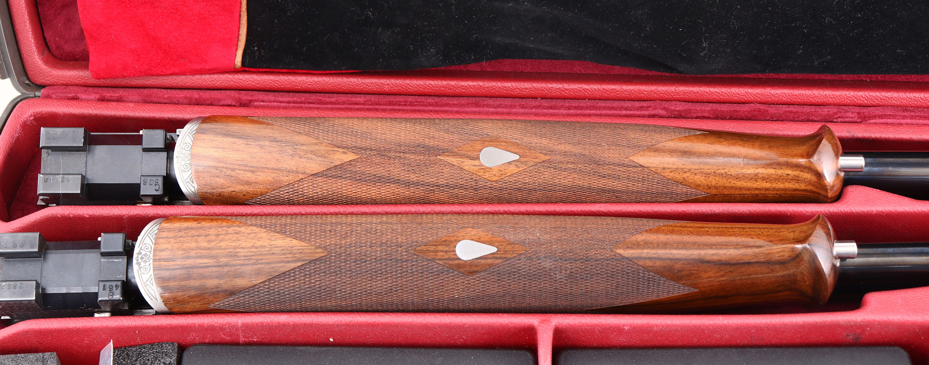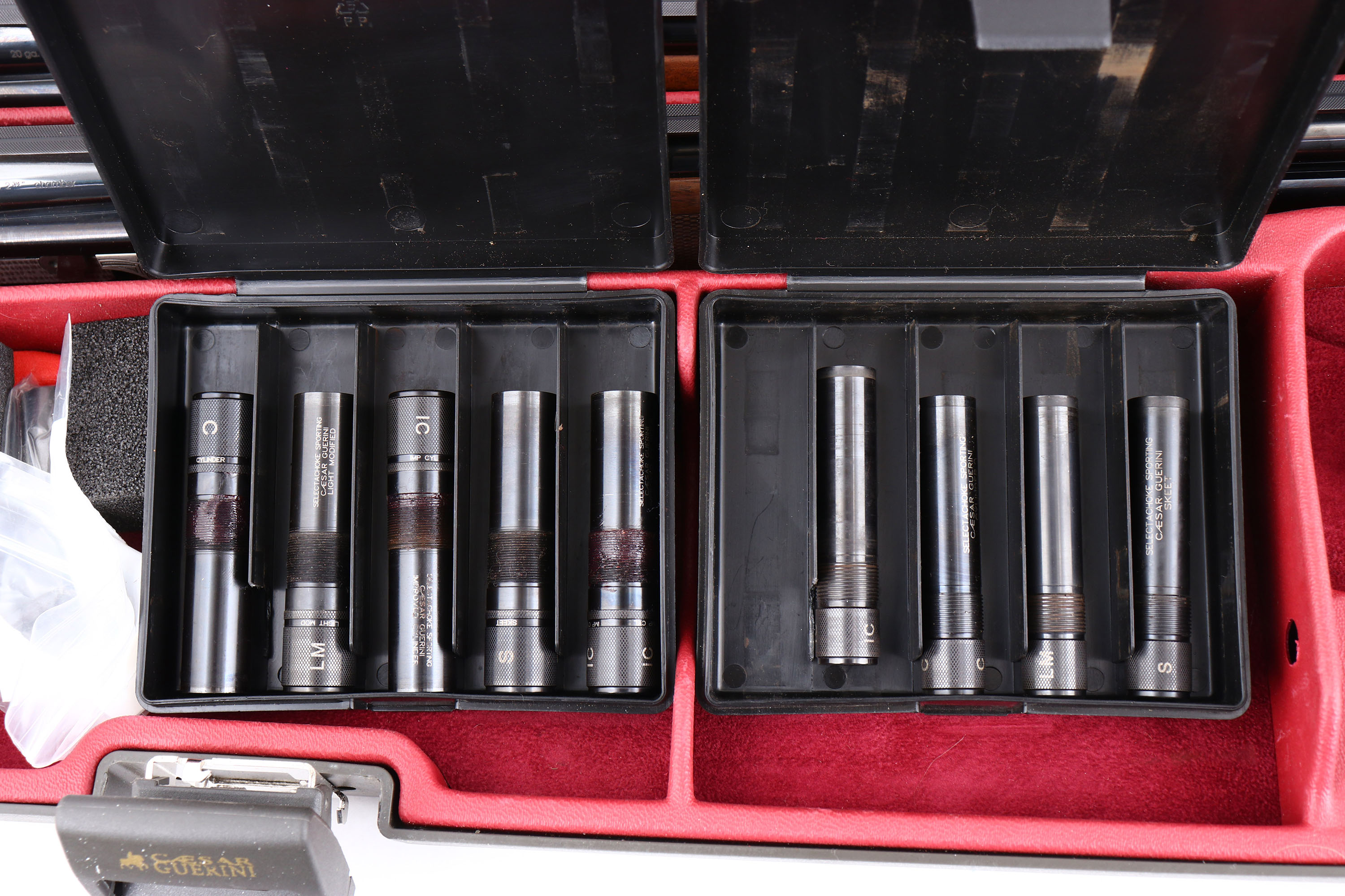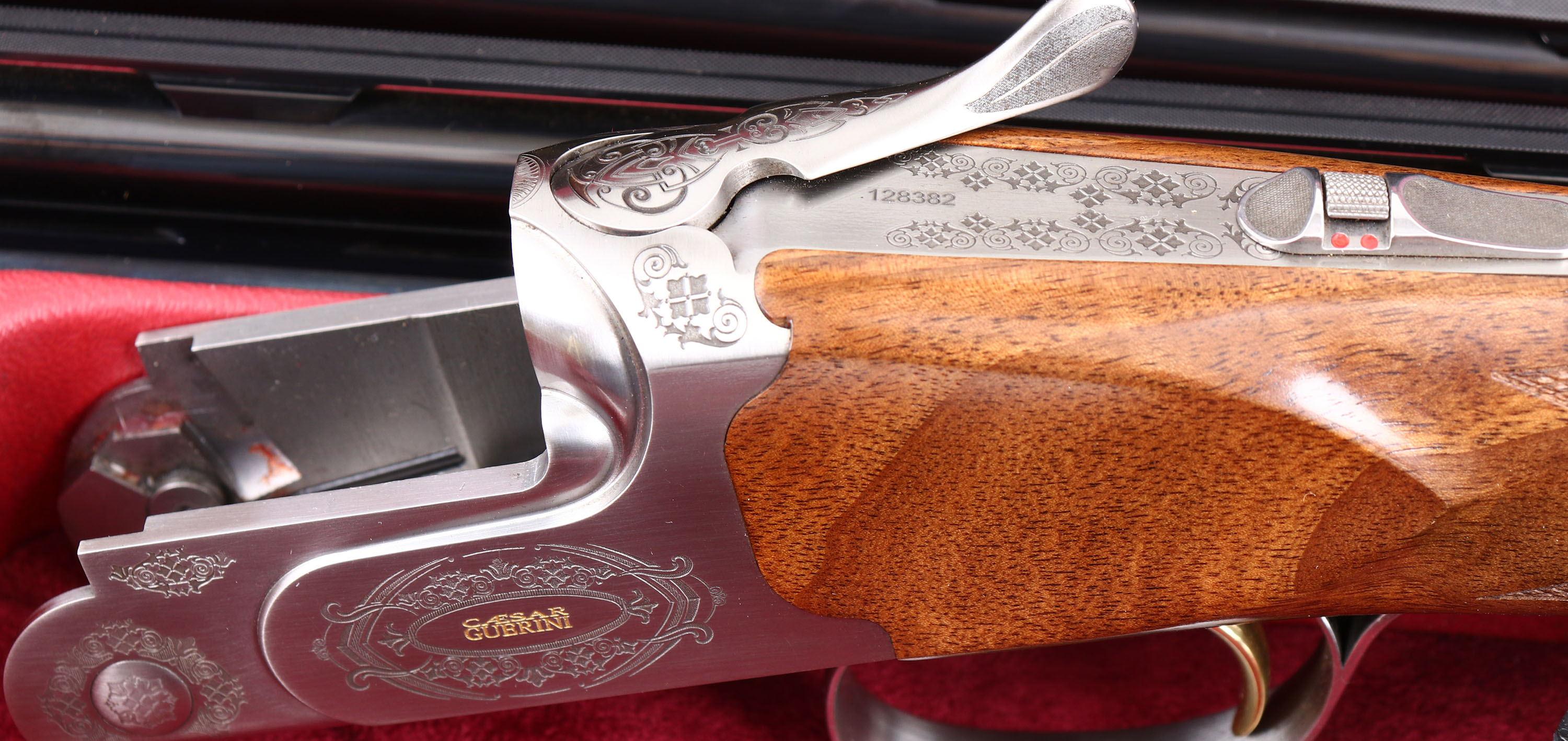 CASED, Caesar Guerrini, Model ''Summit Sporting'' 2 Barrel Combo Set, CAL: 20GA & 28GA, MFG: Modern, SN: 128382, O/U Break Action Shotgun, 32'' barrels (20GA), 32'' barrels (28GA). The high grade checkered stock, with schnabel forend, adjustable comb & hand rubbed oil finish is excellent, displaying minor handling marks to the finish. The hand polished coin silver finish on the receiver is excellent, with minor blemishes. The receiver, break lever & trigger guard all display ornamental engravings & patterns. The words ''Caesar Guerrini'' & ''SUMMIT'' are gold tone. The metal blue finish on the barrel sets rates 99% overall, with very minor handling & storage marks. Bores are excellent, displaying light wear from use. The ventilated & matted rib holds a small steel mid-rib bead & white ''Bradley'' style front bead, consistent on both sets of barrels. Stock carries a C.G black rubber recoil pad. Gold tone trigger. Comes in factory hard case, with velvet sleeves for all components, separate choke sets for 20GA & 28GA, owners manual, tool & C.G stickers. This set retails for over $8000 & is without a doubt an efficient tool designed to withstand a lifetime of competitive shooting. FFL Req. - Value: 5000 to 8000
