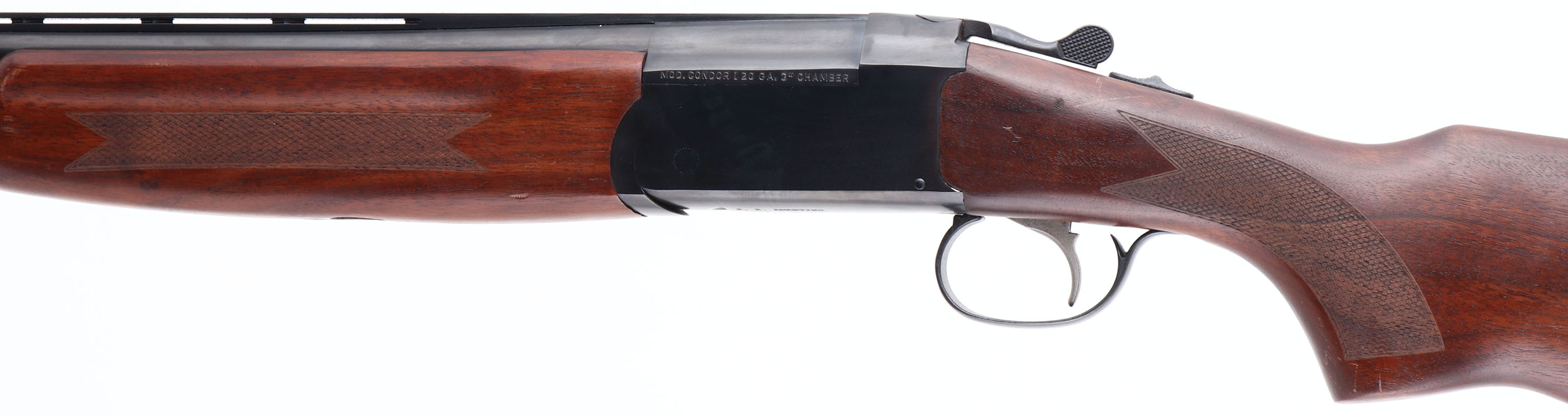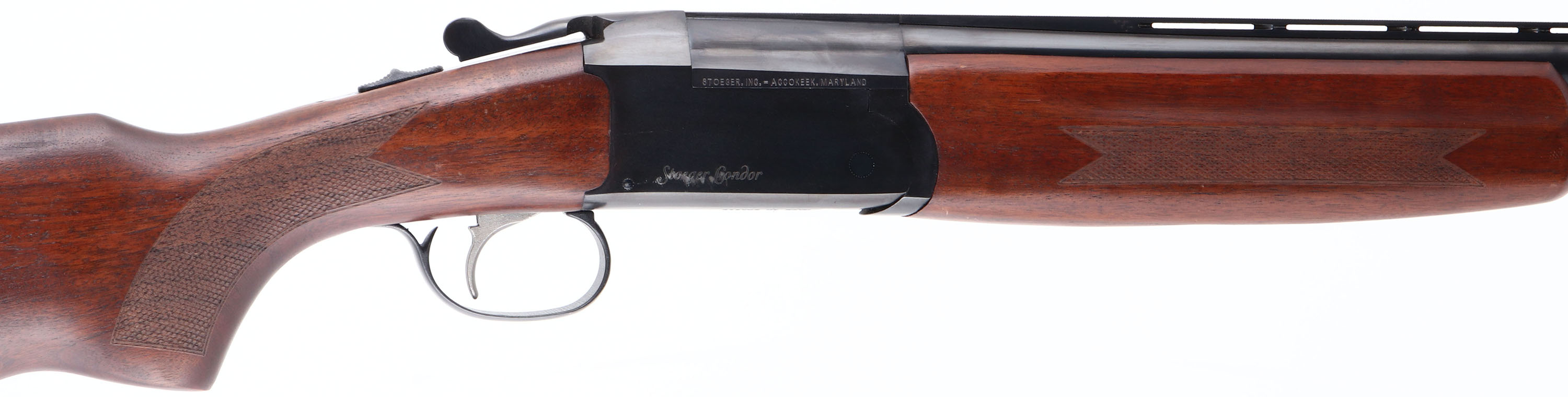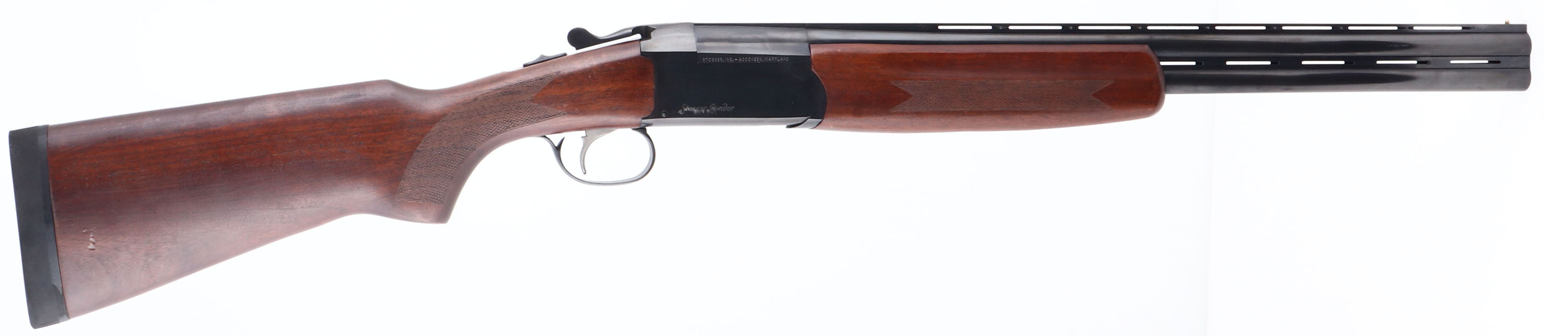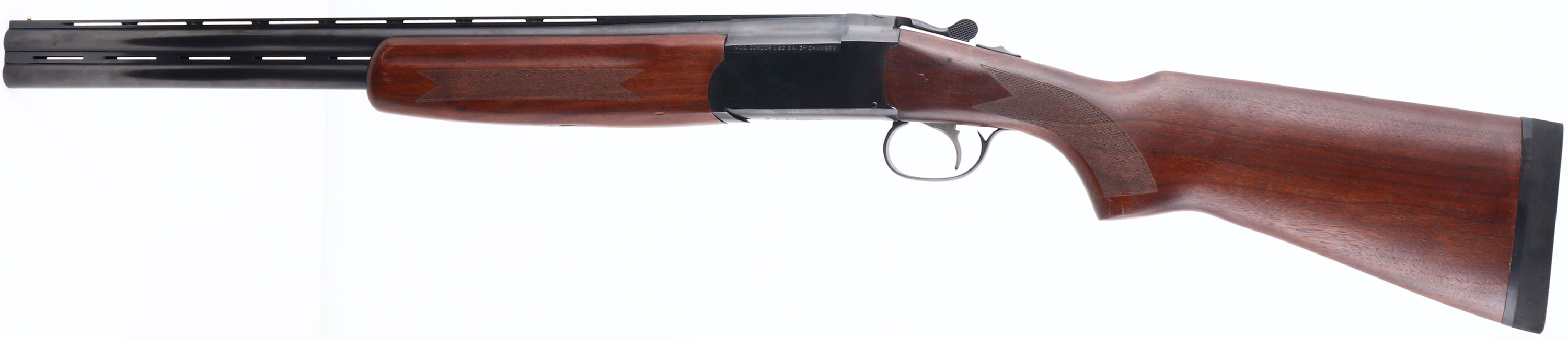 Stoeger, Condor, CAL: 20GA, MFG: Modern, SN: J304726-12, Break Action O/U Shotgun, 22'' barrels, Double Ventilated Rib. The checkered, flat pistol grip wood stocks are excellent, with minor scrapes to the finish. The metal blue finish rates 98%, with a scuff to metal grey on the right side of the receiver. Bores are excellent. The ventilated & matted rib holds a brass front bead. Solid black rubber recoil pad. FFL Req. - Value: 300 to 600