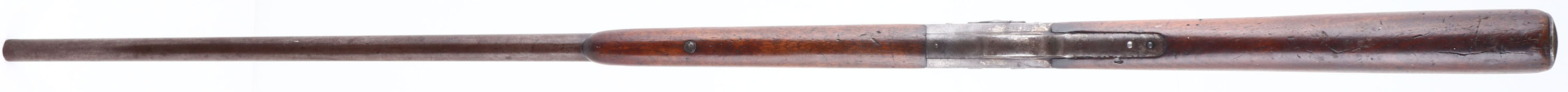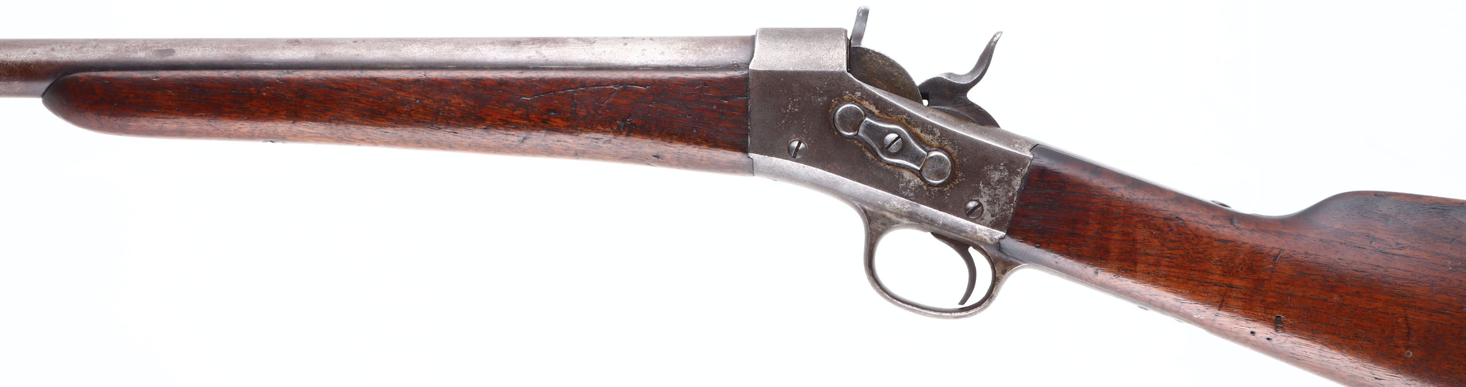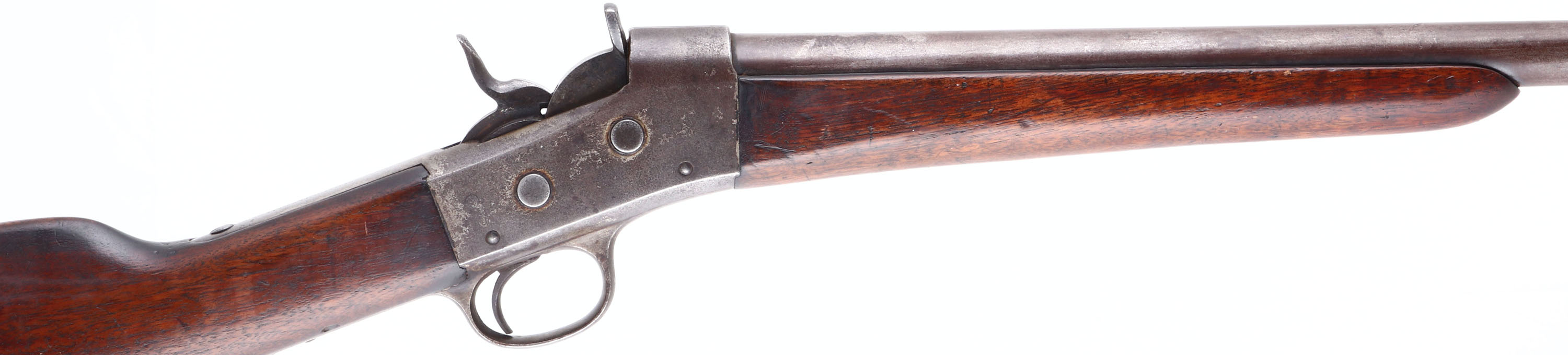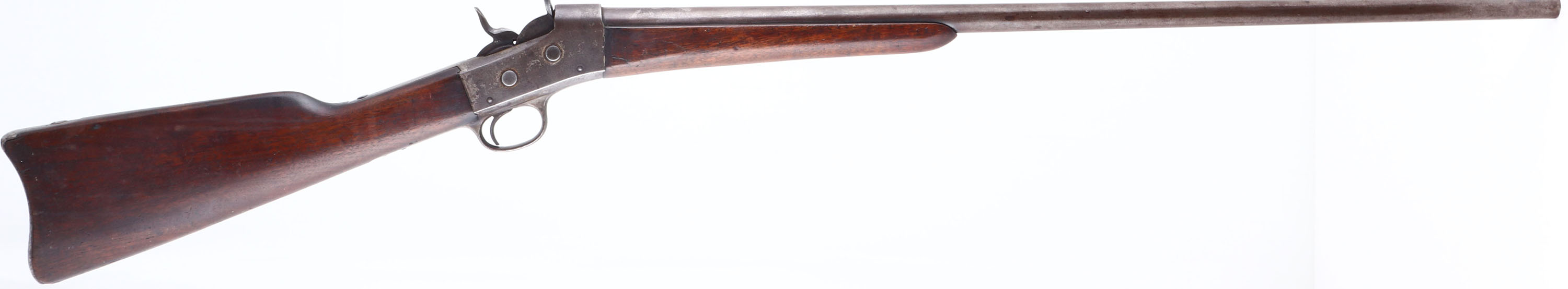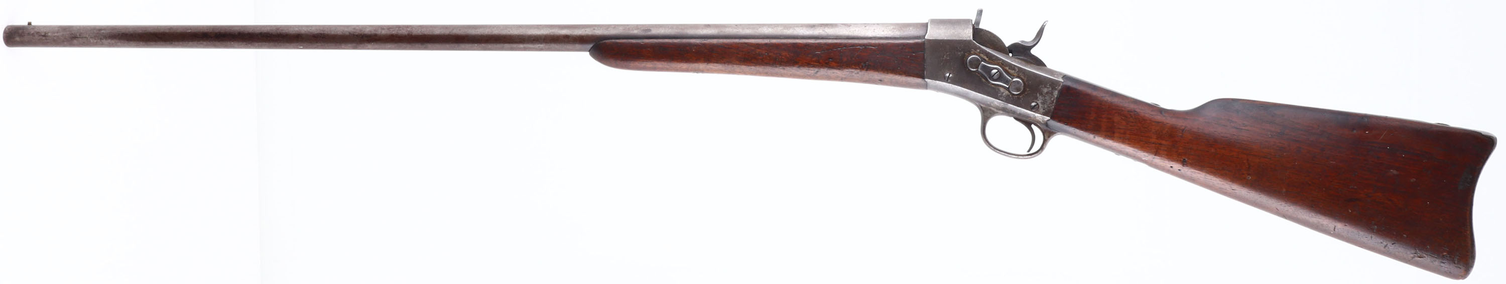 E. Remington & Sons, Rolling Block Shotgun Model No.1, CAL: 16GA Brass or 20GA Paper, MFG: 1870's - 90's, SN: N/A, Single Shot Rolling Block Rifle, 32'' barrel. These interesting shotguns were able to fire two different cartridges. There were two basic models, with Remington's usual ''No. 1'' & ''No. 2'' designations. They were made on the large rifle action with both plain & Damascus barrels of 30'' &32'' length. The No. 1 was made from 1877 to appx. 1893, when the No. 2 was advertised. Production ceased on the No.2 around the mid 1890's. The No.1: a 16 gauge shotgun chambered for interchangeable 16 Brass or 20 gauge paper shells. The No.2 was labeled as a 20 gauge shotgun, still chambered for the same 16 brass or 20 paper, but most of the parts on the No.2's were compiled from military rifle gun parts. The original straight grip wood stocks very good & solid. There are contusions, scrapes & dings amongst a few gouges. The metal finish has worn to a mix metal grey & brown patina, with remnants of blue remaining in protected areas. Bore is good, with consistent roughness & pitting. The barrel holds a single front bead. Smooth metal buttplate. Antique, No FFL Req. - Value: 300 to 700
