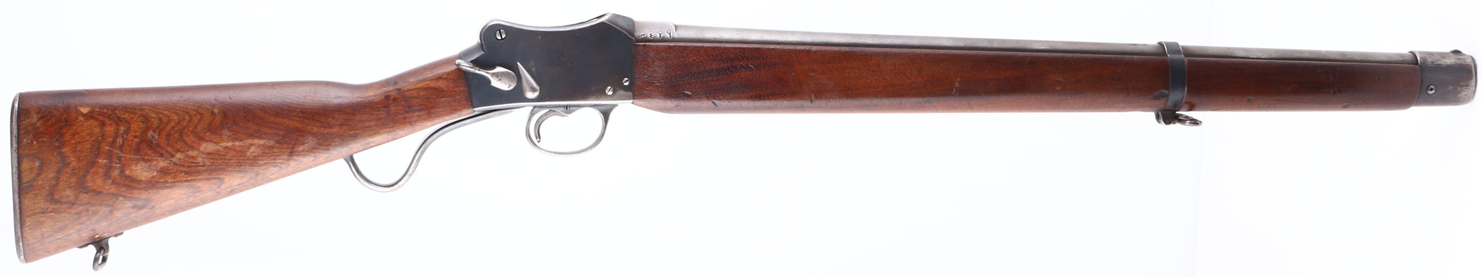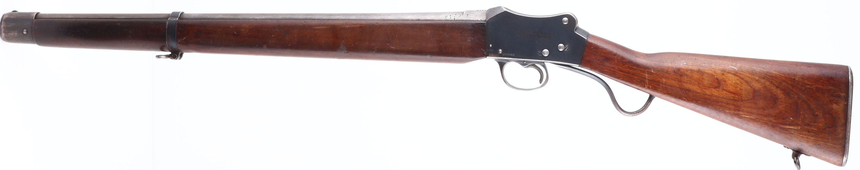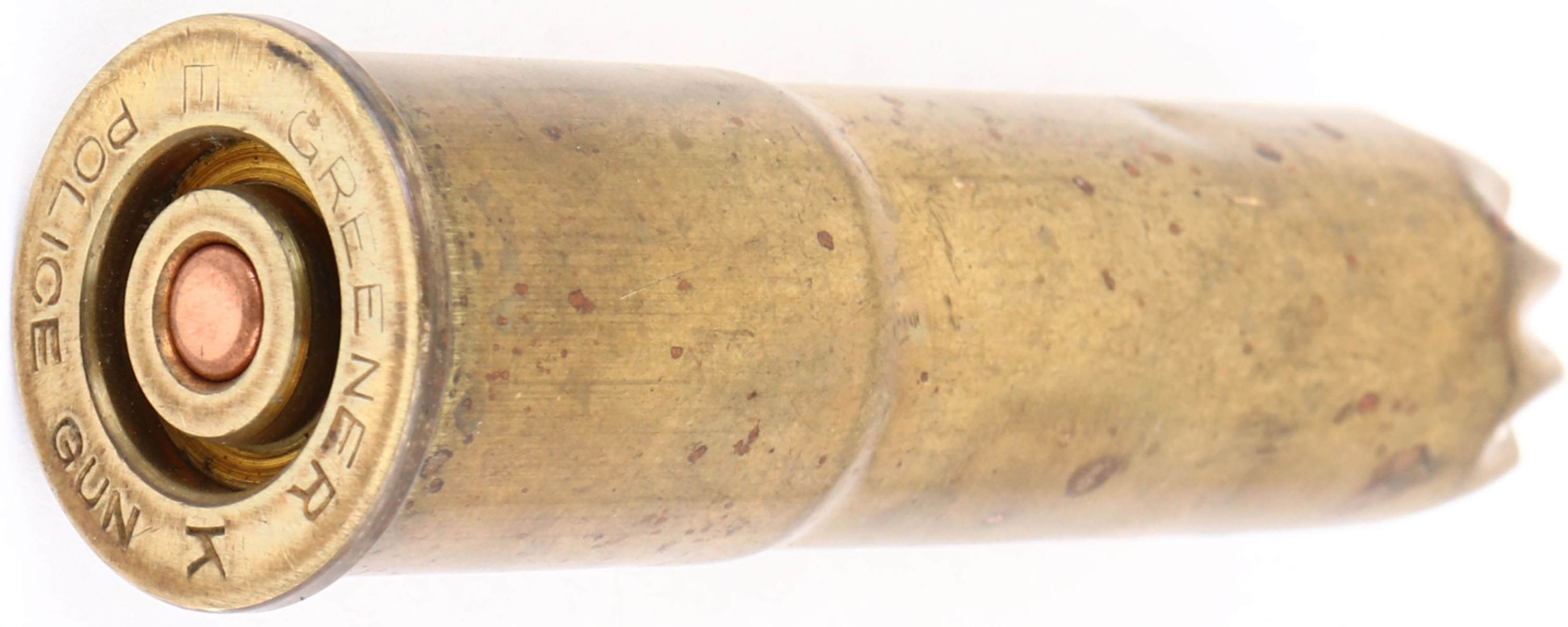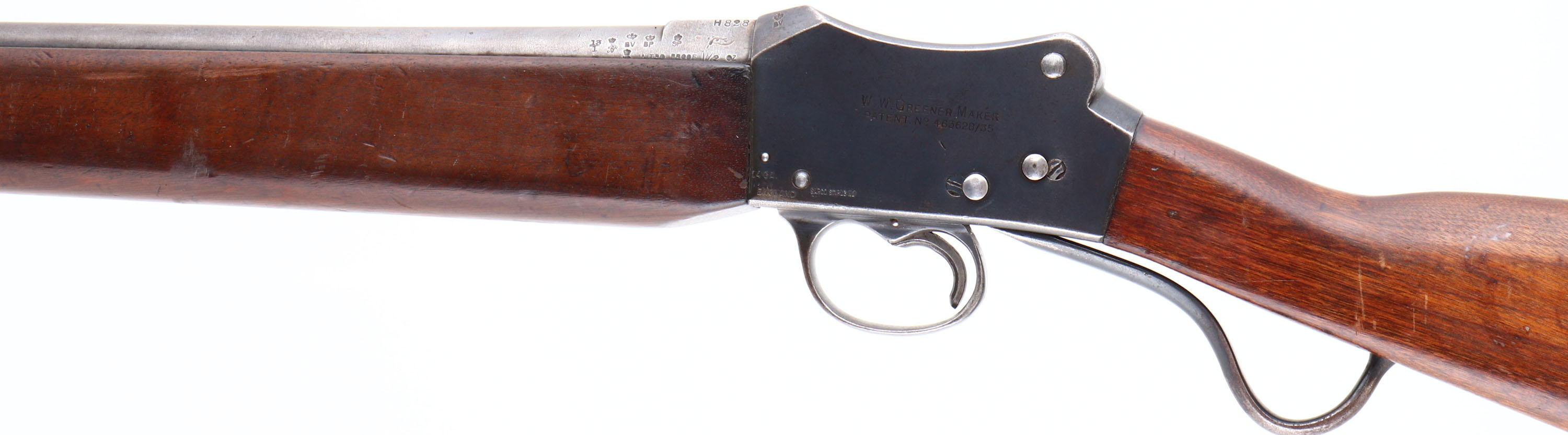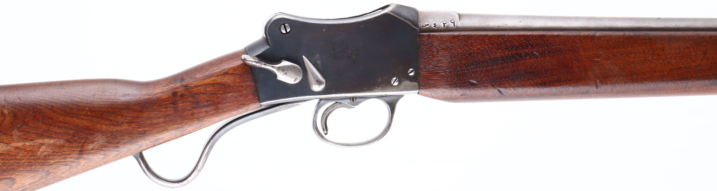 Egyptian, Greener Police Gun Mark III (Sarco Inc), CAL: 14GA Greener, MFG: 1930's, SN: 38438, Lever Action Single Shot Shotgun, 26'' barrel. At the time in Egypt, corruption was on the forefront, frequently criminals would pay policemen to ''borrow'' their guns to commit crimes. To prevent unauthorized use, the Mk III was developed. The Mk III the striker has three separate points instead of a single firing pin. The center projection was the firing pin, but in order for it to work, the two outer pins had to fit into an annular groove in the base of the 14GA Greener cartridges. This change prevented criminals from using standard ammunition in the guns. Mk III guns were produced in 14 bore that takes a special bottlenecked cartridge that had a 12 bore base, but necked down to 14 bore. All cartridges have a annular groove in the base to function in the police gun. Included in this lot is a single, unfired 14GA Greener shotgun shell. The left side of barrel is marked with many proof marks & other informational markings, the top of the barrel is marked '' GREENER MARK III''. Left side of receiver is marked in two lines '' W.W GREENER.MAKER PATENT. NO463628/35'' & the right side of receiver is marked ''EG MARK III''. The straight grip full length wood stocks are excellent. There are multiple contusions, scrapes & dings to the finish. The metal blue finish on the barrel has worn to metal grey, with a thin brown patina & the receiver rates 85%, with spotting, toned to a brown patina. Bore is very good, shows normal use. Bore is excellent. The receiver has an integrated notch that acts like a rear sight & the barrel holds a small half-moon blade front sight. Sling loops. Smooth metal trapdoor buttplate. In total, appx 37,000 guns of this type were produced. FFL or C&R Req. - Value: 400 to 800