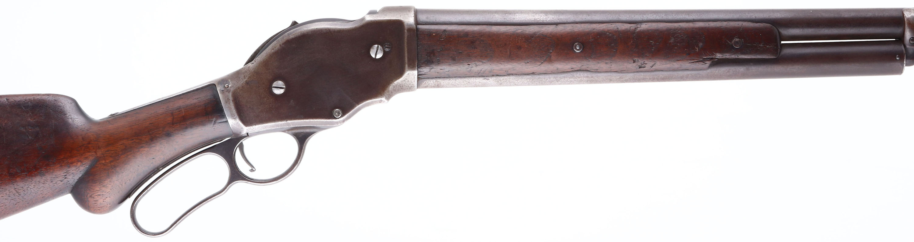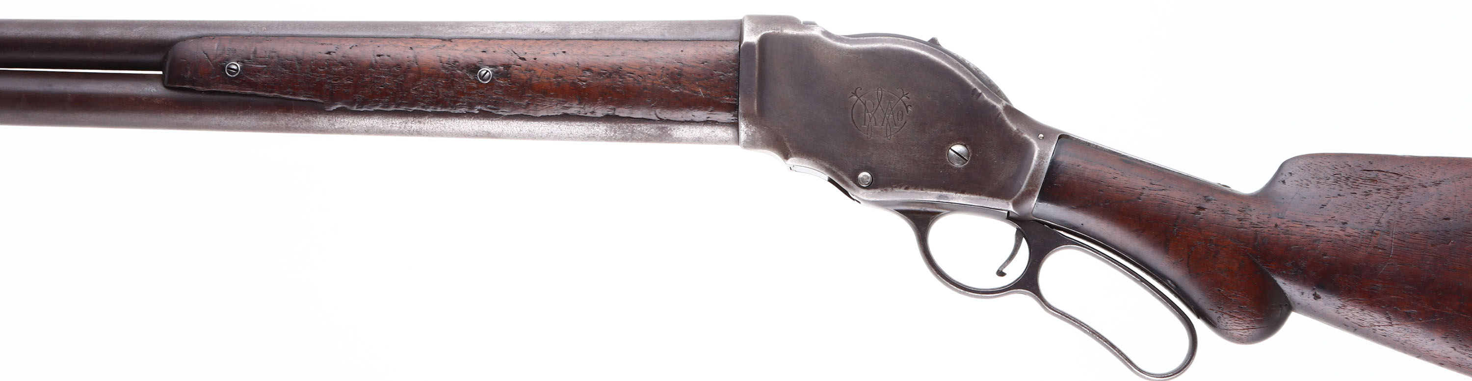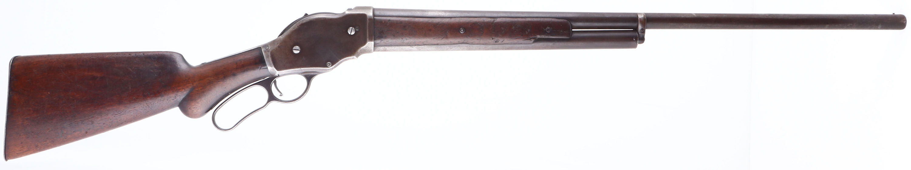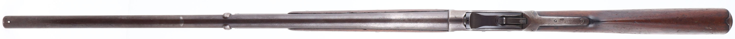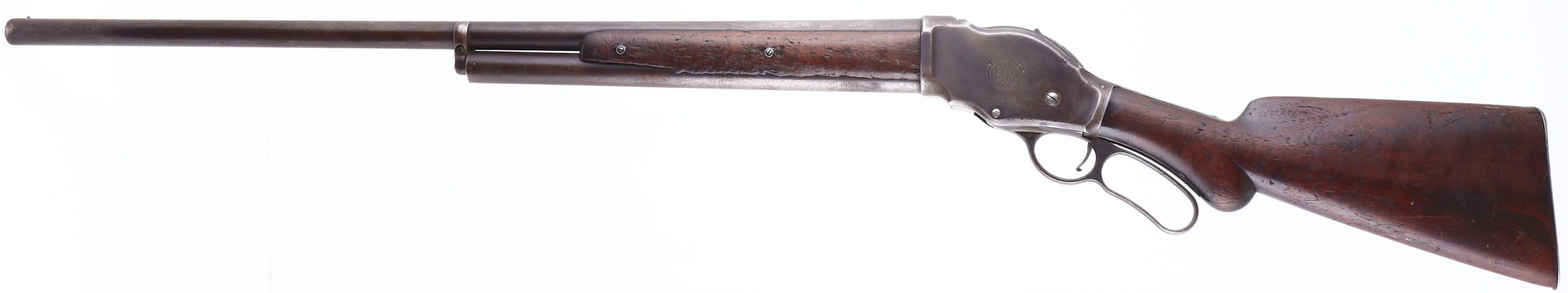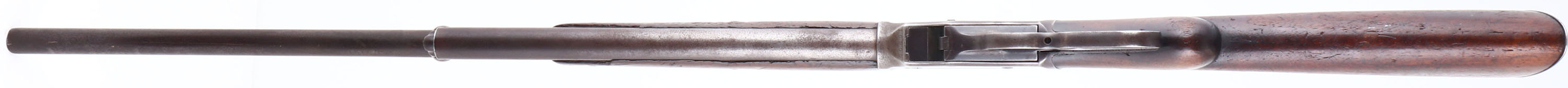 Winchester, Model 1887, CAL: 12GA, MFG: 1897, SN: 60691, Lever Action Shotgun, 30'' barrel. The original, round knob pistol grip wood stock is good. The two-piece forend is fair, heavily worn & the buttstock has been sanded & refinished, with contusions, scrapes & dings. The metal finish has toned to a mix of gun metal gray & brown patina. Bore is good, worn & with consistent roughness. The barrel holds a single front bead. Buttstock carries a worn smooth metal buttplate. An early lever repeater shotgun. Antique, No FFL Req. - Value: 400 to 800