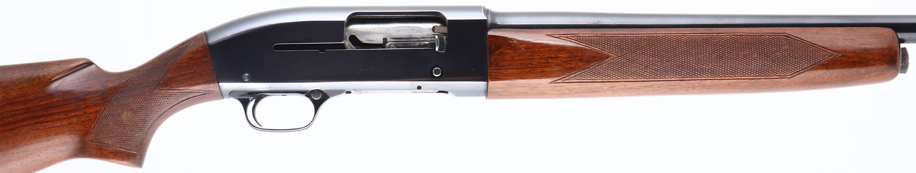 Winchester Model 50, CAL: 12 GA, MFG: 1956, SN: 59165, Semi-Auto Shotgun. Choke: F, 30'' barrel. The original checkered & flat pistol grip wood stocks are very good. They display a few minor nicks, dings & flaking to the original finish. The original metal blue finish rates 90% on barrel, 85% on receiver. Bore is very good. The barrel holds a single front bead. Buttstock carries a Winchester plastic buttplate. LOP: 14''. FFL or C&R Req. - Value: 250 to 500