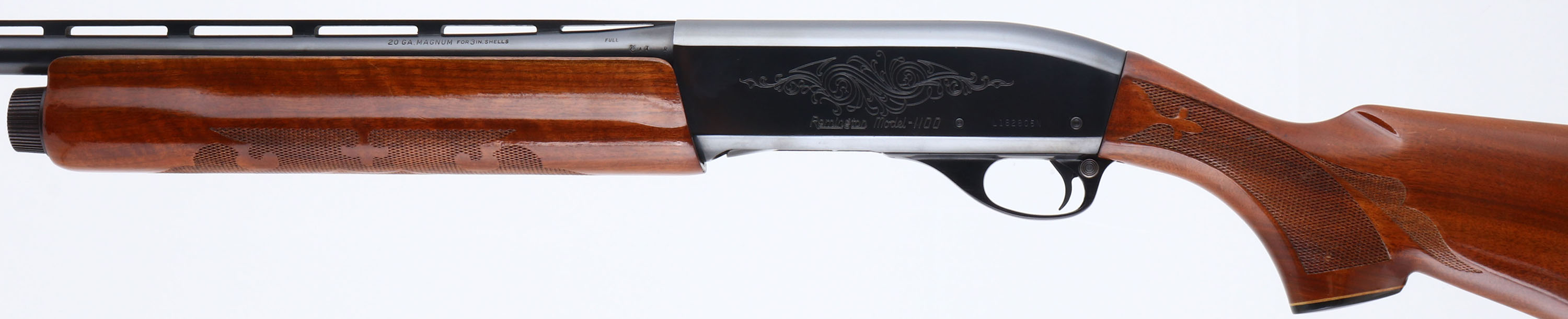 Remington, Model 1100 MAGNUM, CAL: 20 GA, MFG: 1980's, SN: L182805N, Semi Auto Shotgun, Choke: Full, 3'', 28'' Ventilated rib barrel. The original checkered & capped pistol grip wood stocks are excellent, displaying few light handling marks to the original finish. The metal blue finish rates 98% overall, with a couple minor blemishes on the top of rib. Bore is excellent & bright. The rib holds a single front bead. Buttstock carries a Remington ventilated recoil pad. A high condition Magnum shotgun in a popular gauge for upland birds. FFL Req. - Value: 600 to 1200