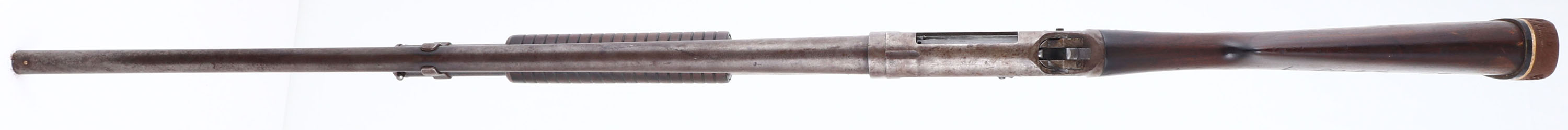 Winchester, Model 1897 Take-Down, CAL: 16 GA, MFG: 1907, SN: 363522, Pump Action Shotgun, Choke: Full, 28'' barrel. The original pistol grip stock & corncob forend are good & solid. The stocks have small scrapes, gouges & contusions to the thinning original finish. The stock has two 1'' stress cracks at the wrist & a couple of 2'' cracks at the buttend.. The left side of the stock ha ''L20452789'' carved into it. The metal finish has worn to a mix of gun metal gray & a rust brown patina, with spotting & light pitting. Bore is fair, with large spots of rust pitting. Barrel holds a single front bead. Stock carries a poor fitting ventilated recoil pad, which is loose. FFL or C&R Req. - Value: 200 to 400