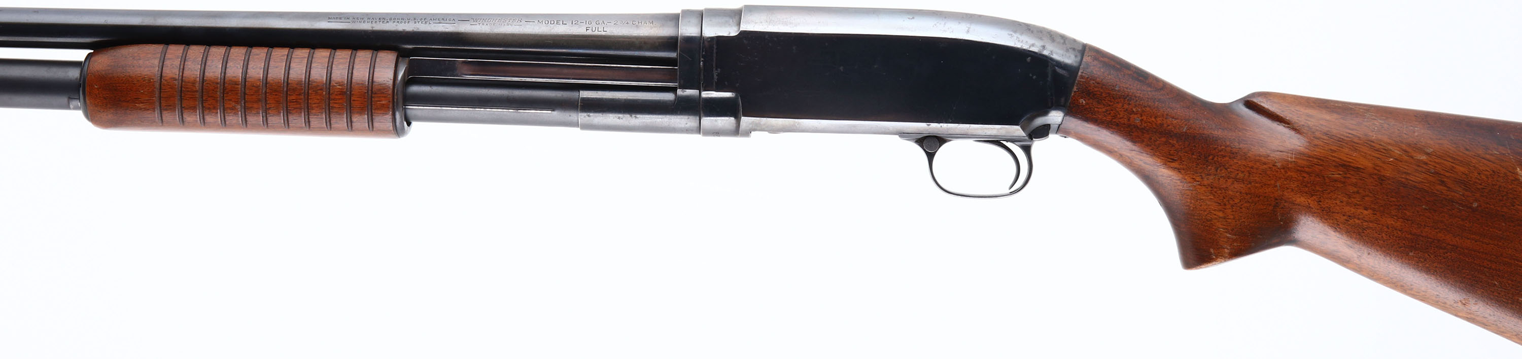 Winchester, Model 12, CAL: 16 GA, MFG: 1942, SN: 1056822, Pump Action Shotgun, Choke: Full, 30'''. The original flat pistol grip wood stock & short corncob forend are excellent, displaying small contusions, scratches & scrapes to the original finish. The original metal blue finish rates 80% overall, with spotty finish loss & some light rust pitting. Bore is very good. Single front bead. Buttstock carries a Winchester buttplate. FFL or C&R Req. - Value: 400 to 800