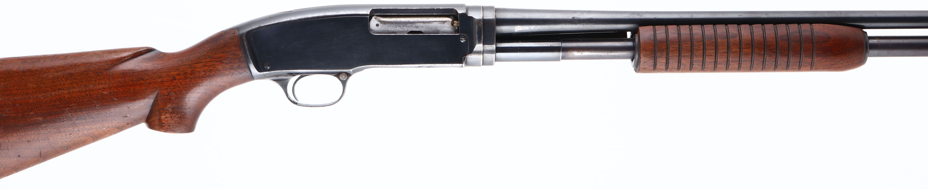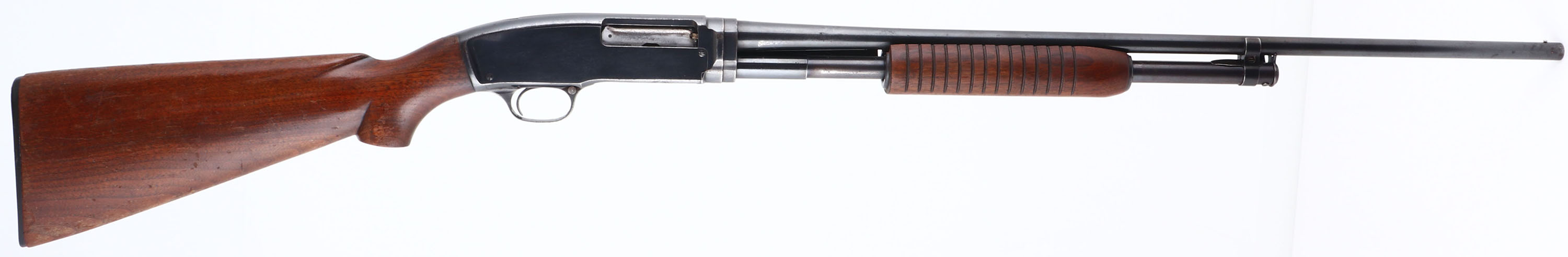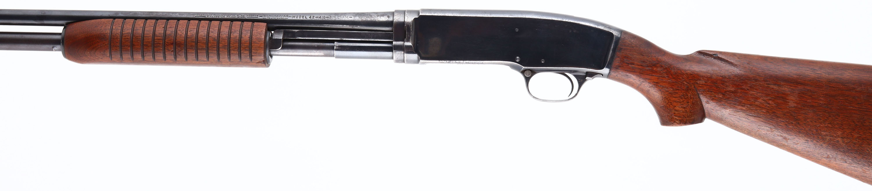 Winchester, Model 42, 410 GA., MFG. 1950, SN:90919, Pump action, 3'', MOD Choke, 26'' No rib barrel. The original flat pistol grip stocks are very good. They carry a few minor finish level blemishes, rubs & contusions, along with thinning & flaking of the original factory finish. The original metal blue finish rates 85% overall. Bore is excellent. Single front bead. Winchester buttplate. An overall very nice & original .410. FFL or C&R Req. - Value: 1000 to 2000