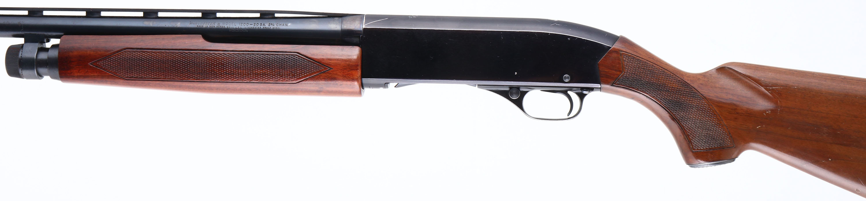 Winchester, Model 1200, CAL: 20 GA, MFG: 1964-82, SN: L1257637, Pump Action Shotgun, IMP CYL Winchester Screw-in Choke, 28'' Ventilated barrel. The Winchester Model 1200 was introduced in 1964 as a low-cost replacement for the venerable Model 12 & was just the second shotgun to utilize a rotary bolt, with four locking lugs secured within the barrel extension. It was Winchester's first shotgun to incorporate the company's patented WinChoke system, a quick change tube to allow the easy replacement of chokes. The original checkered & capped pistol grip wood stocks are excellent, however there are numerous contusions, scrapes & flaking to the original finish. The original metal blue/black finishes on the barrel & alloy receiver rate 80% overall, with spotty rust pitting on the barrel. Bore is excellent. Single front bead. Buttstock carries a Winchester buttplate. FFL Req. - Value: 250 to 500