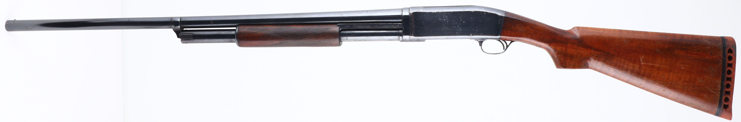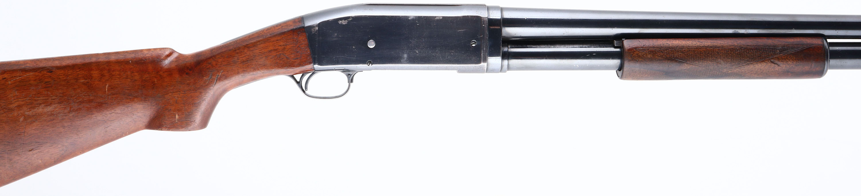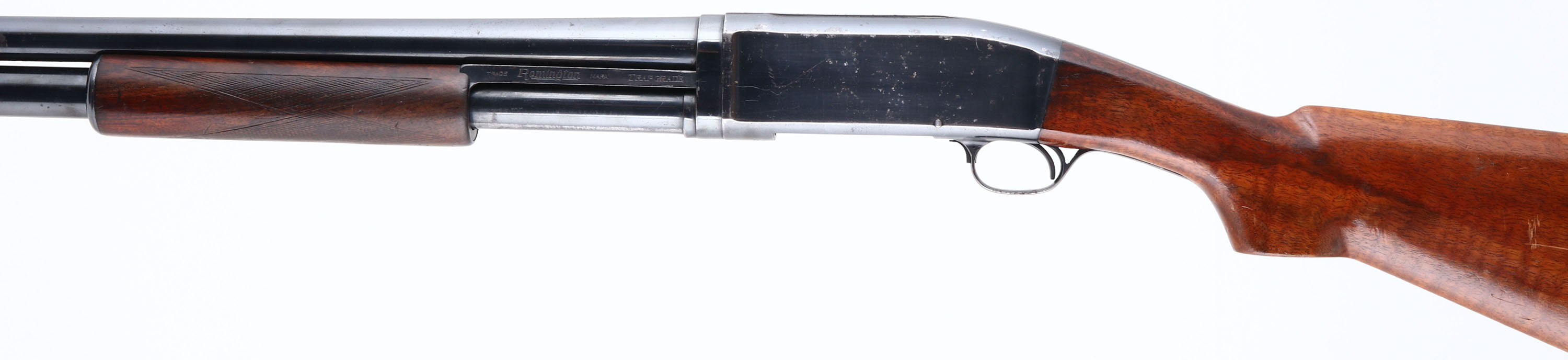 Remington, Pre Model 10 Trap Grade, CAL: 12 GA, MFG: 1908, SN: 7962, Pump Action Shotgun, Choke: Full, 30'' No rib barrel. The flat pistol grip wood stock appears to be an accurate & vintage replacement, with a perfect fit. The checkered forearm appears original. Both are very good & solid, showing lots of wear & thinning to the finishes. There are small scratches & contusions. The metal blue finish rates 80% on barrel, 70% on the receiver, with speckled rust pitting, mostly on the receiver. Bore is very good. The barrel holds a front bead. Stock carries a vintage Red Head ventilated recoil pad. Pump action functions properly, but trigger doesn't appear to engage & will not fire. This gun needs to be repaired & is being sold ''AS IS'', with no returns. FFL or C&R Req. - Value: 200 to 400