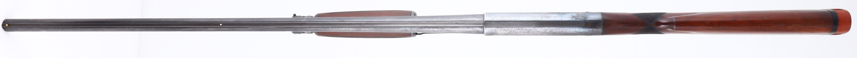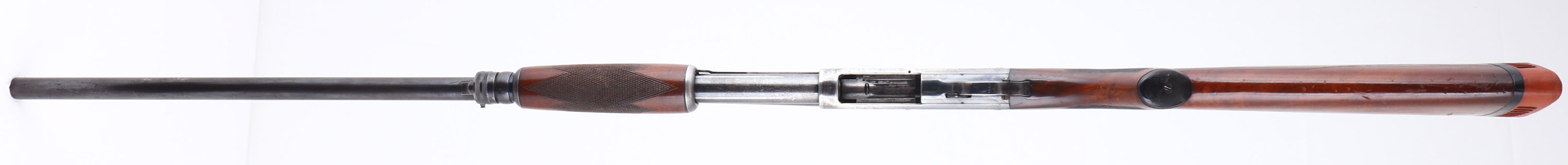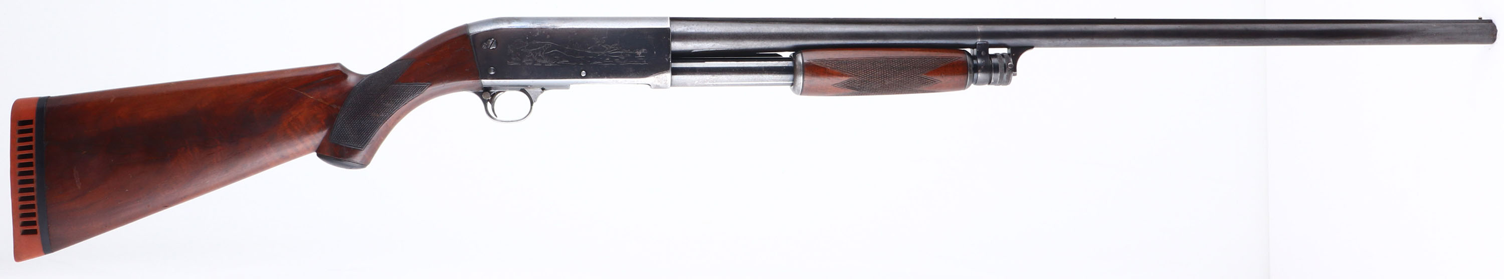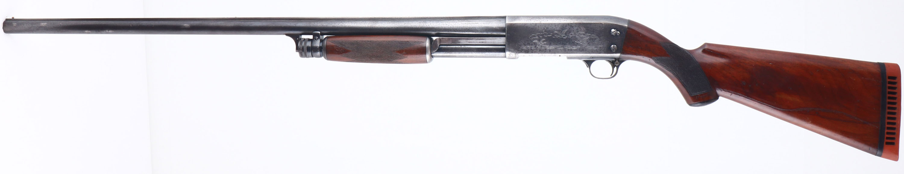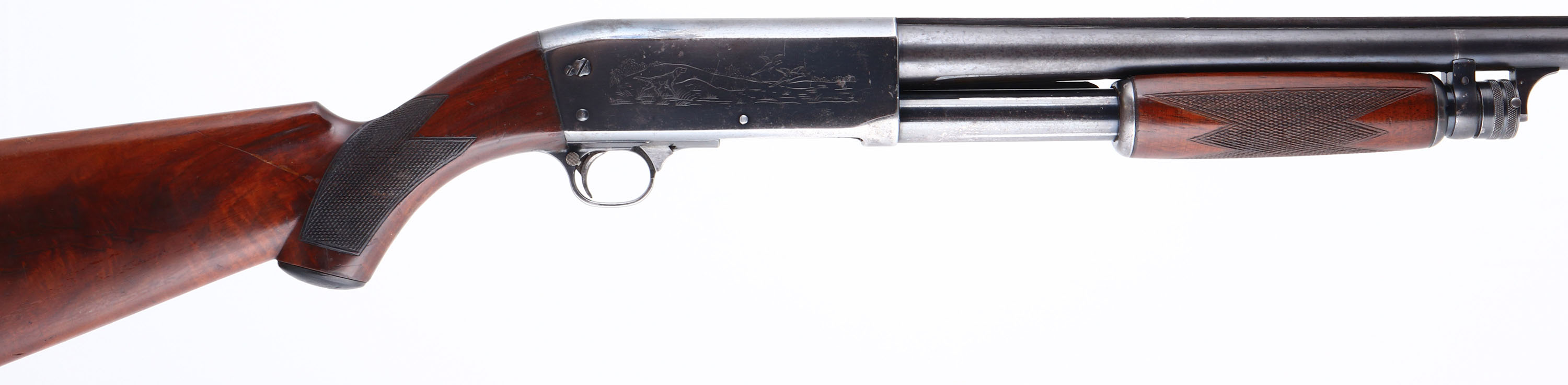 Ithaca, Model 37R (Solid Rib), CAL: 12 GA, MFG: 1940, SN: 29389, Pump Action Shotgun, Choke: Full, 2 3/4'', 30'' barrel. The original checkered & capped pistol grip wood stocks are very good. They carry the original finish with several scrapes, scratches & dings, & one large finish scrape to the left side which runs the length of the stock. The original metal blue finish rates 60% overall, with some spotting & speckled loss. Receiver has hunting scenes on each side. Bore is excellent. The solid rib barrel holds an ivory mid bead & a gold tone front bead. Buttstock carries a period Hawkins ventilated recoil pad. FFL or C&R Req. - Value: 500 to 800
