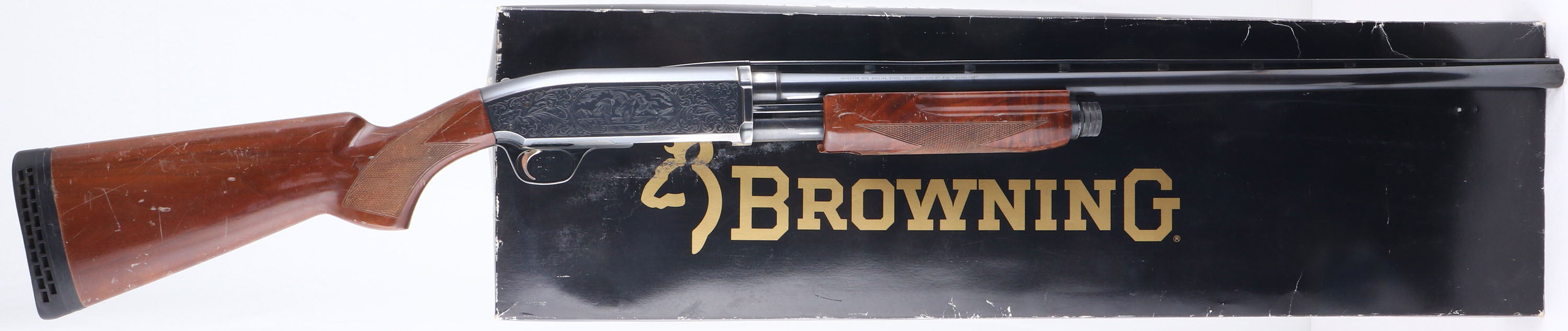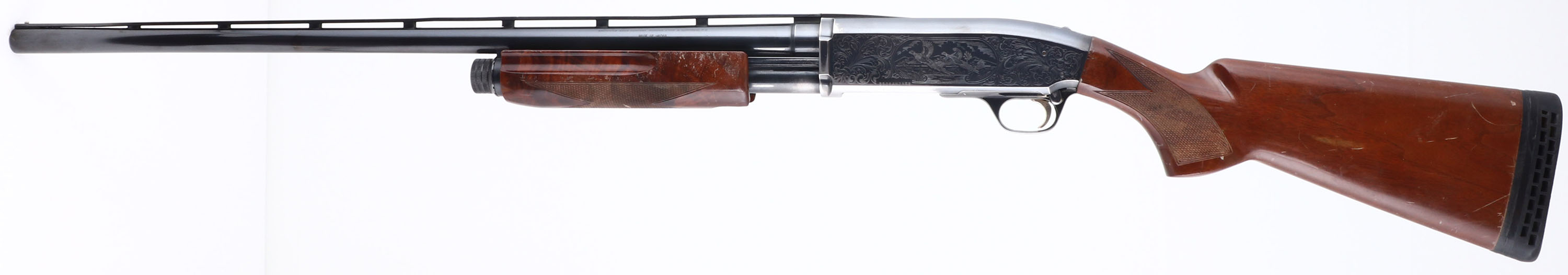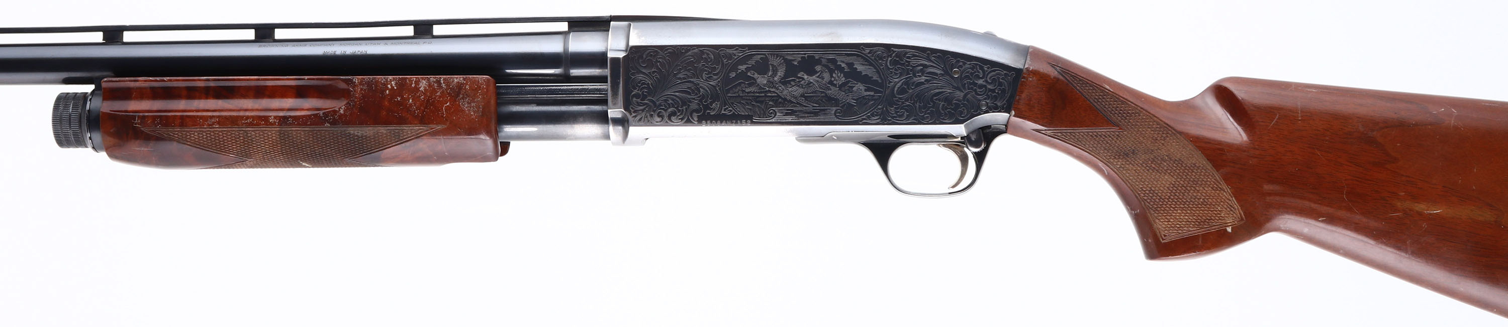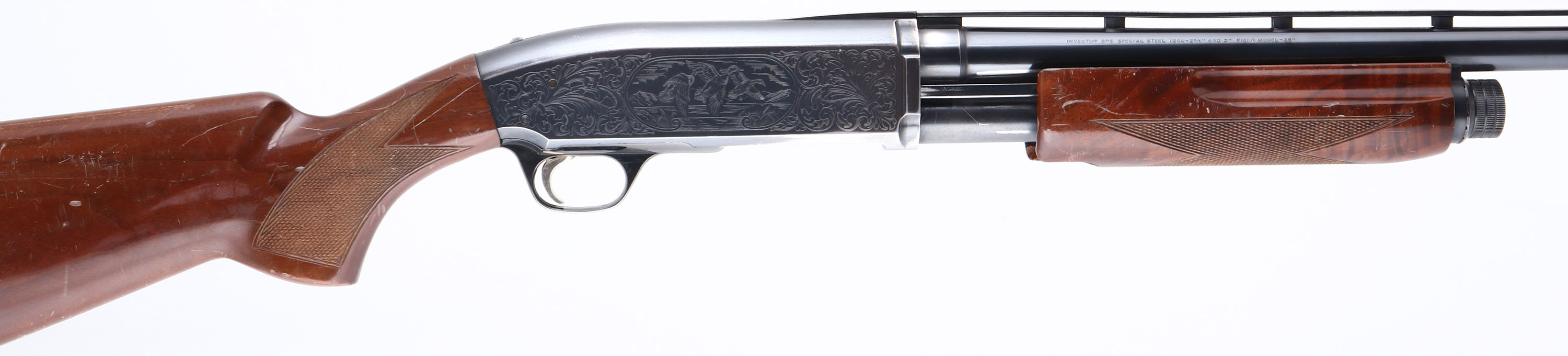 Browning, Model BPS Field Model 1 Hunter, CAL: 12 GA, MFG: 1991, SN:25084NZ152, Pump Action Shotgun, 3'' MAG, Choke: Invector tubes, 28'' Ventilated rib barrel. The checkered & flat pistol grip wood stocks are good & solid, but display numerous scrapes, scratches & dings to the original finish. The metal blue finish rates 90% on barrel, 80% on the receiver. The receiver is nicely engraved with vignettes of pheasants & ducks amongst scroll work. Bore is excellent. The ventilated rib has one loose post & holds a single front bead. Buttstock carries a Uncle Mikes ventilated recoil pad. Serrated slide release is located at the rear of the trigger guard. Bottom ejection throws empty hulls downward. Ambidextrous top-tang safety switch. Gold tone trigger. Comes with its original box, with two additional chokes & tool. FFL Req. - Value: 300 to 500