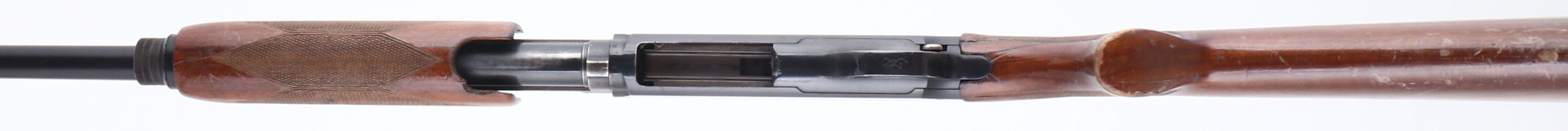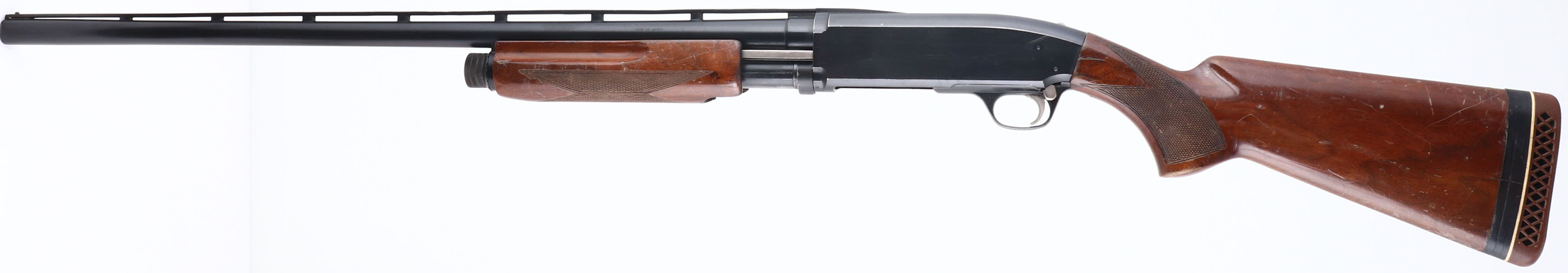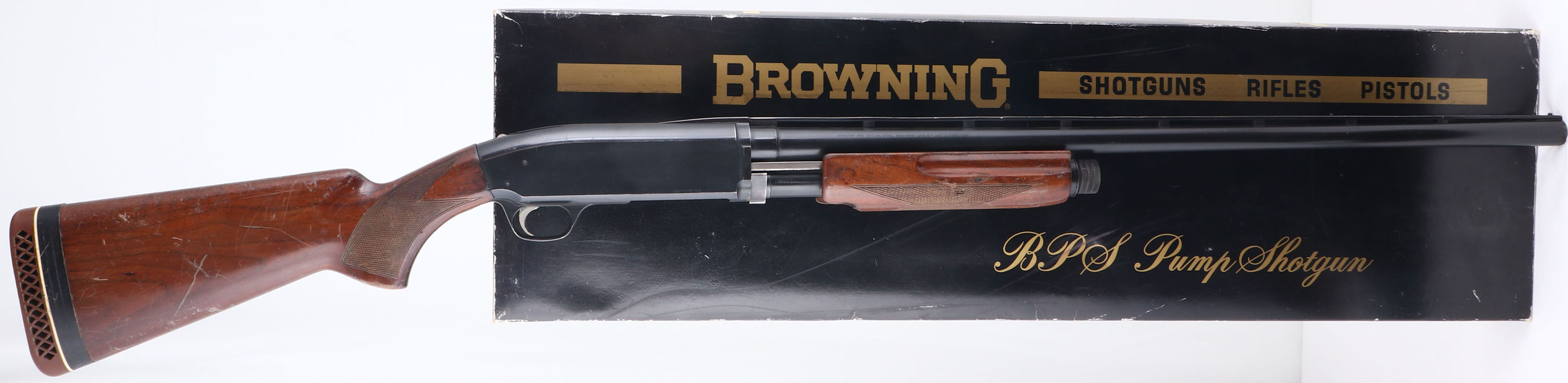 Browning, Model BPS Field Hunter, CAL: 12 GA, MFG: 1984, SN:03471PW152, Pump Action Shotgun, 3'' MAG, Choke: Invector tubes, 28'' Ventilated rib barrel. The checkered & flat pistol grip wood stocks are good & solid, but display numerous scrapes, scratches & dings to the original finish. The metal blue finish rates 95% on barrel, 90% on the receiver. Has ''S'' single shot & ''R'' repeater ring selector feature on the rear of the mag tube, which was discontinued in later models. Bore is excellent. The ventilated rib has a couple of dings & nicks, & holds a single front bead. Buttstock carries a Pachmayr White Line ventilated recoil pad, with spacers, 14.5'' LOP over pad. Serrated slide release is located at the rear of the trigger guard. Bottom ejection throws empty hulls downward. Ambidextrous top-tang safety switch. Gold tone trigger has faded. Comes with its original box, with an additional choke & tool. FFL Req. - Value: 300 to 600