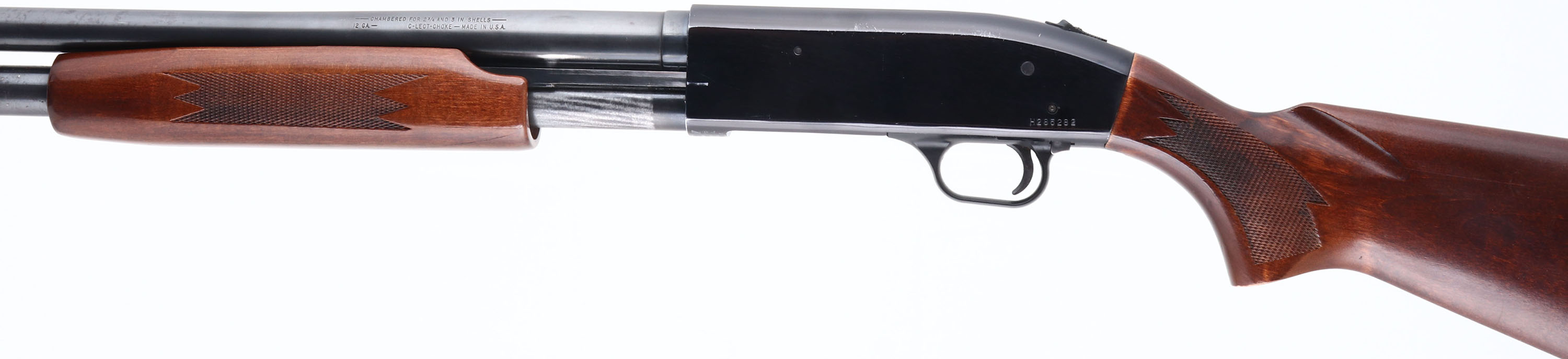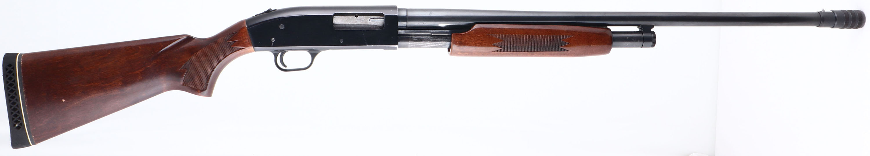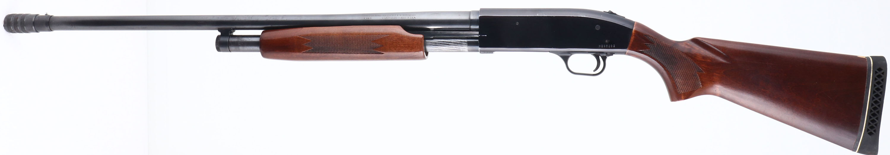 New Haven by Mossberg, Model 600AT, CAL: 12 GA, MFG: 1977-98, SN: H285282, Pump Action Shotgun, 2 3/4'' or 3'', Adjustable Choke, 28'' Ventilated rib barrel, with choke. New Haven is one of O.F. Mossberg & Sons' private, promotional brands. The New Haven 600 is identical to the Mossberg 500 from O.F. Mossberg & Sons, with the addition of an anti-rattle system in the magazine tube. This 600AT model came with the adjustable C-Lect Chokes. The original checkered & flat pistol grip wood stocks are excellent, with some small handling marks to the otherwise excellent original finish. The original metal blue finish on barrel & black anodized finish on the receiver both rate 90% overall, with loss due to edge wear, light scratches & the pump action. Bore is very good. The barrel holds a front bead. Stock carries a Pachmayr White Line ventilated recoil pad. FFL Req. - Value: 200 to 400