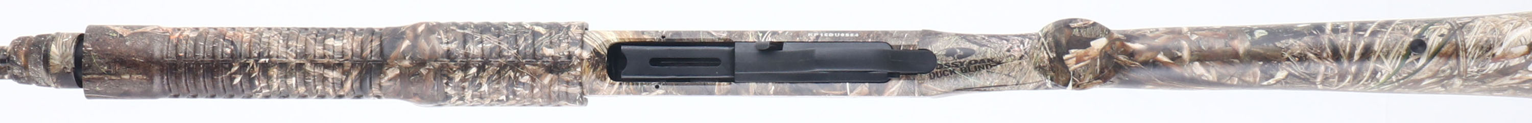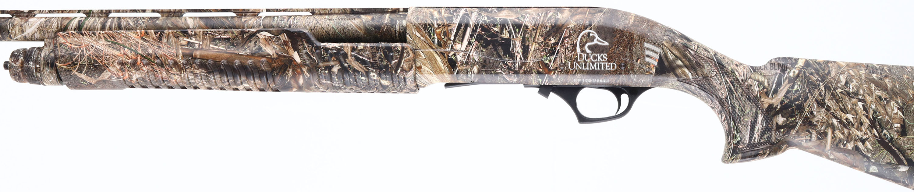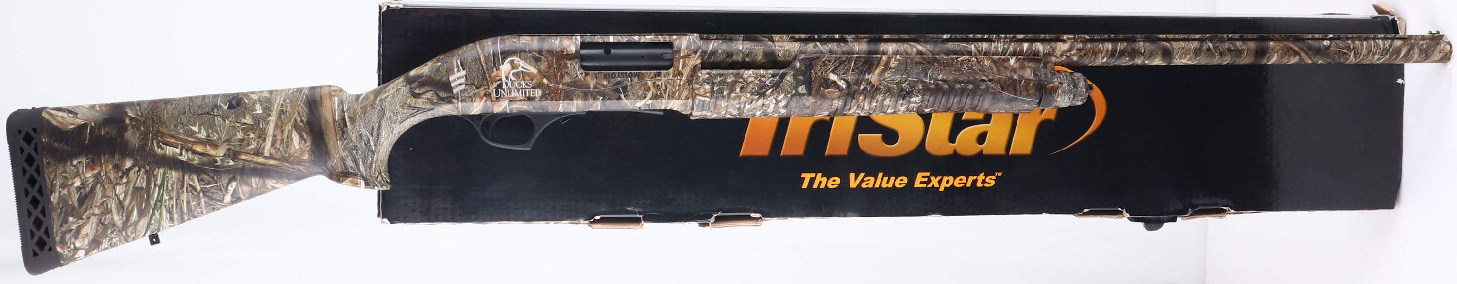 BOXED TriStar, Model Cobra, Ducks Unlimited CAL: 12 GA, MFG: Modern, SN: KP15DU0284, Pump Action Shotgun, Screw-in chokes, 28'' Ventilated barrel. The original flat pistol grip checkered & grooved forend synthetic stocks are excellent. The entire gun is covered in Mossy Oak Duck Blind camo pattern, which is excellent. The same camo finish on the barrel & receiver is excellent. The ventilated rib holds a green fiber-optic front sight. Buttstock carries a ventilated recoil pad. Integral sling provisions. Comes in its original box, with owners manual & choke tube case holding two extra chokes & tool. FFL Req. - Value: 300 to 500