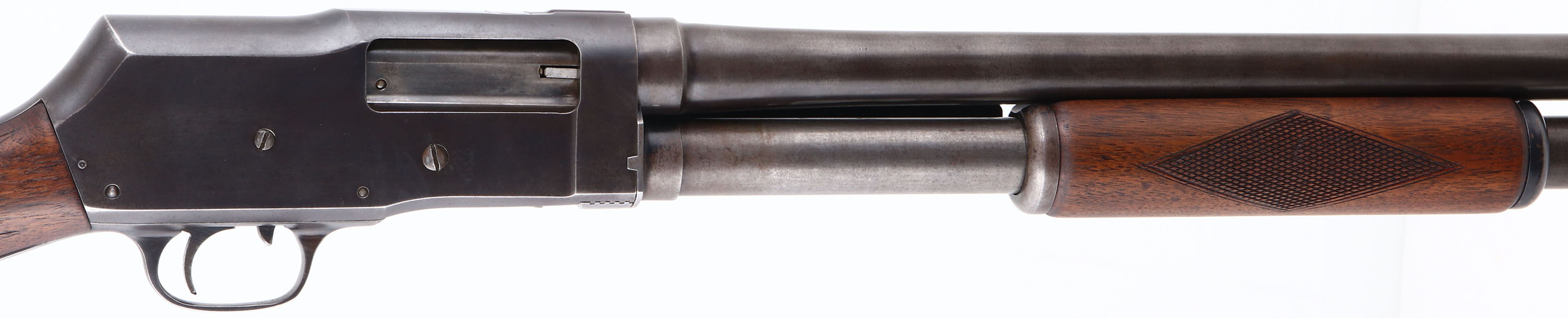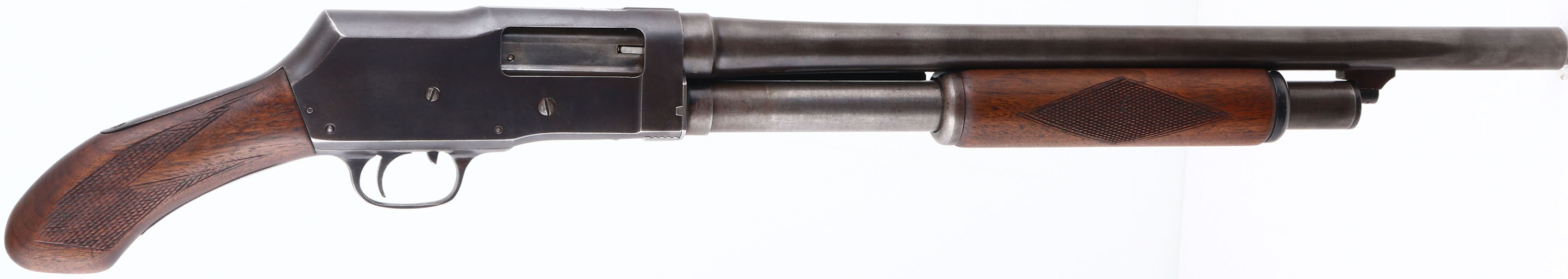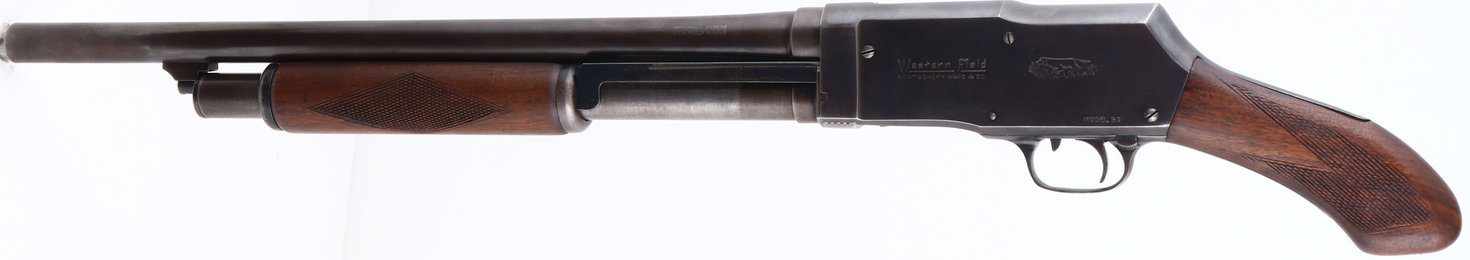Wards Western Field, Model 30, CAL: 12 GA, MFG: 1940's, SN: U24230, Pump Action Shotgun, 19'' Chopped barrel. The original checkered & pistol grip wood stocks have been chopped, nicely reshaped, sanded & refinished, rating as excellent. There are very few contusions or handling marks remaining. The metal blue finish on the barrel & mag has worn mostly gun metal gray, with a thin brown patina, while the finish has grayed & rates 50% on the receiver. Bore is excellent. No front bead. Overall length is 30 1/2''. FFL or C&R Req. - Value: 200 to 400