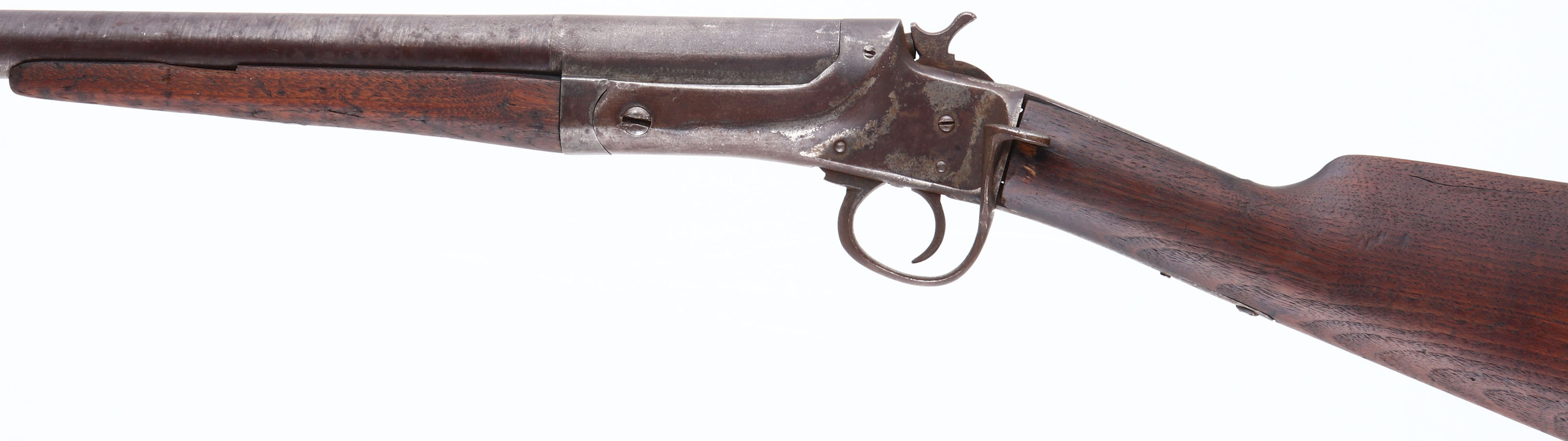 C.S Shattuck, American Side Snap, CAL: 14GA, MFG: 1880-90, SN: 1844, Side Lever Break Action Single Shot Shotgun, 30 1/8'' barrel. The straight grip wood stock & small forend are good. There are edge chips on both stocks, a small hairline crack at the top of the wrist & other contusions, scrapes & dings. The metal finish has toned to a brown patina, with metal grey undertones. Bore is fair, with consistent roughness & pitting. The barrel holds a single front bead. Smooth metal buttplate. Antique, No FFL Req. - Value: 100 to 200
