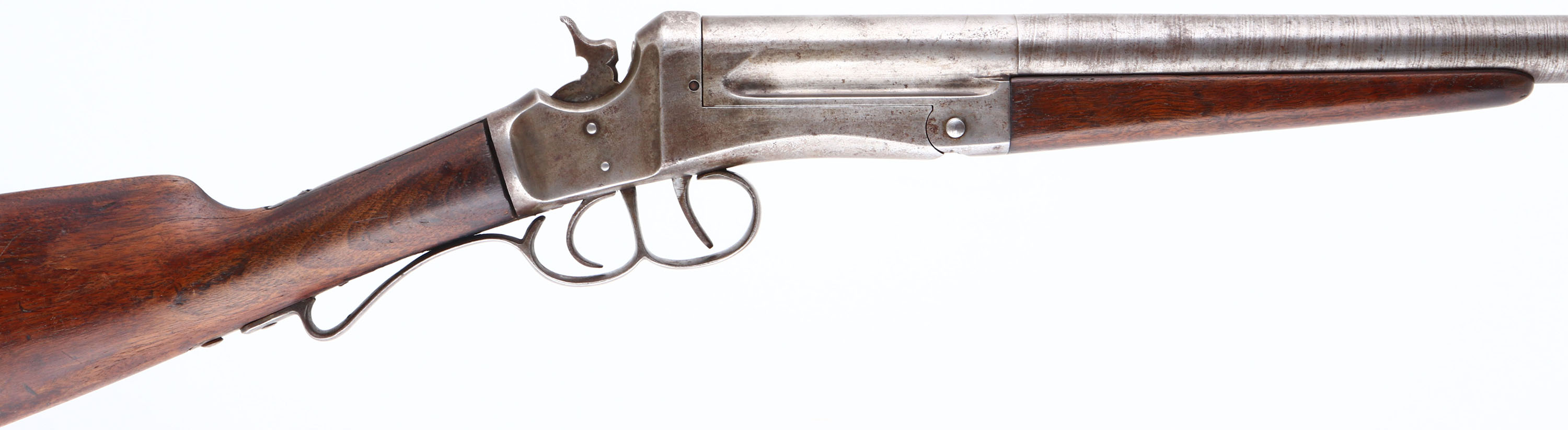 C.S Shattuck, American, CAL: 12 GA, MFG: 1870's to 1910's, SN: 2258, Triggered Break Action Single Shot Shotgun, 34'' barrel. The straight grip wood stock & small forend are very good. There are contusions, scrapes & dings throughout, with oils added over time. The twisted steel pattern on the barrel is visible, mostly worn to metal grey, with areas toned to a brown patina. The receiver has worn to metal grey, with a thin brown patina. Bore is very good, with roughness & light pitting. The barrel holds a single front bead. Smooth metal buttplate. FFL or C&R Req. - Value: 100 to 300