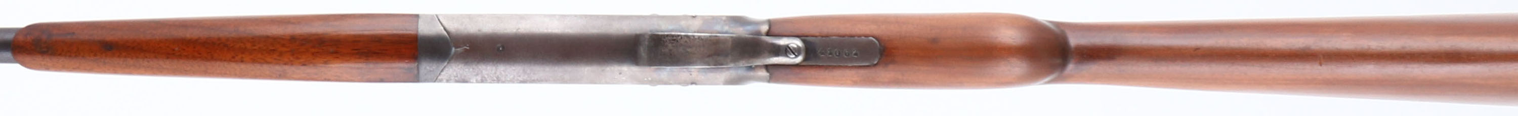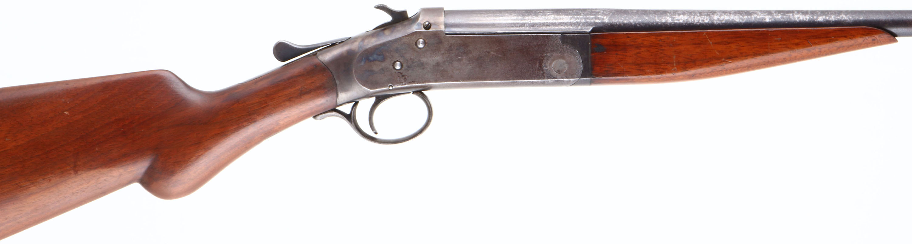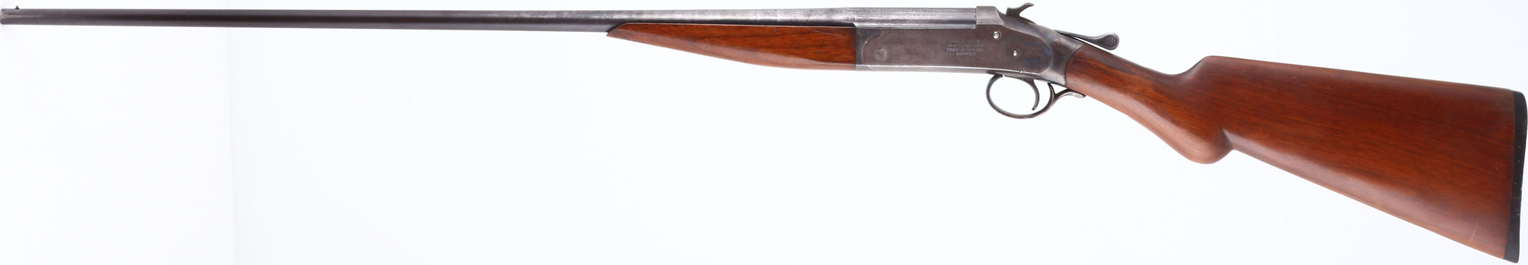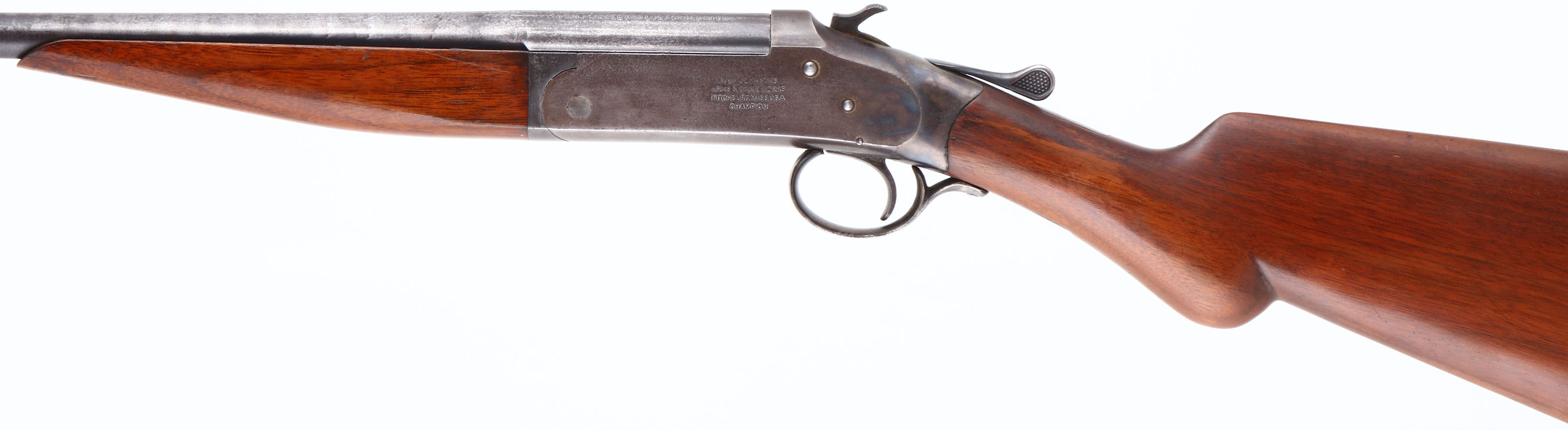 Iver Johnson, Model ''Champion'', CAL: 44, MFG: 1891-1919, SN: 42062, Break Action Single Shot Shotgun, 30'' barrel. The original & refinished round knob pistol grip wood stocks are excellent. There are minor contusions & scrapes to the finish. The metal blue finish on the barrel has worn to a mix of remaining original blue, metal grey & spotting toned to a brown patina. The receiver is case-hardened, worn to metal grey & toned to a brown patina, with faint case-colors remaining. Bore is excellent & bright. The barrel carries a single front bead. I.J grooved plastic buttplate. This shotgun was originally made for 44cal shotshells that were produced during the era. These guns were considered versatile game guns for use on the frontier. FFL or C&R Req. - Value: 150 to 350