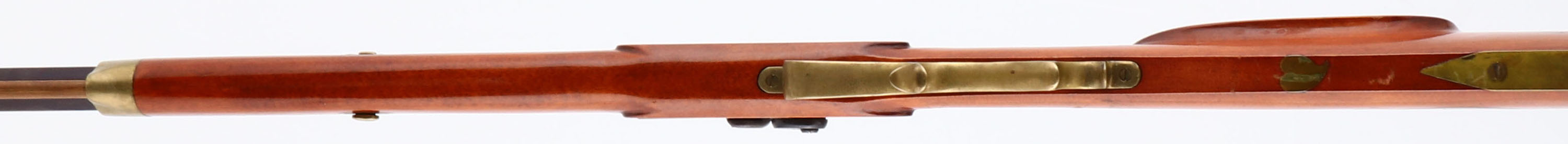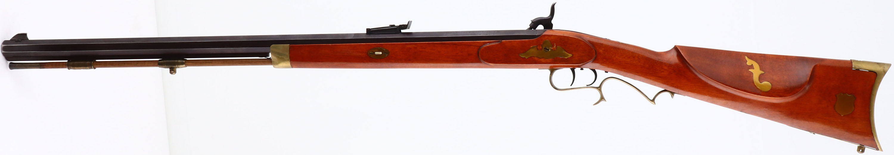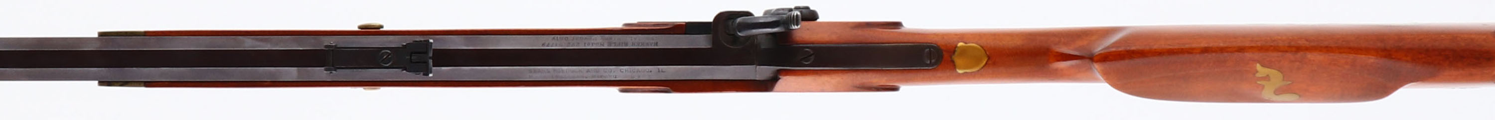 Sears, Hawken Rifle Model 292.51779, CAL: 50, MFG: N/A, SN: 0781, Black Powder Muzzleloader, 28'' octagon barrel. The cheeked straight grip wood stock is excellent. There are minor handling marks to the high gloss finish. The metal blue finish on the barrel rates 85%, toned to a brown/plum patina. The receiver rates 95%, with gold tone engravings. Bore is excellent. The barrel holds an adjustable rear sight & blade front sight. Brass crescent metal buttplate. All brass hardware. Sling studs. Cleaning rod present. Black powder, No FFL Req. - Value: 150 to 350
