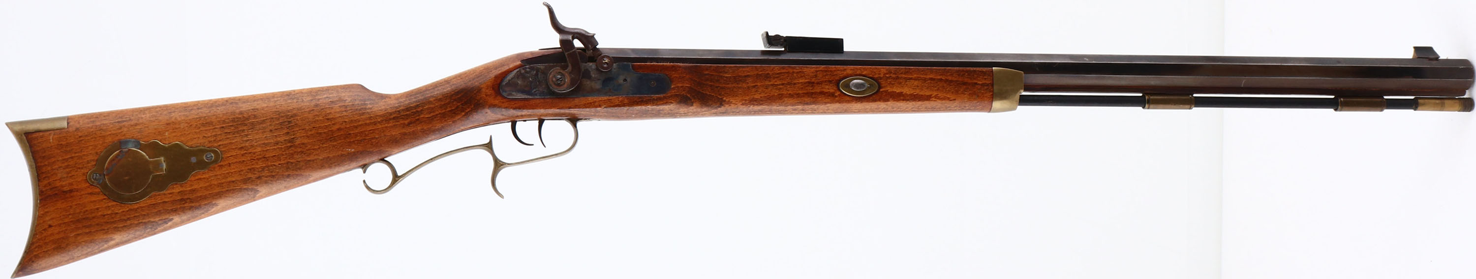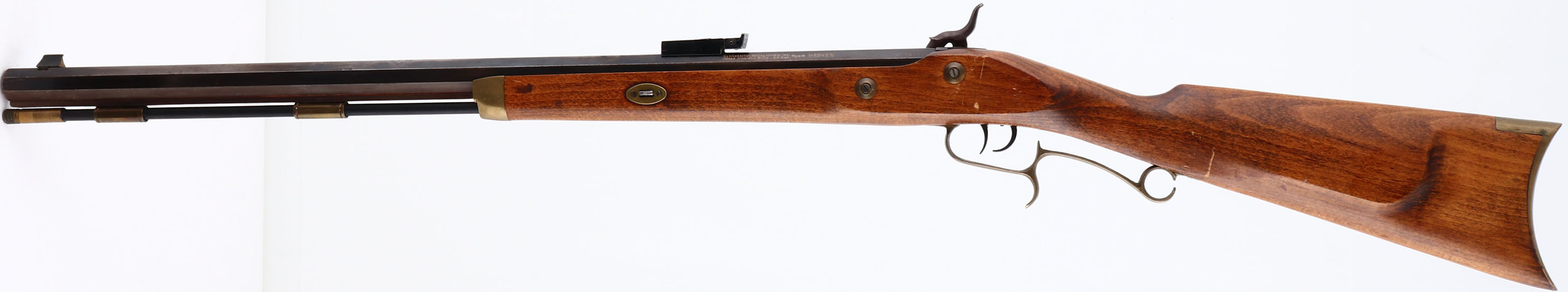 Connecticut Valley Arms, Hawken Rifle, CAL: 50, MFG: N/A, SN: 553995, Black Powder Muzzleloader, 28'' octagon barrel. The refinished, cheeked straight grip wood stock is excellent. There are minor scrapes & handling marks. The metal finish on the barrel is a mix of original blue, applied blue, brown patina & areas worn to metal grey. Bore is poor, dark & rough. The barrel holds an adjustable rear sight & large blade front sight. Crescent brass buttplate. Brass hardware. Cleaning rod present. Black Powder, No FFL Req. - Value: 100 to 300